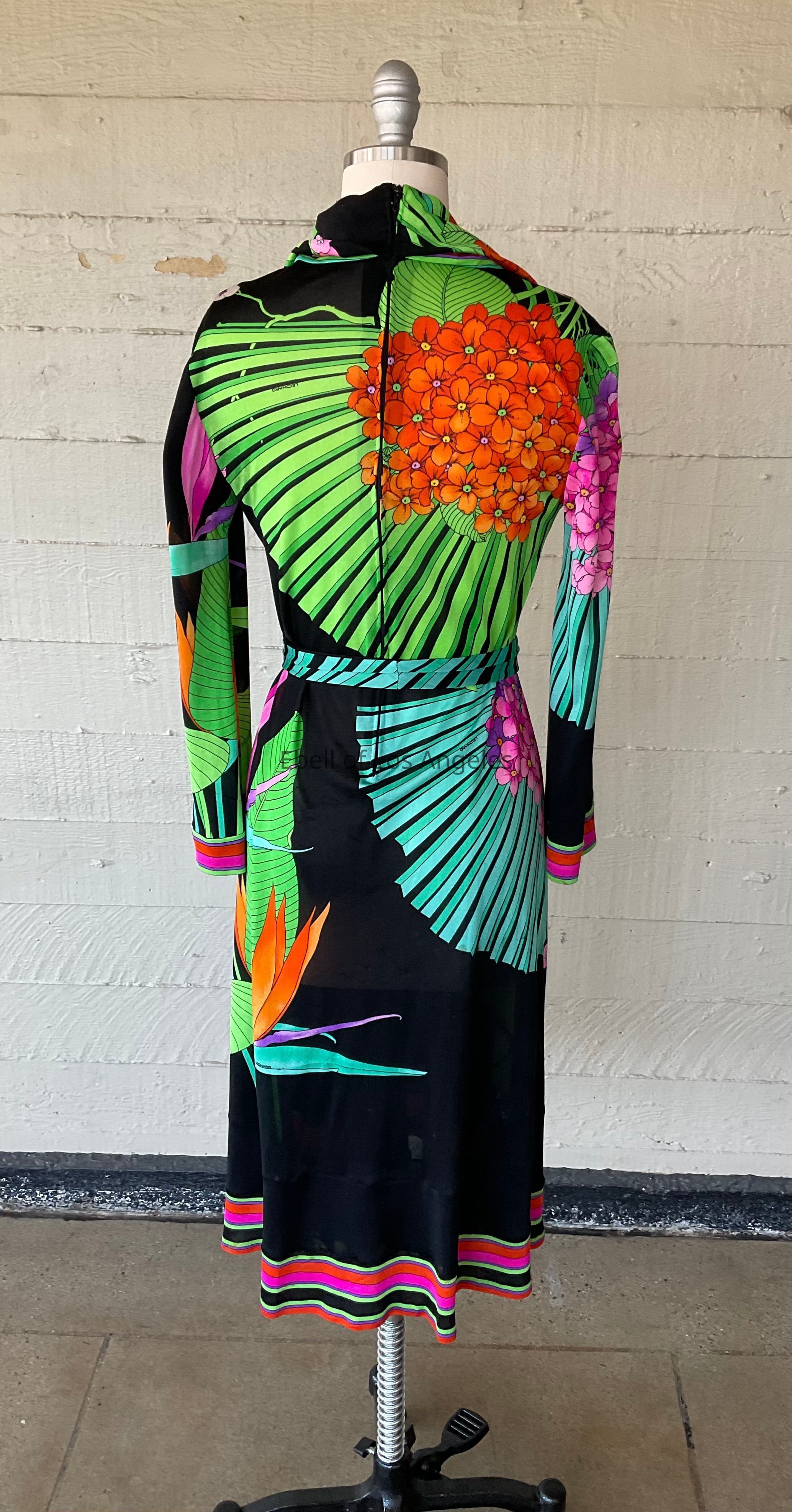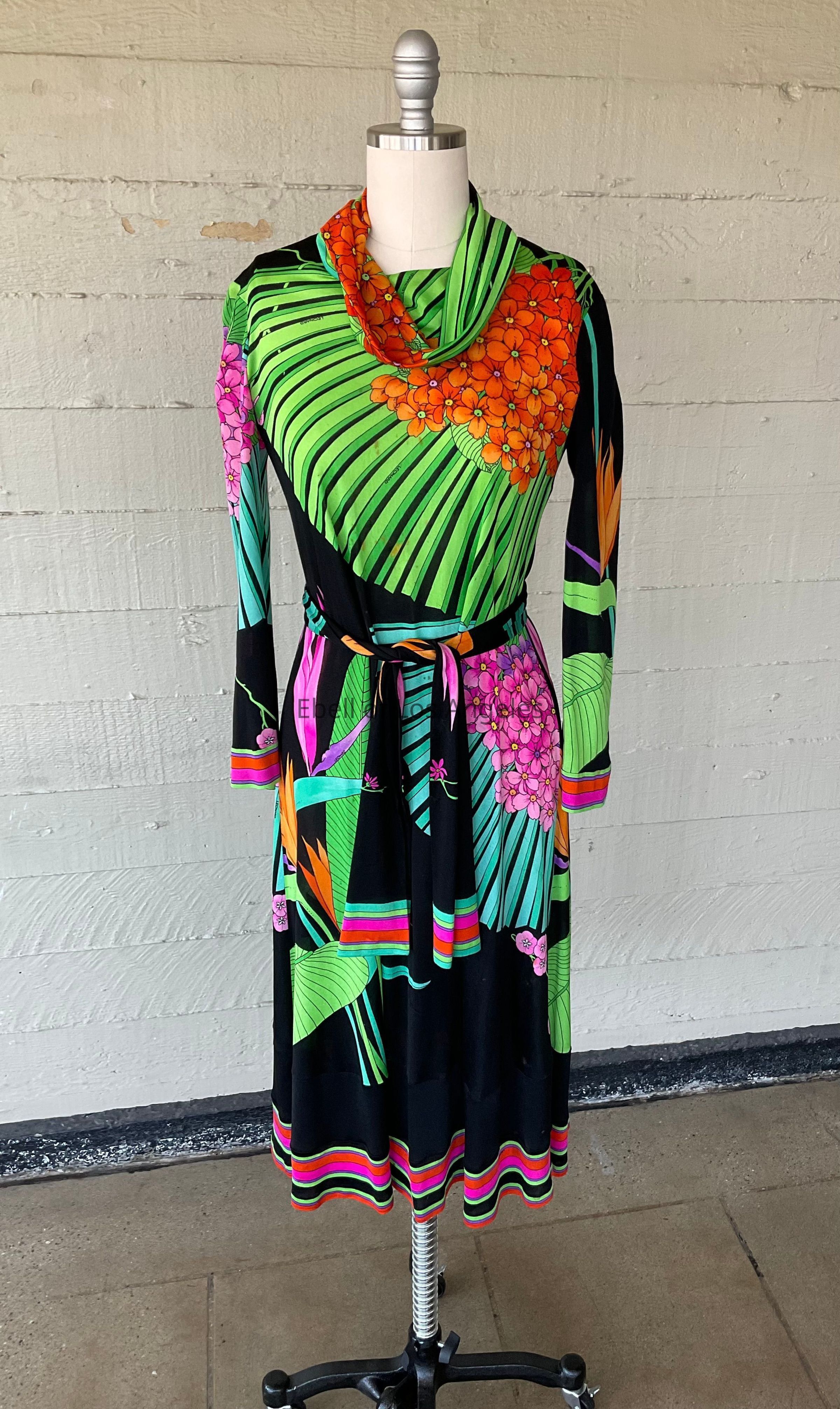 Cowl neck long sleeve print jersey dress with self beltCollection