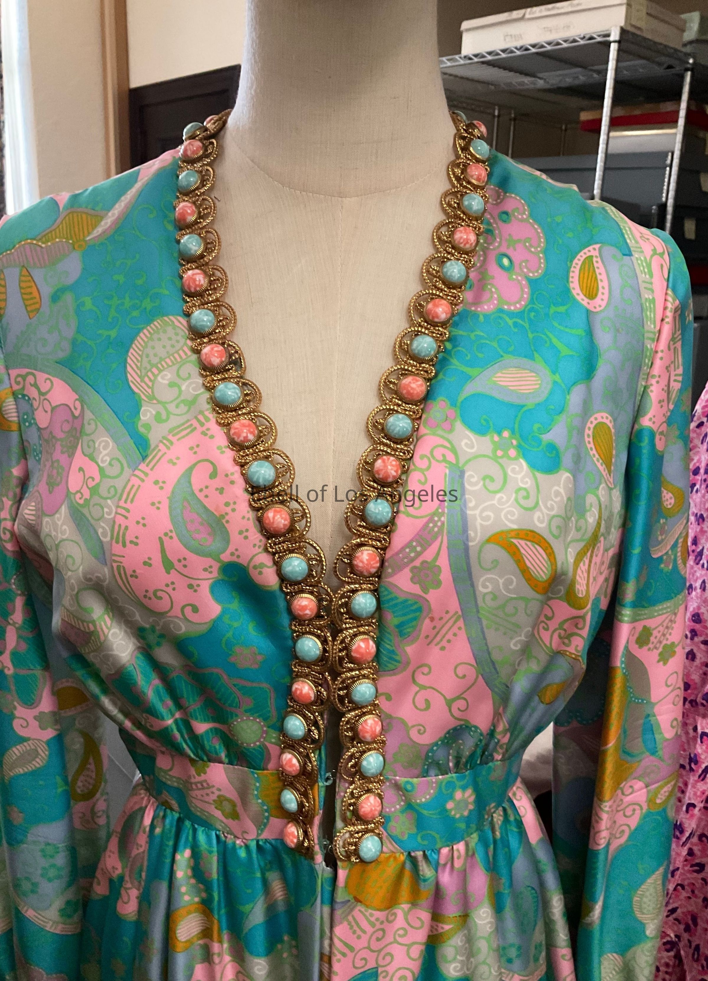 Long sleeve printed dress with set in waist and beaded gold trim at neck