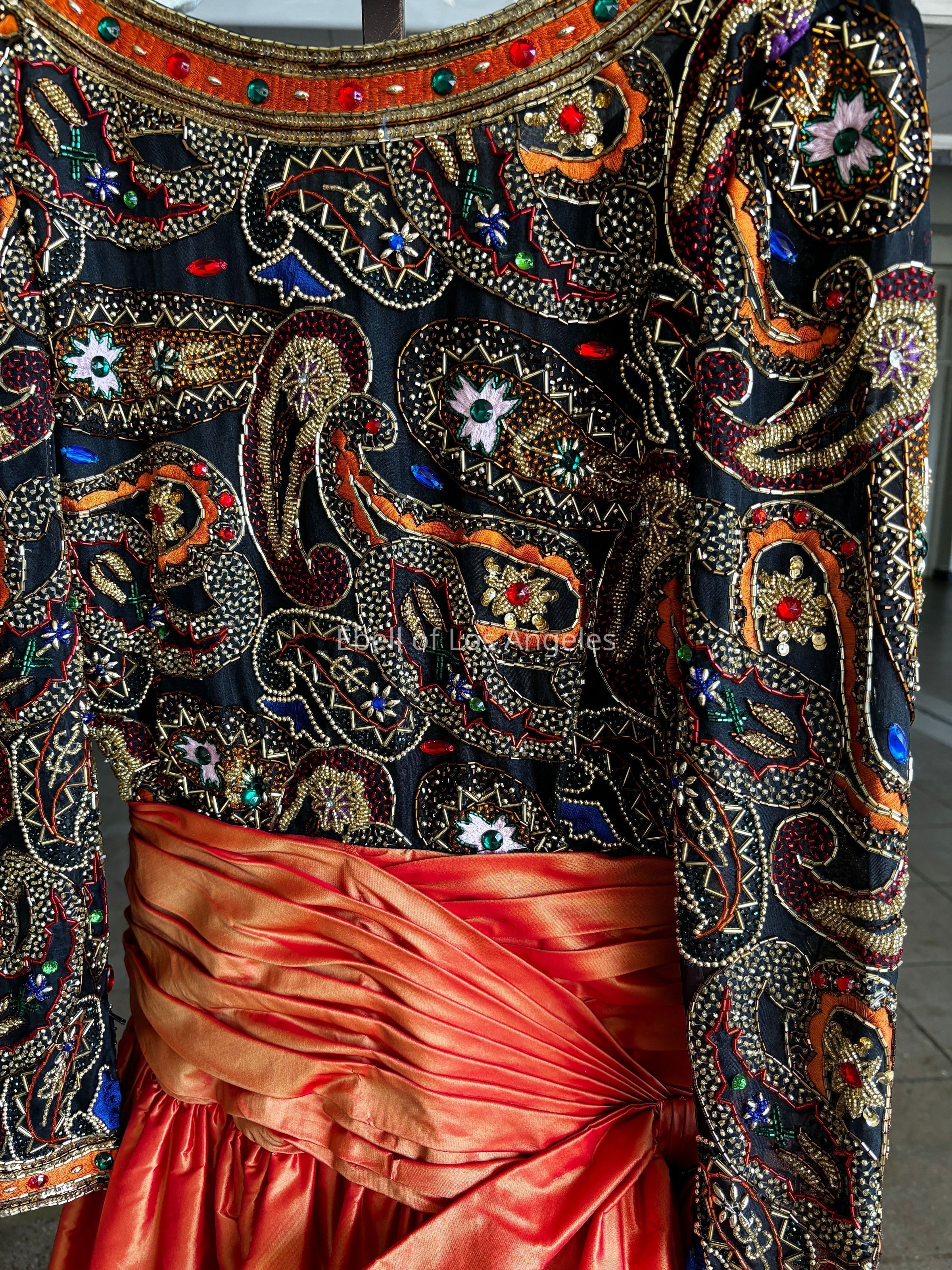 Long sleeve, black sheer bodice with embroidery & beading, Iridescent Orange gathered cummerbund & full length skirtCollection