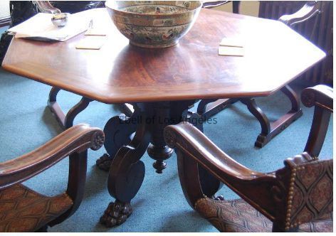Pair of Renaissance style walnut octagonal dining tables. Base has a central suspended pedestal with four legs shaped in large scrolls and ending in paw feet.Collection