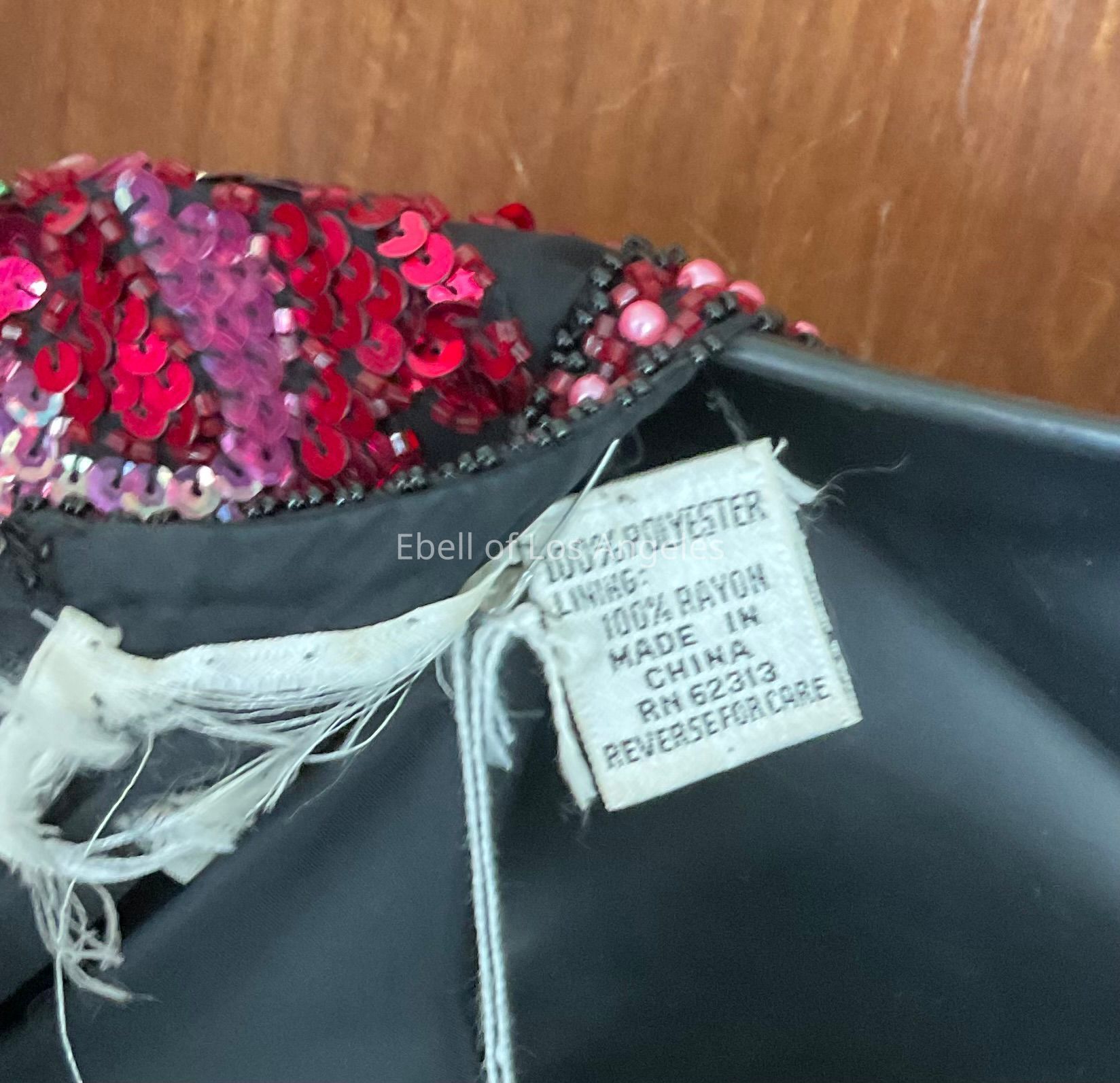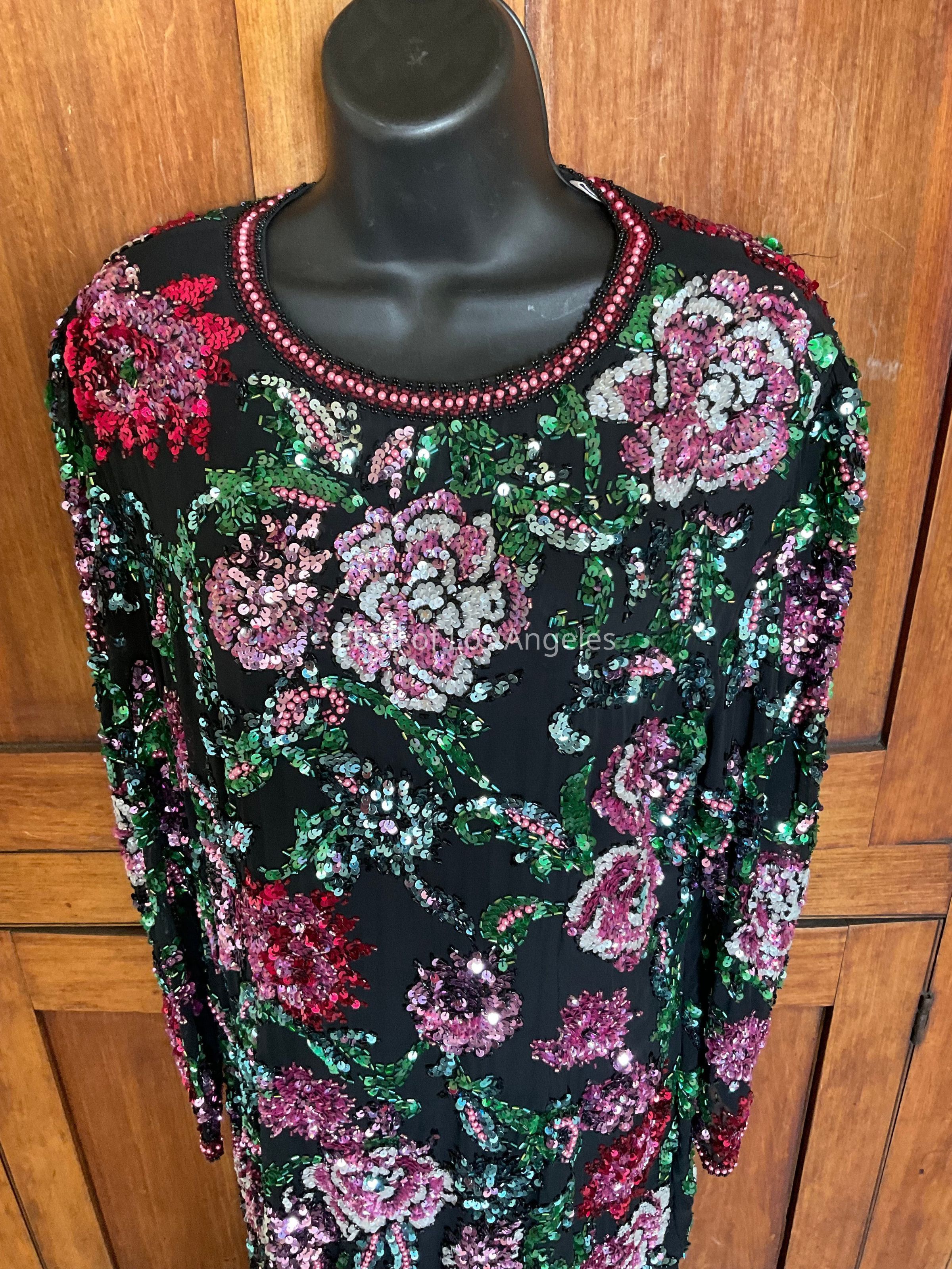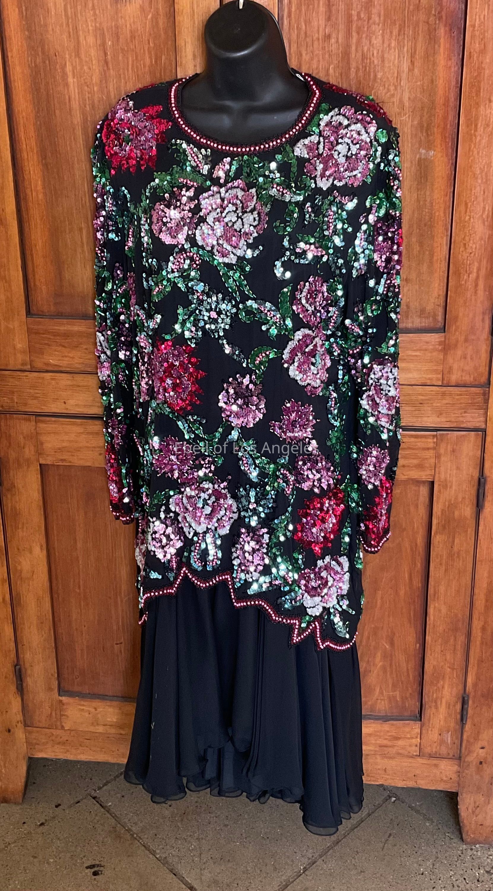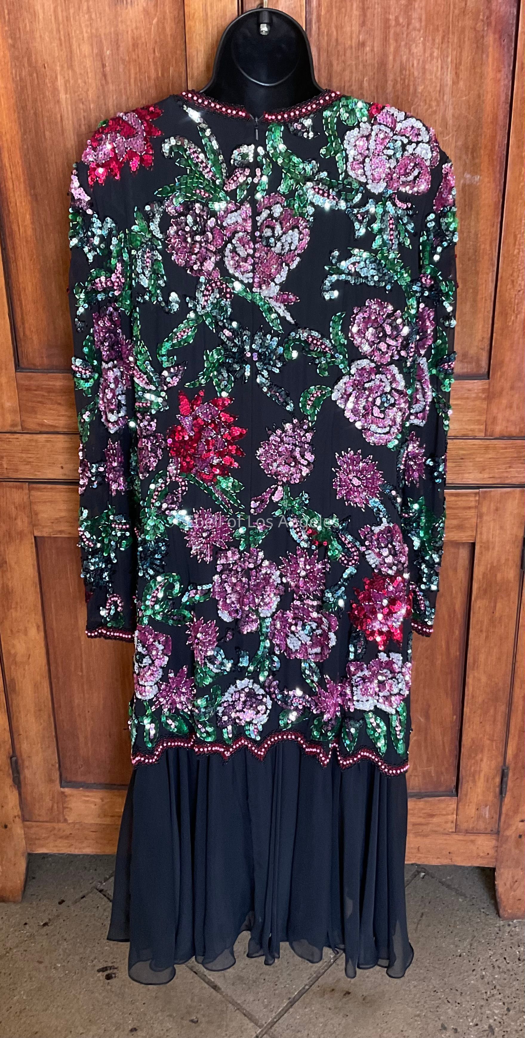 Long sleeve, knee length chiffon evening dress with sequin and beaded flowers on tunic topEntry/Object ID