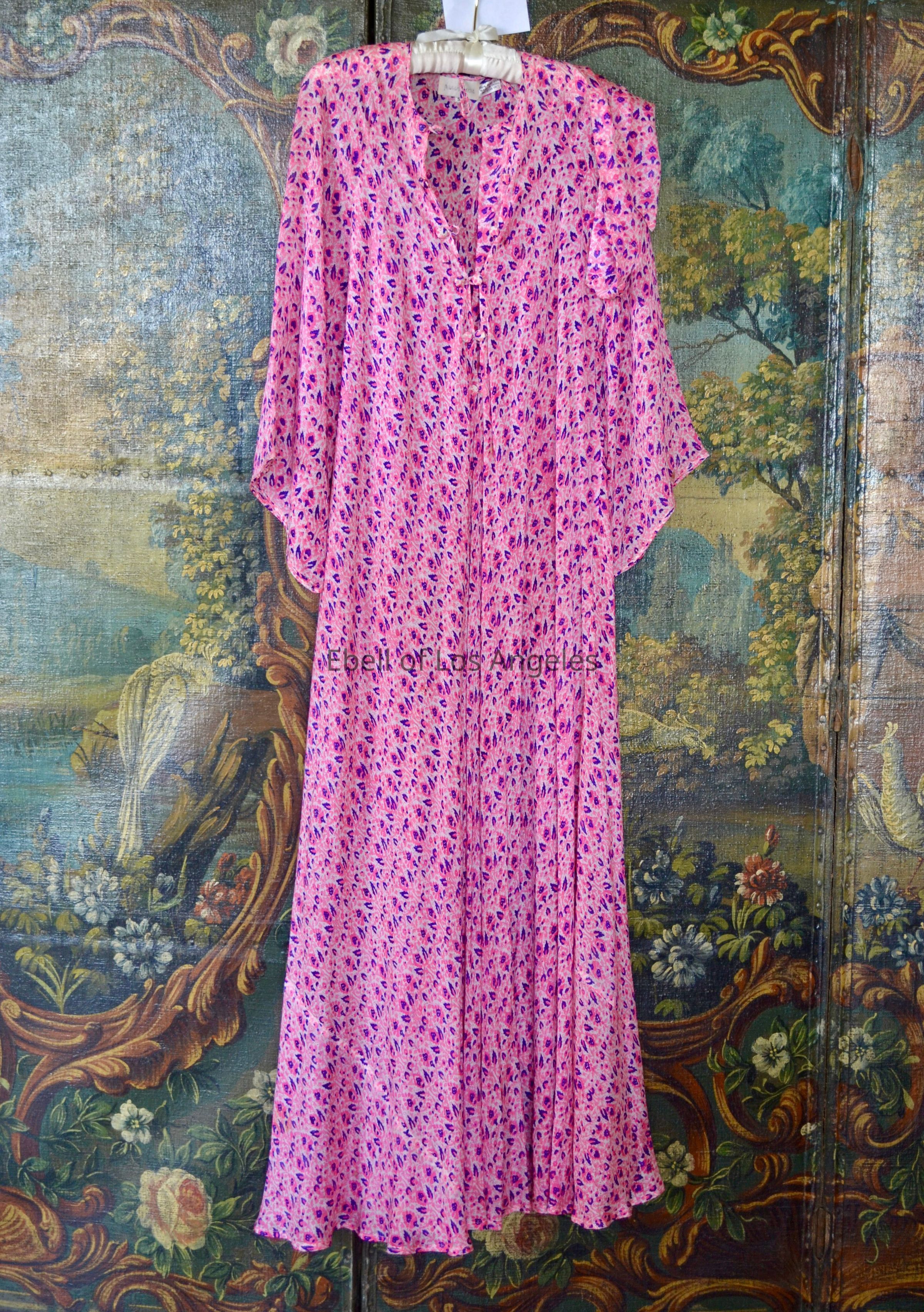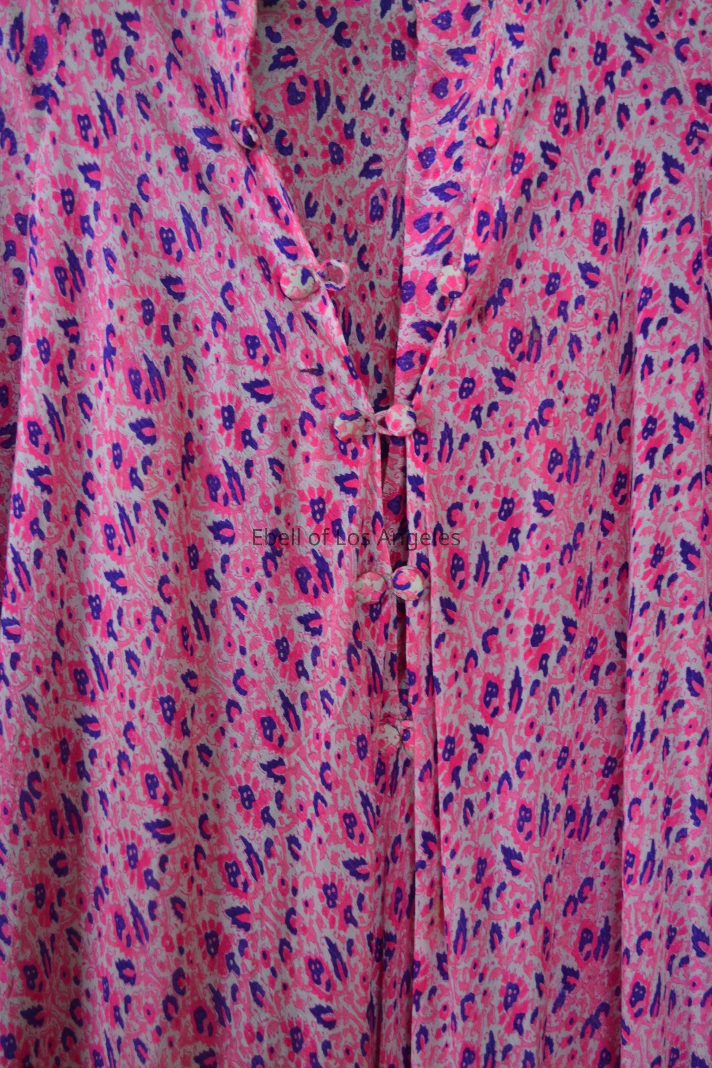 Printed silk caftan with raglan sleeves, 6 button front opening and sash beltCollection
