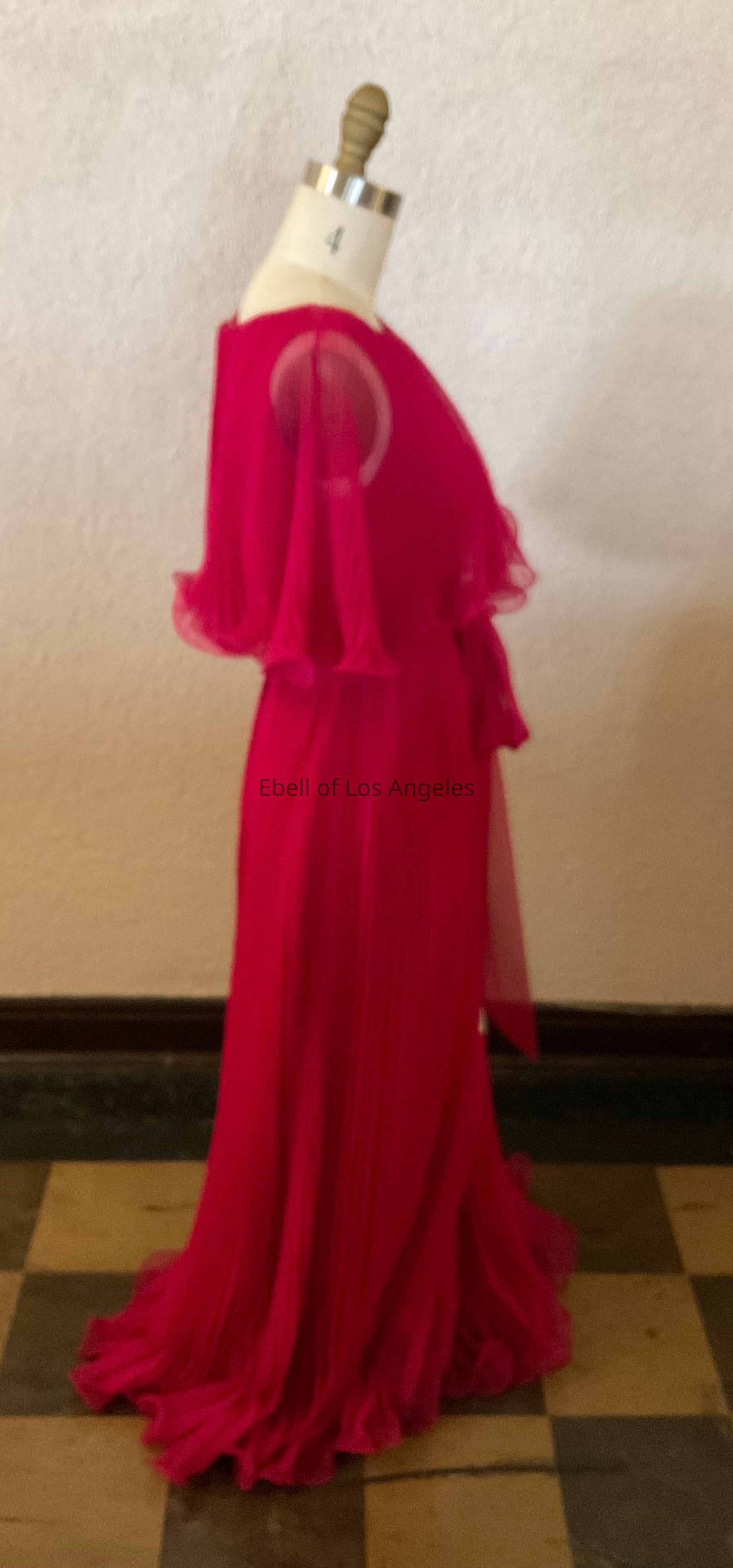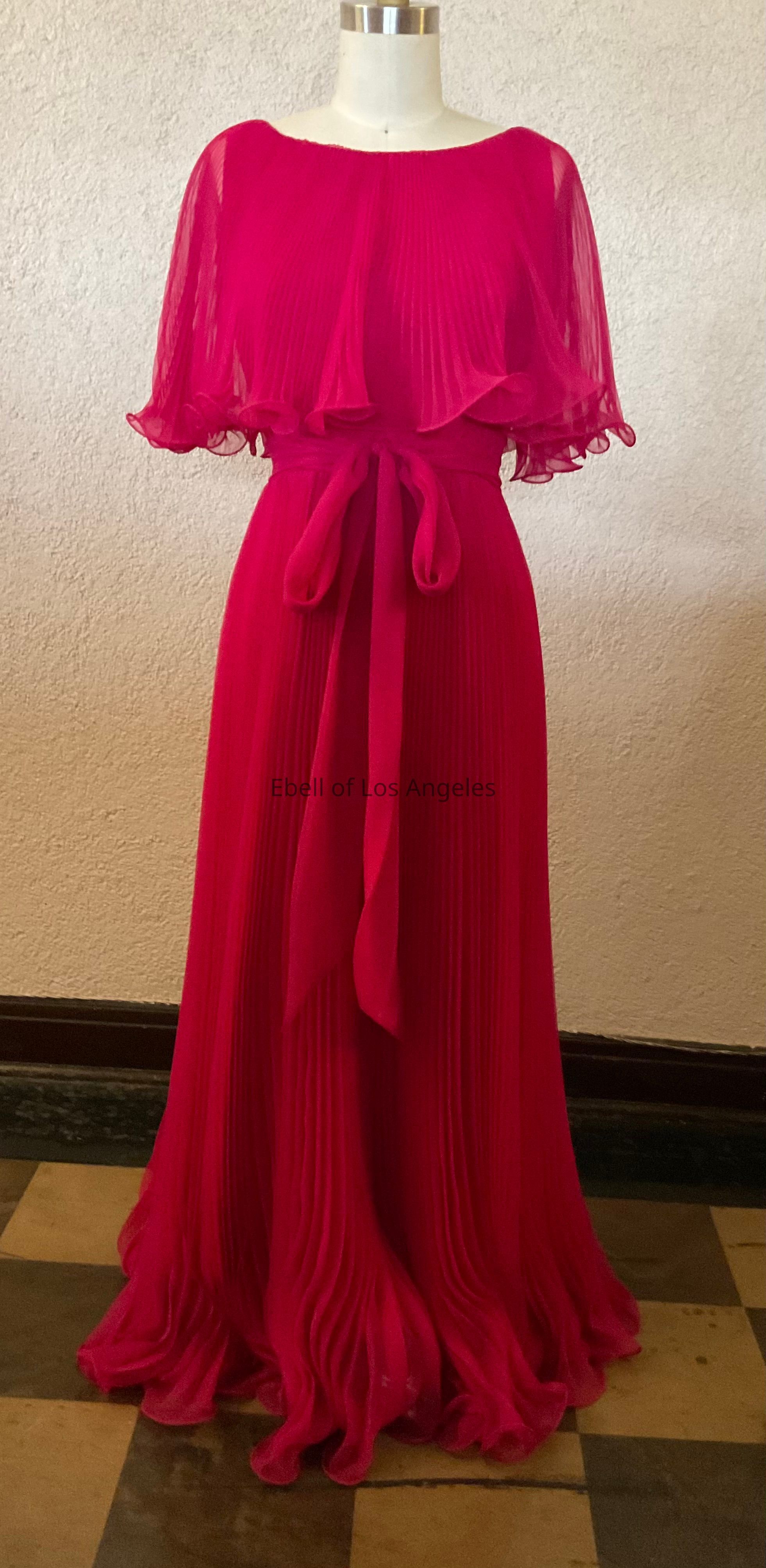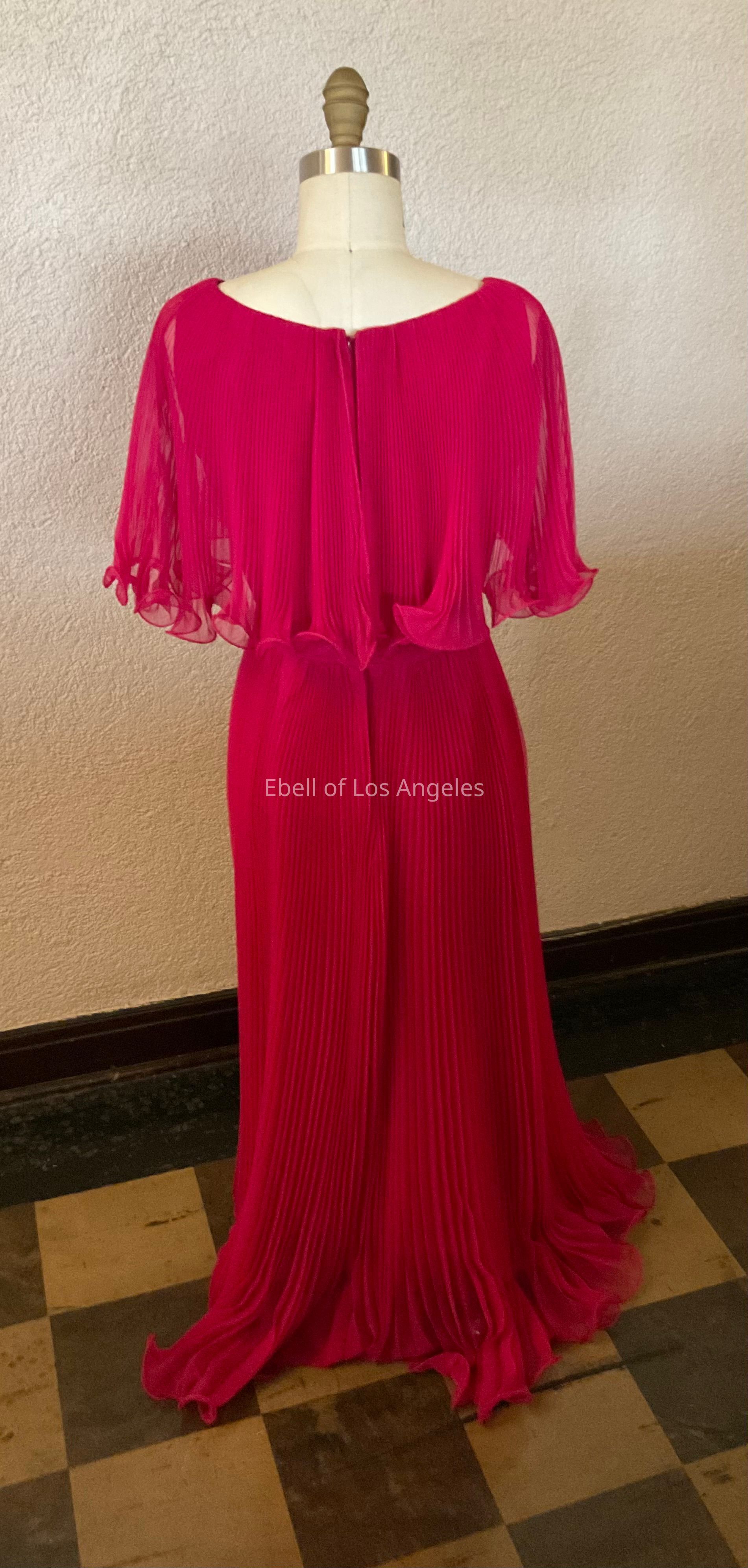 Sleeveless floor length evening dress with knife pleated skirt and cape collar, self sash.Entry/Object ID