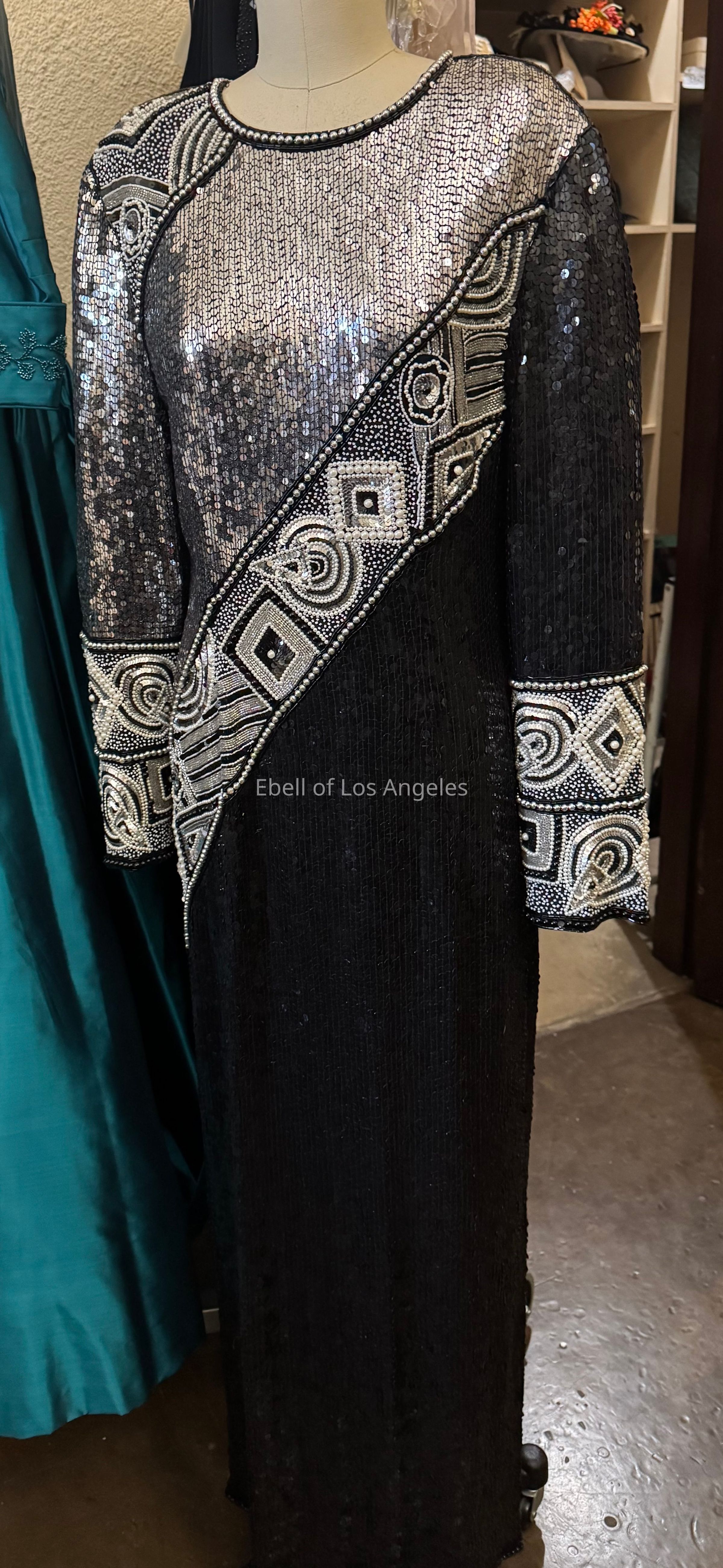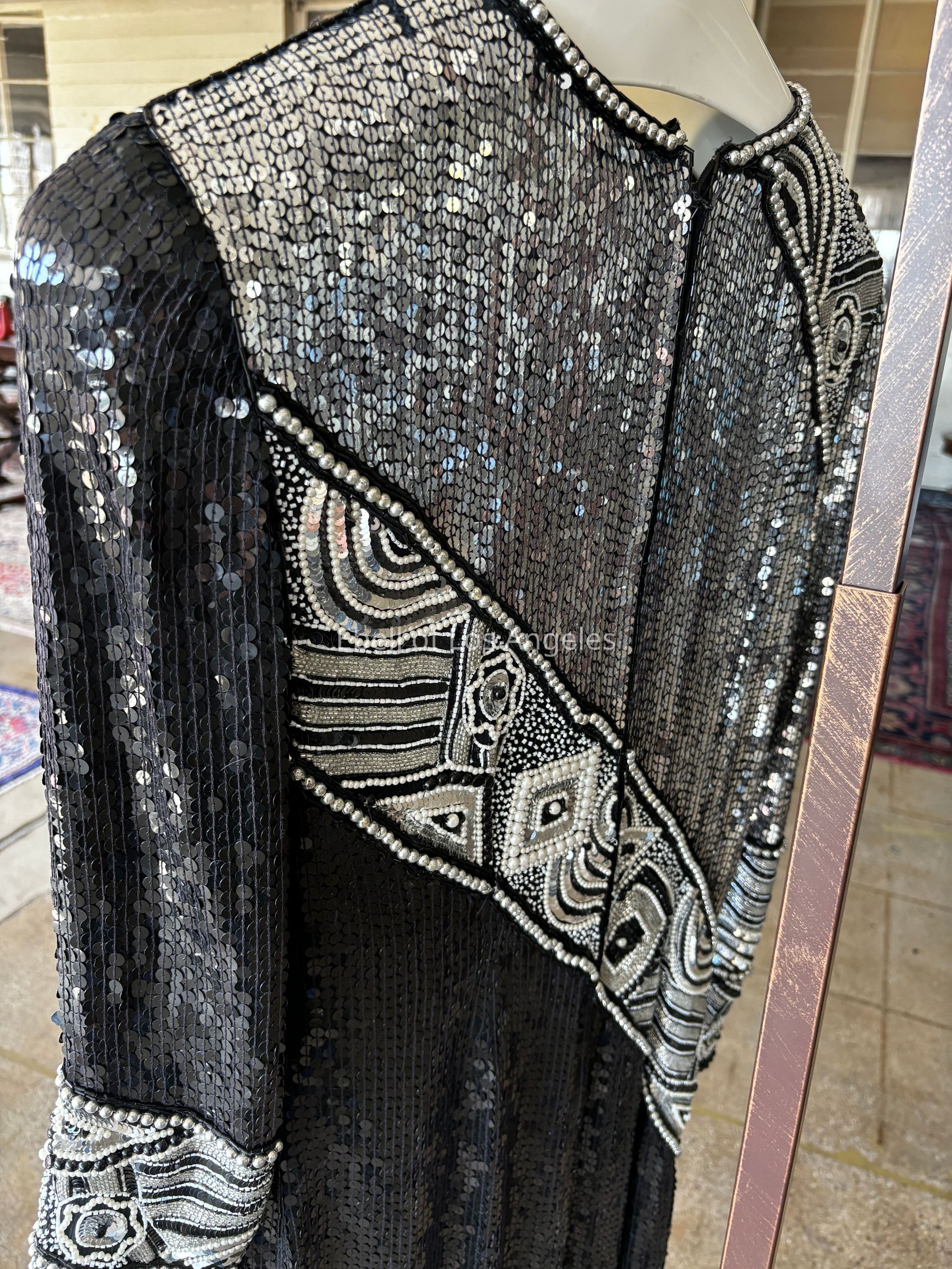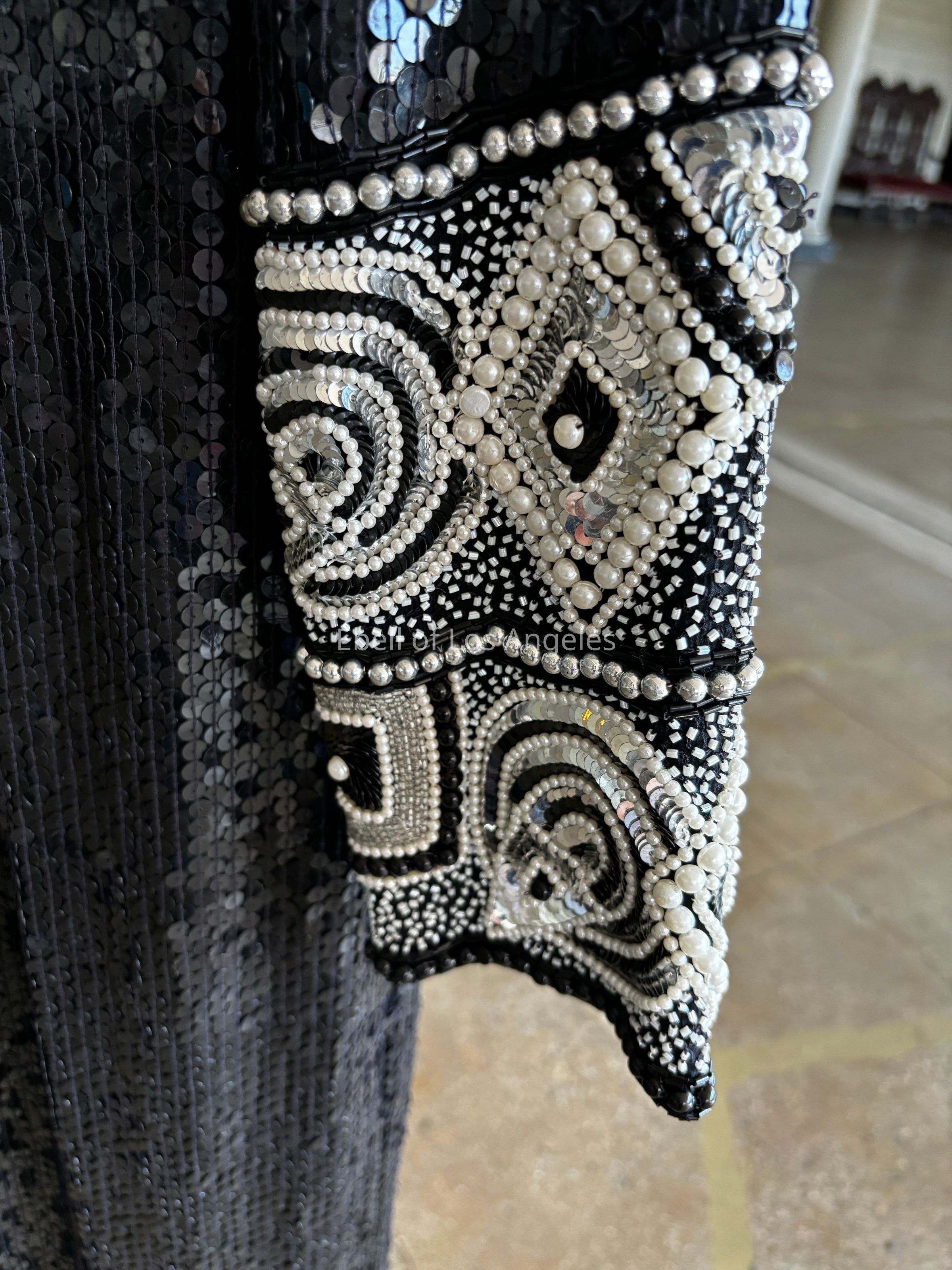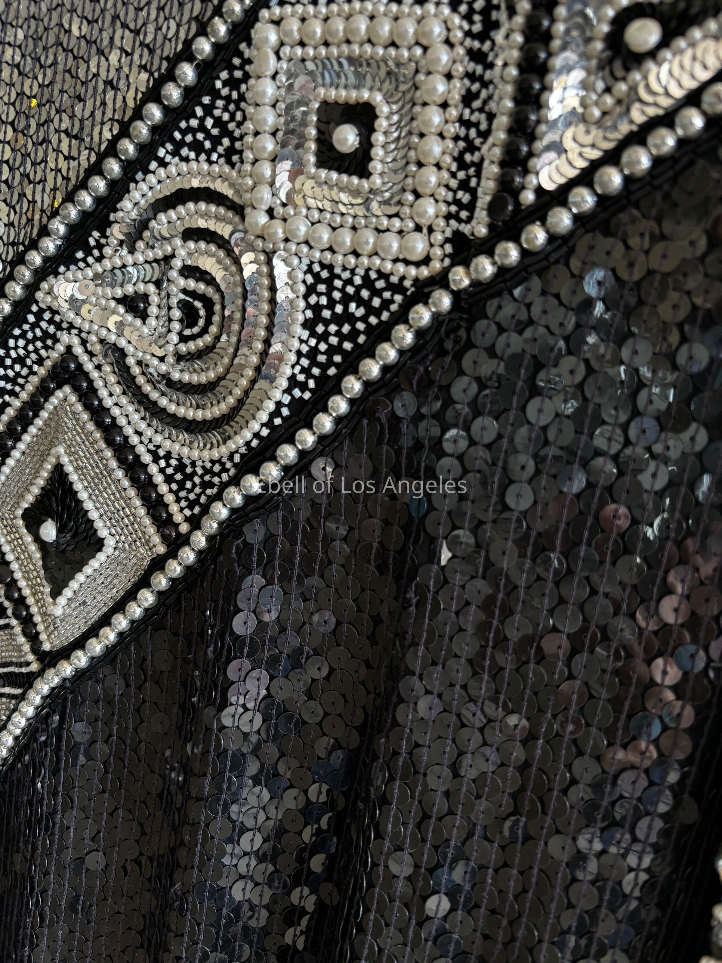 Long sleeve, asymmetrical design motif embellished with white pearls and beads and black and silver sequinsEntry/Object ID