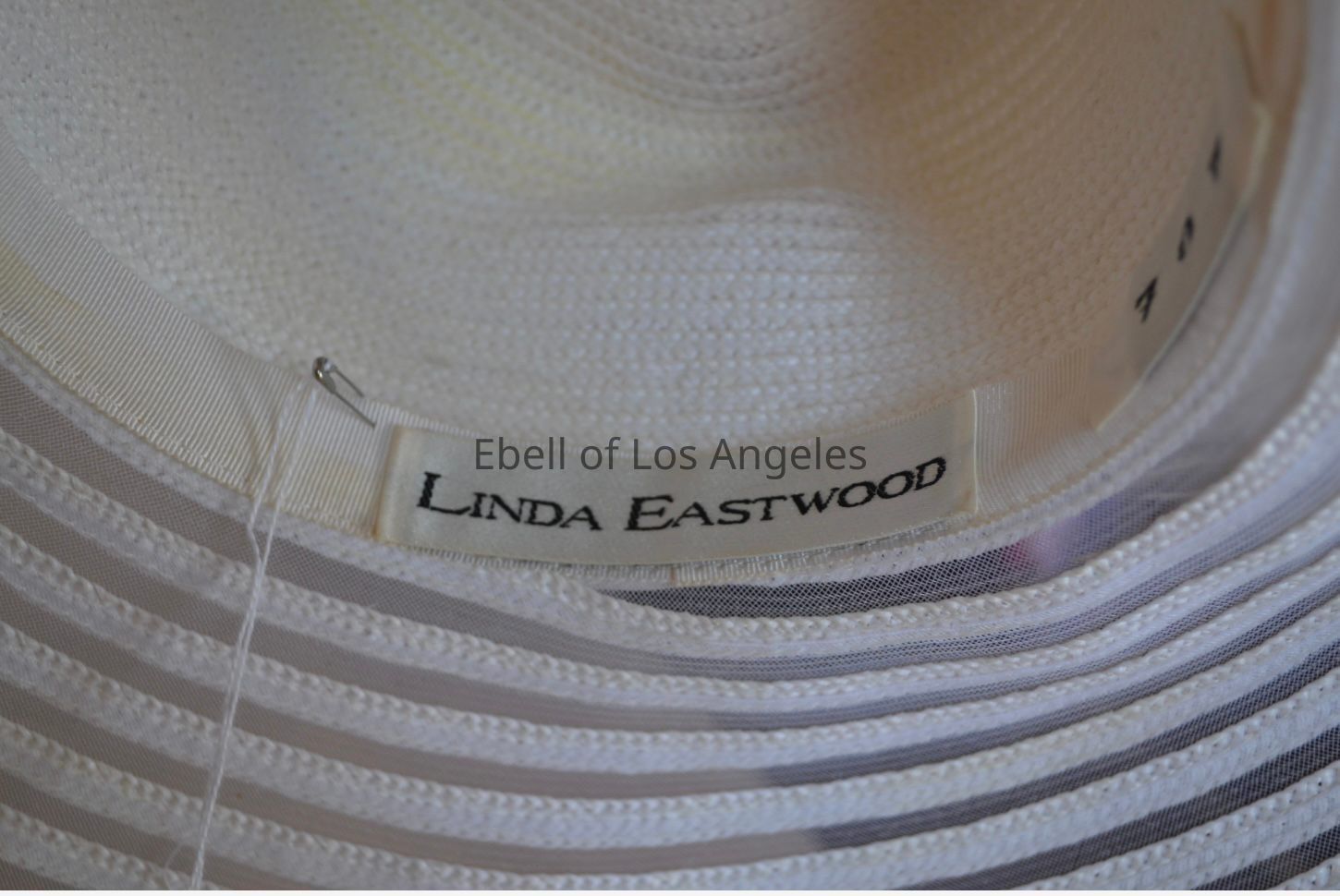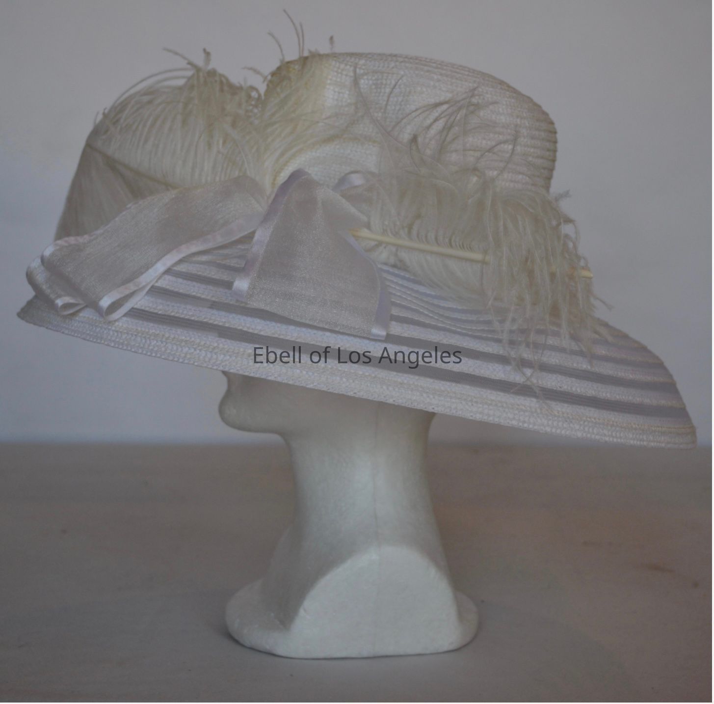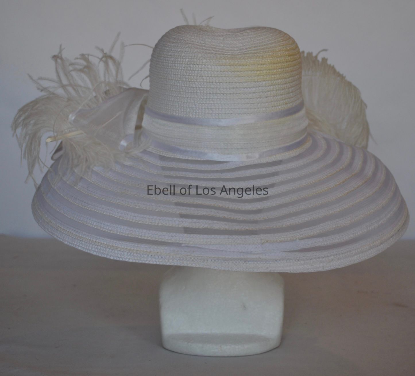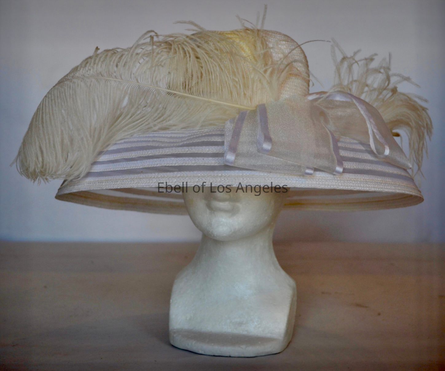 Wide brimmed bucket style hat with silk ribbon tie and feathers
