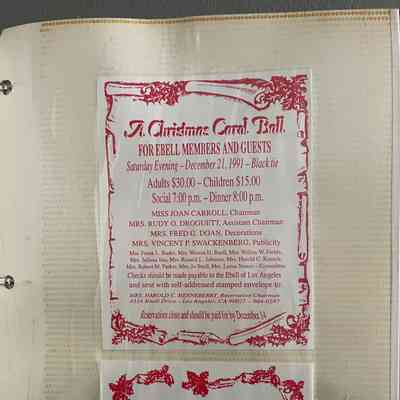 A scrapbook of flyers, photographs, attendees list, and notes on duties regarding the Christmas Carol Ball at the Ebell of Los Angeles on December 21, 1991.Collection