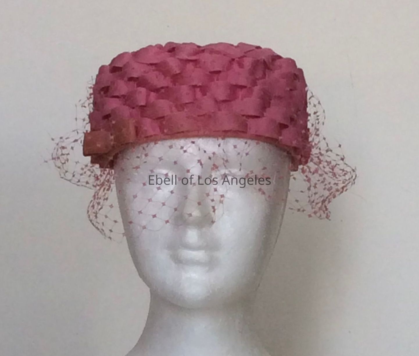 Mesh pillbox covered with pink ribbon in basketweave design with Russian veiling and pink bowEntry/Object ID