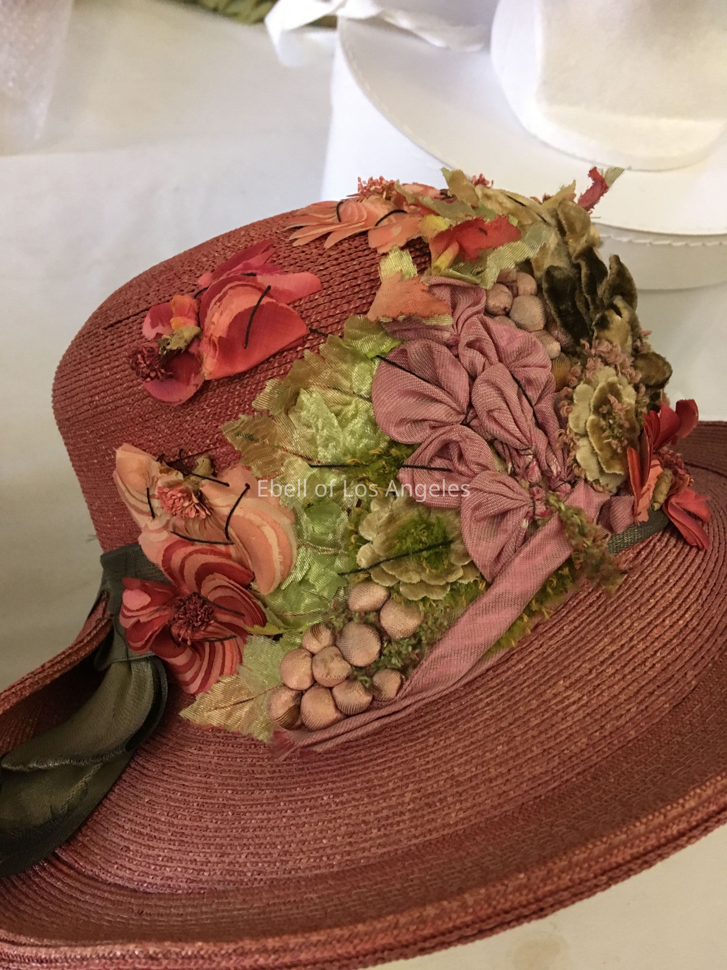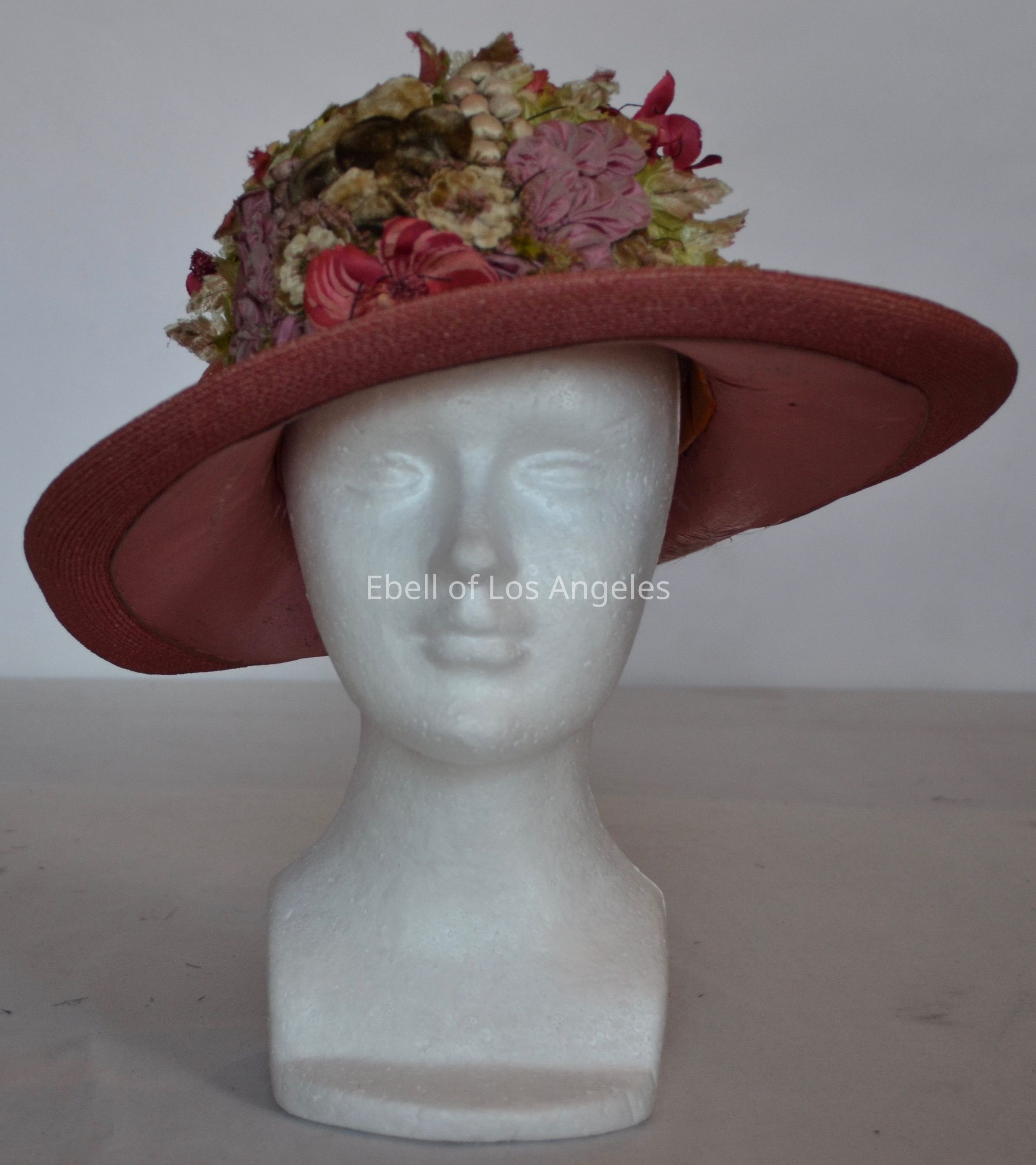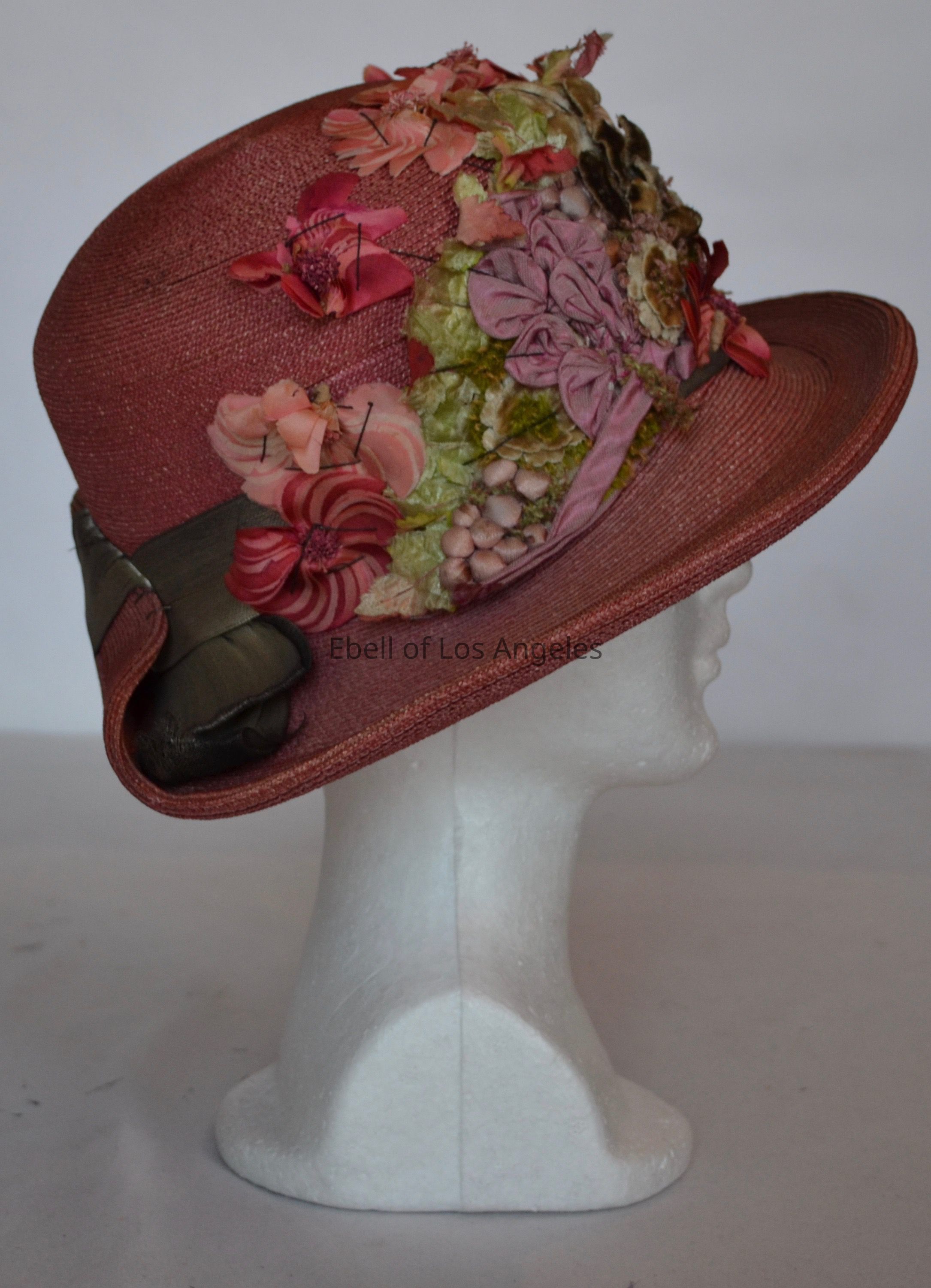 wider brim at front straw hat with faux flower covered crown front, silver bandCollection
