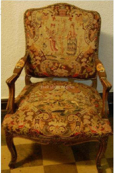 Louis XV style walnut fauteuil with cabriole legs and carved lower front edge. The fitted style upholstery is a multi colored needlepoint with nail head welting.Collection