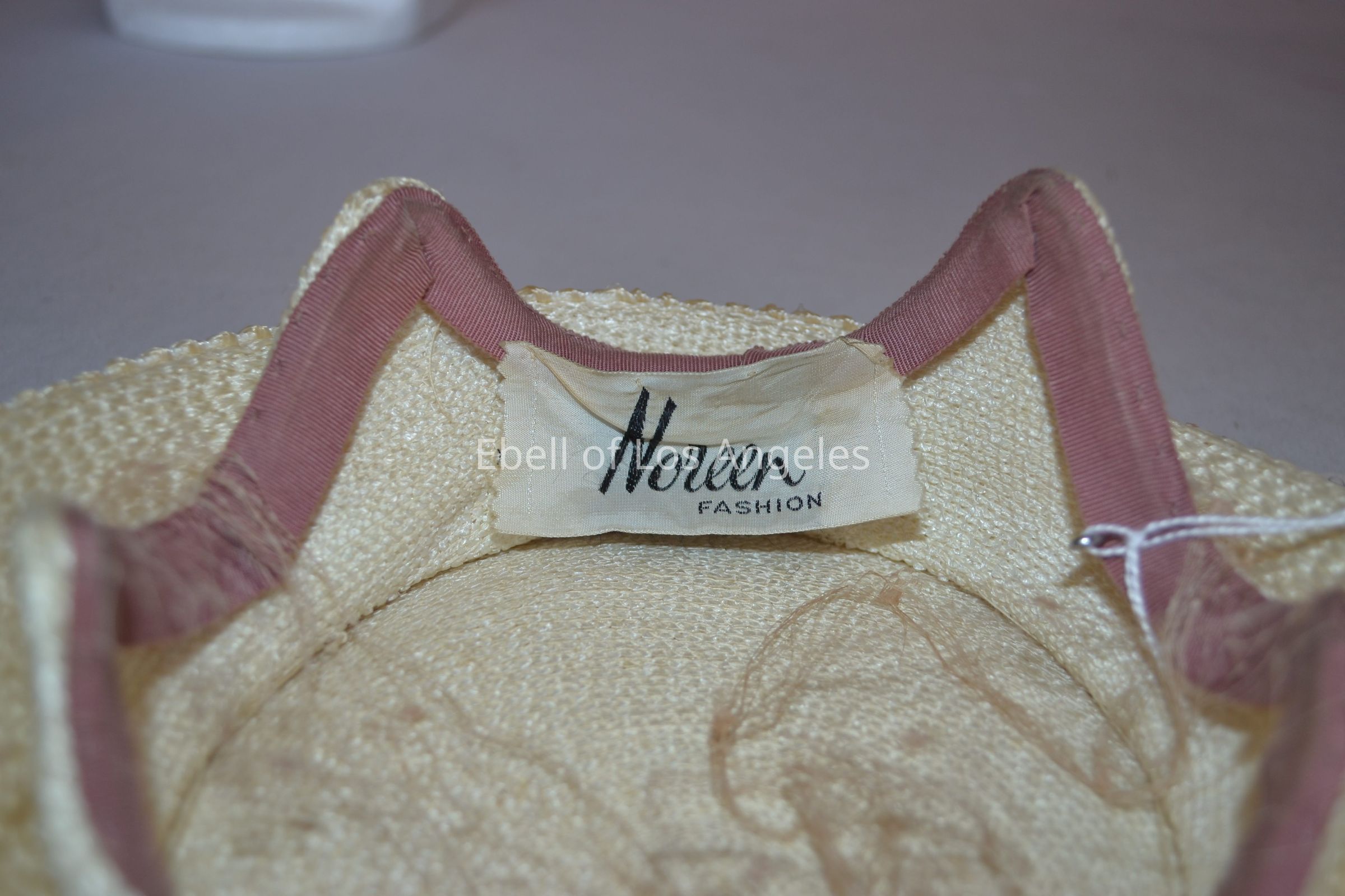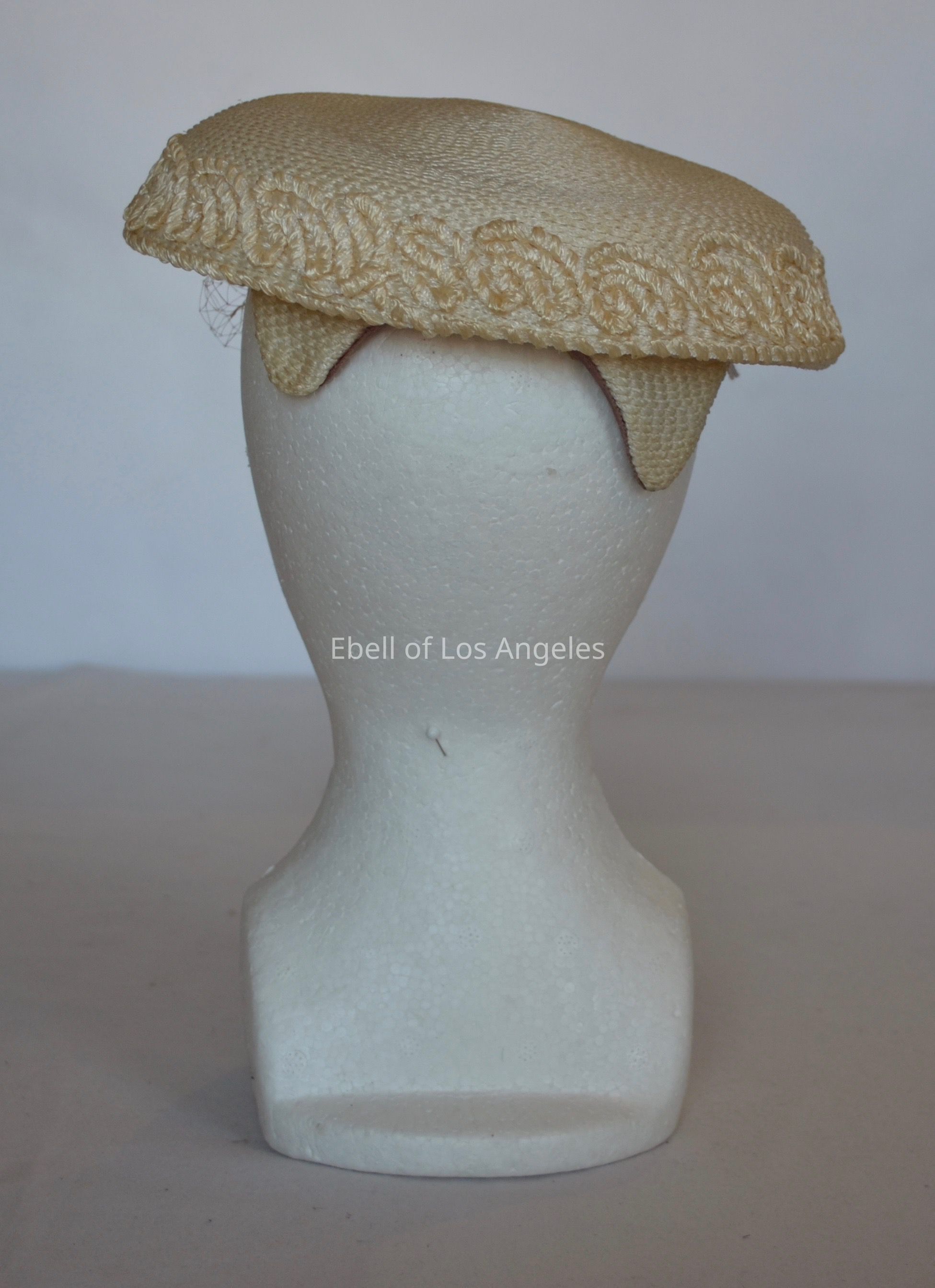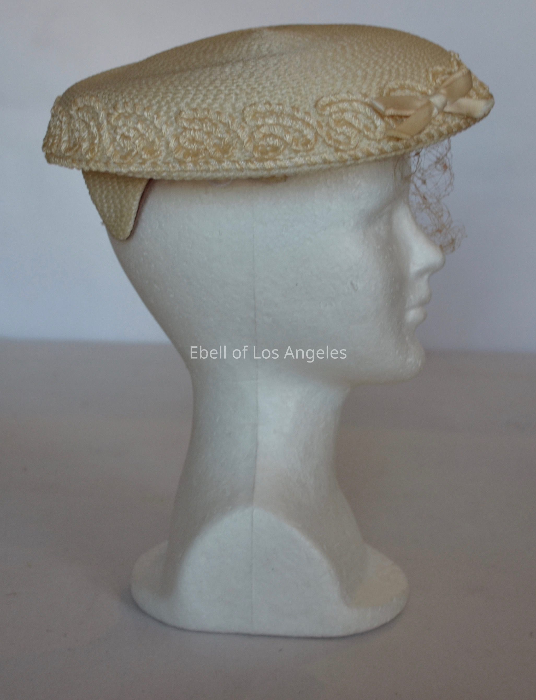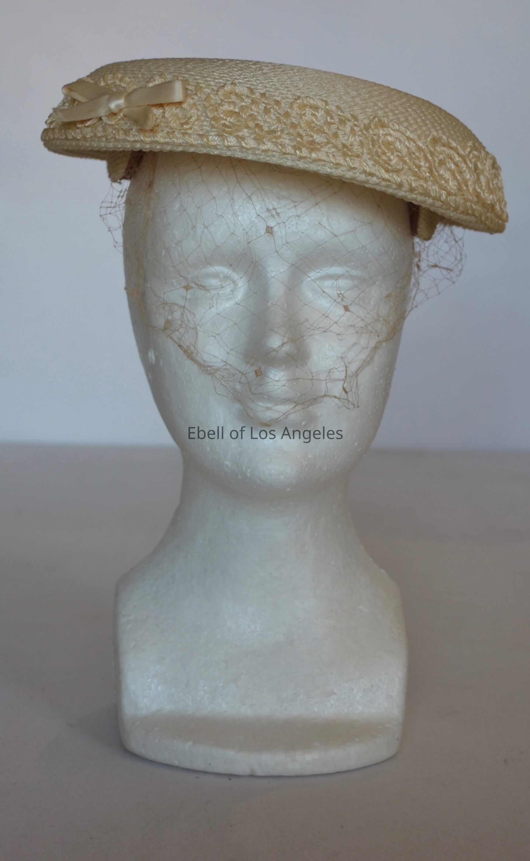 Straw mushroom style hat with net veil and small bowCollection