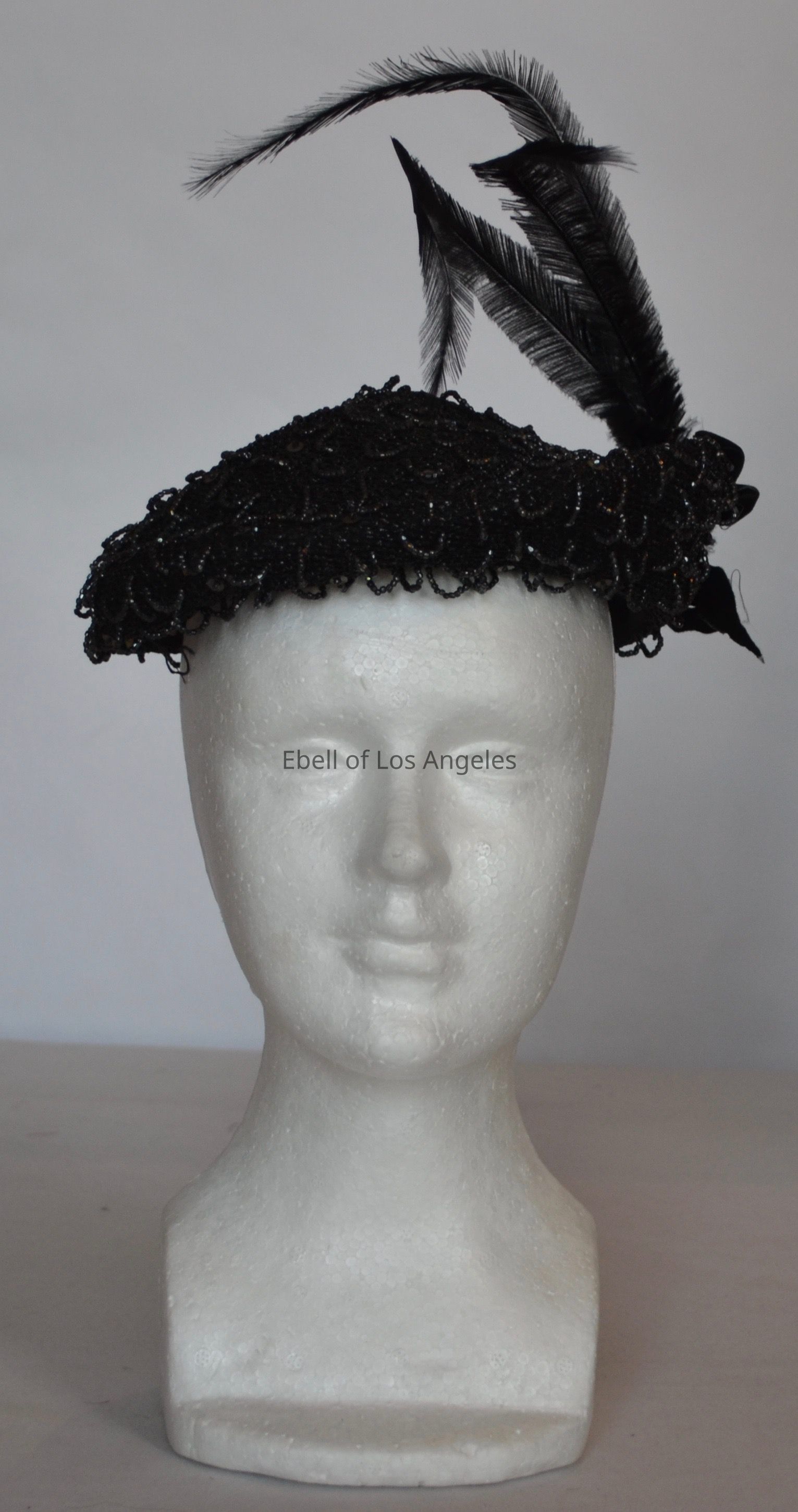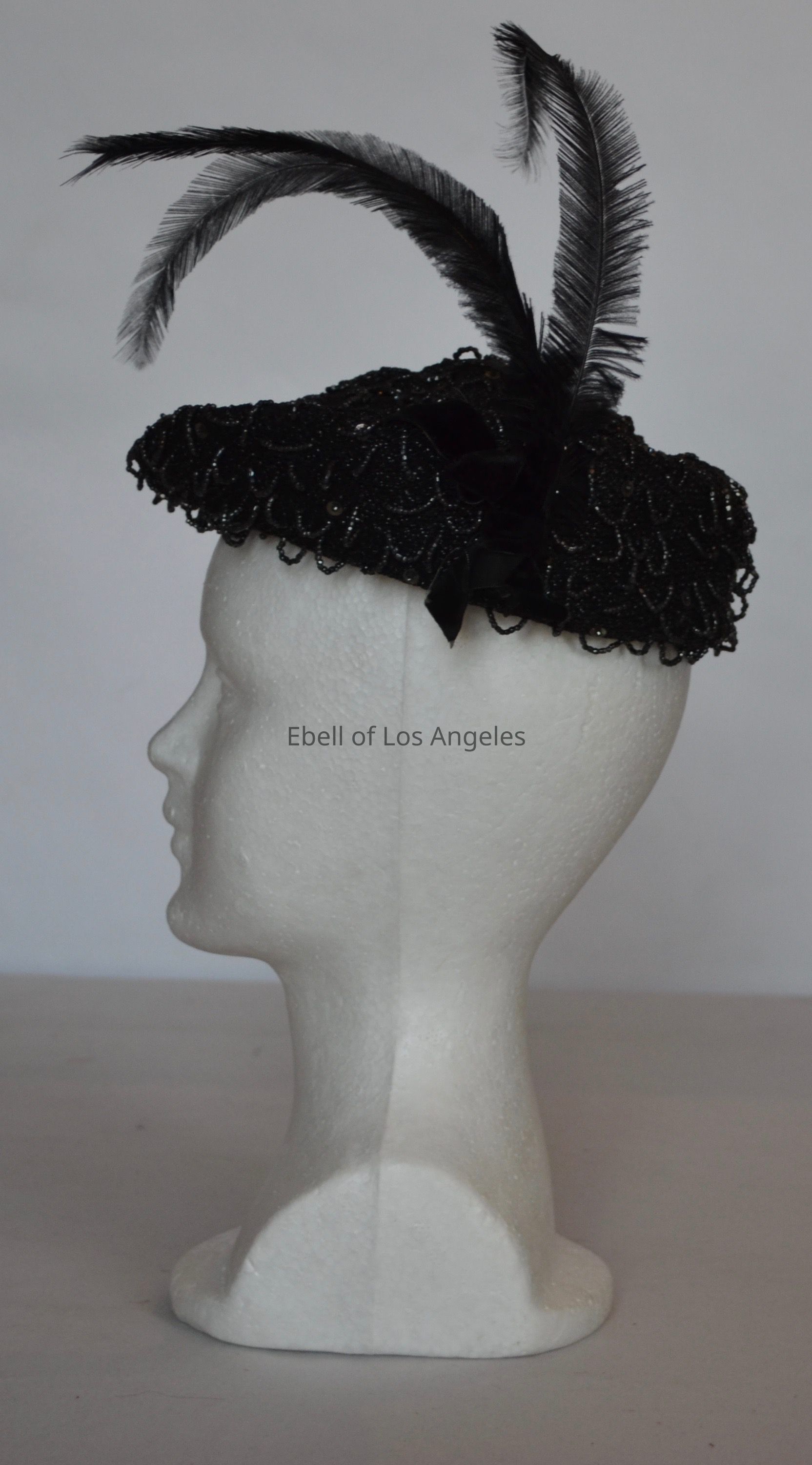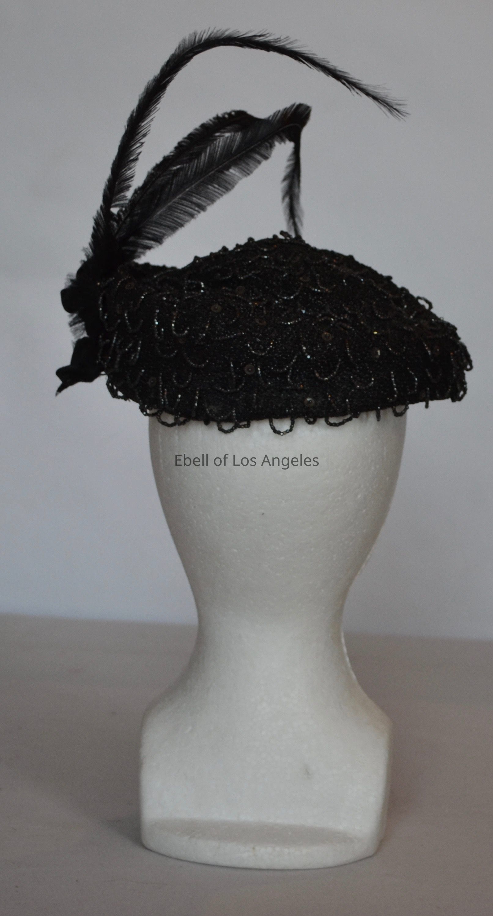 Beaded conical cocktail hat with three feathers and velvet bowCollection