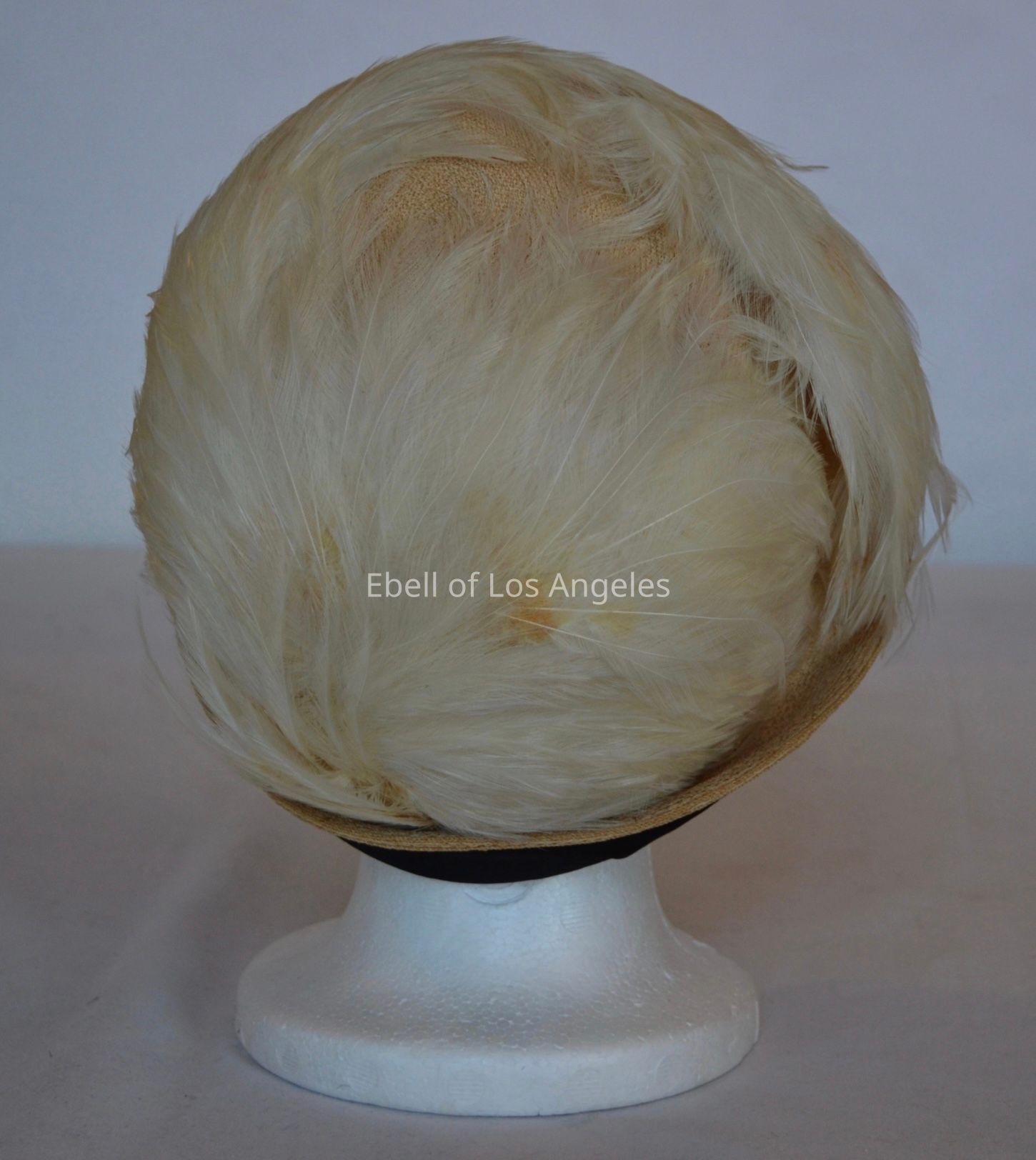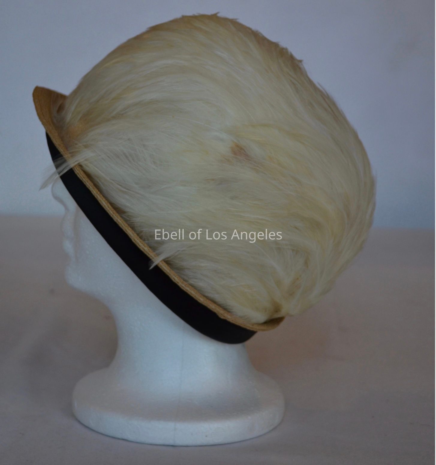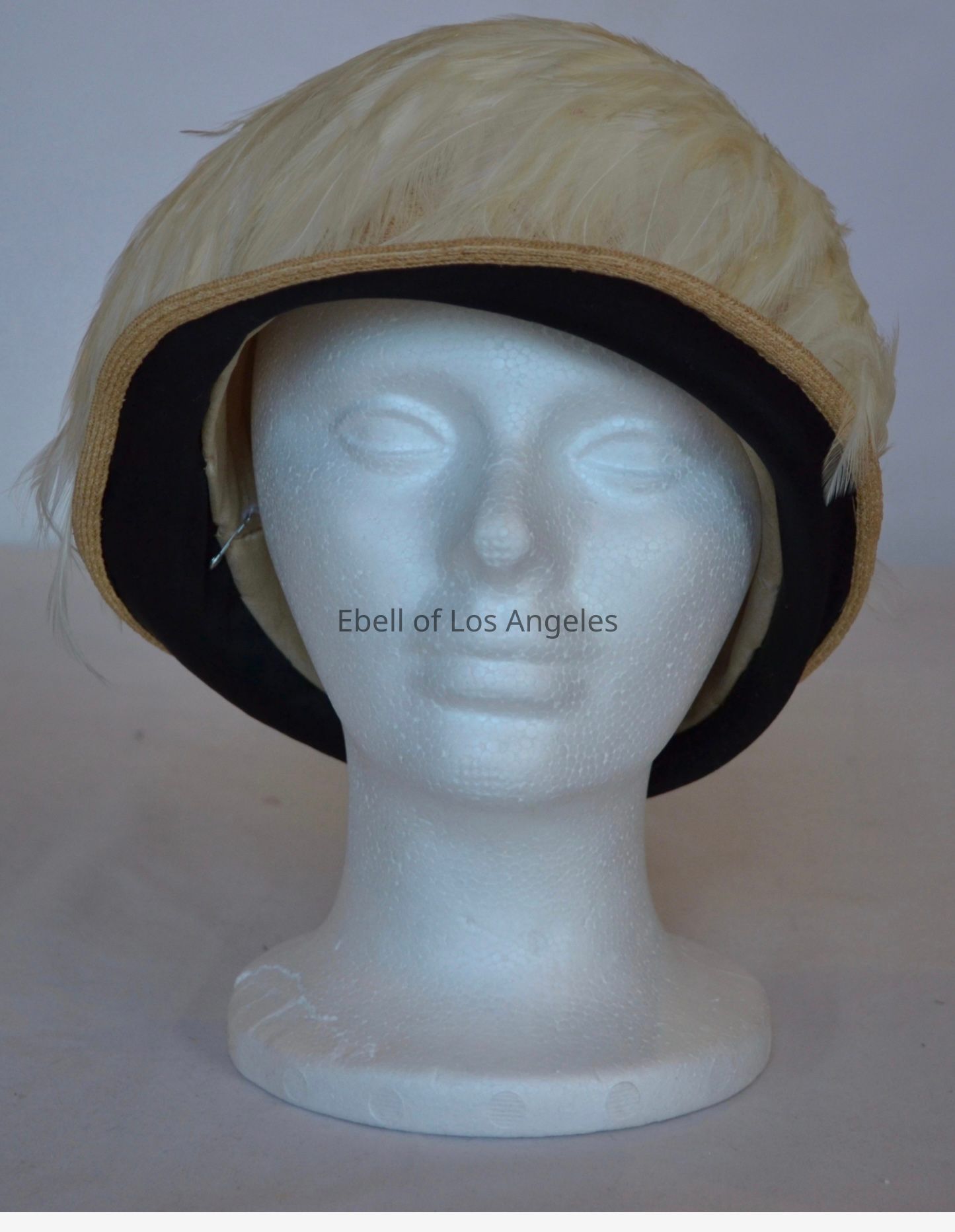Straw cloche style hat with black satin trim on narrow brim and feather covered crownCollection