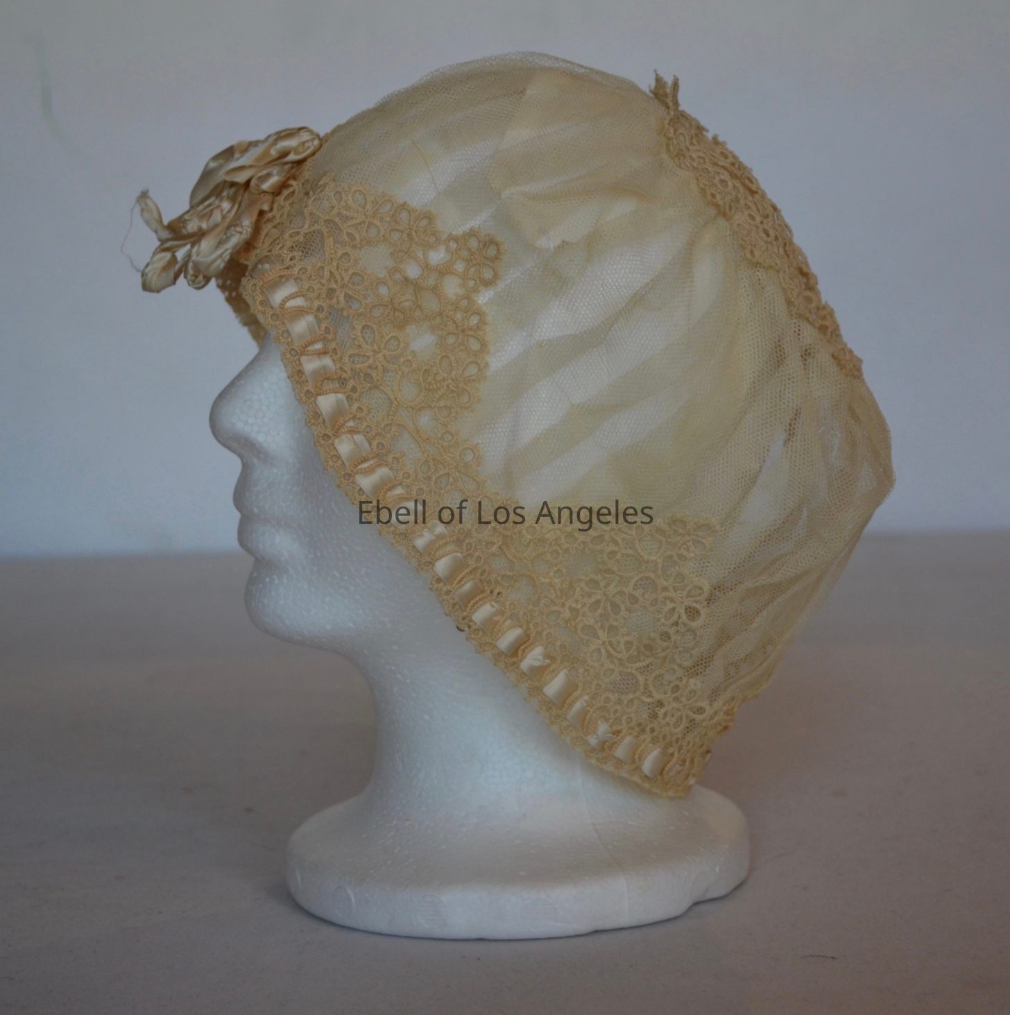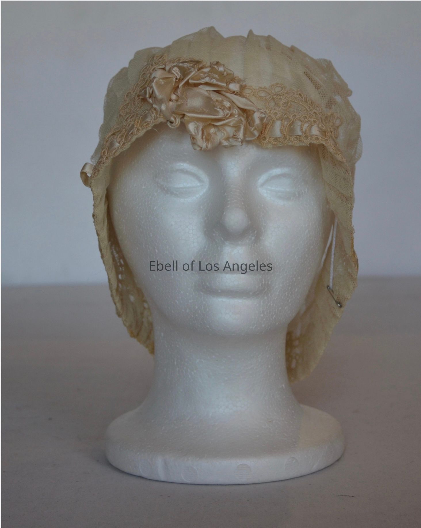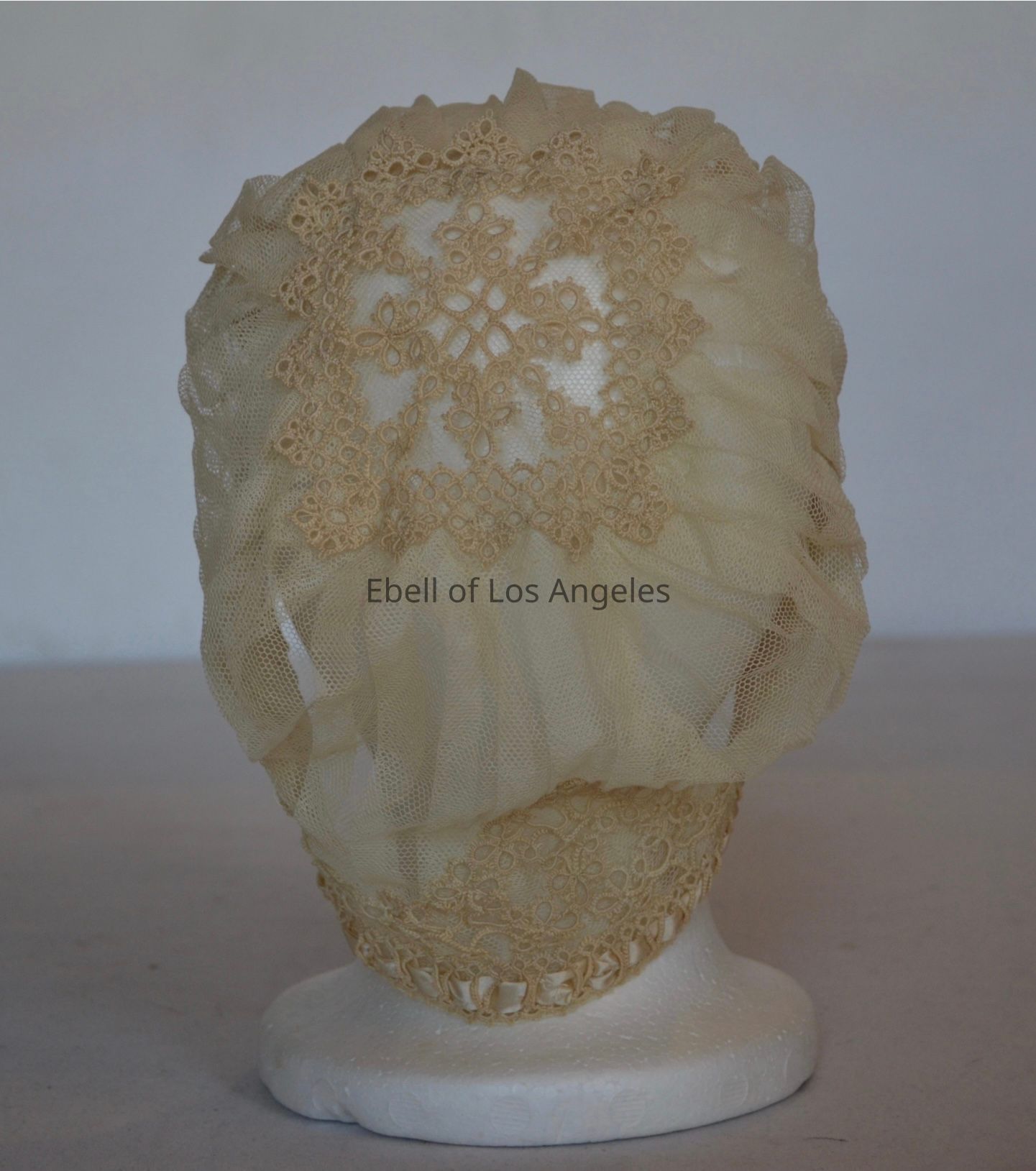 Pleated tulle boudoir cap with lace tatting trim and crochet insert in crown