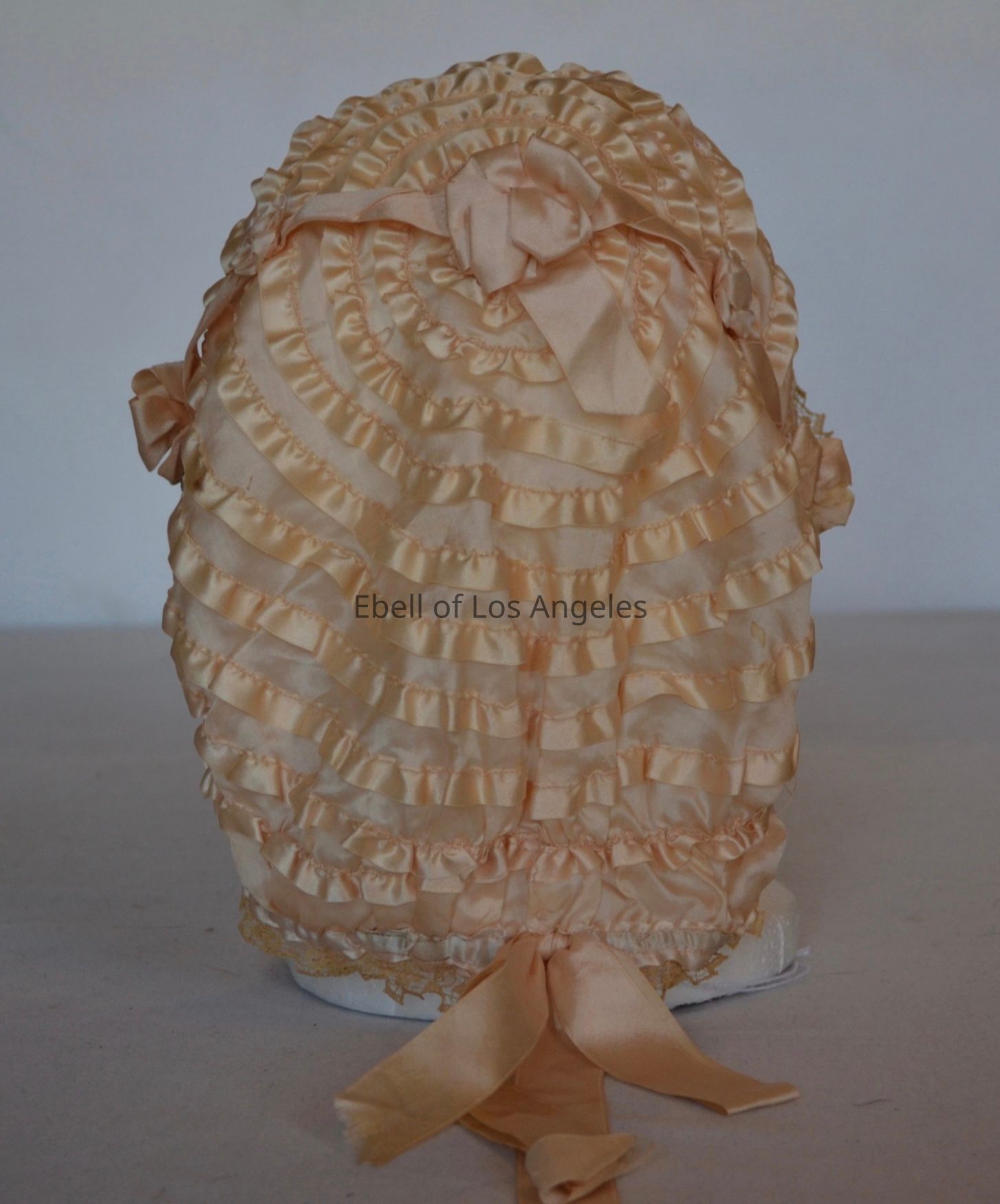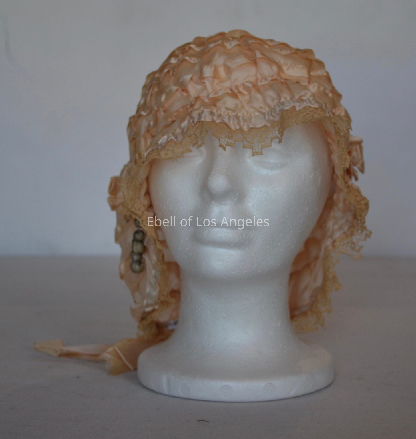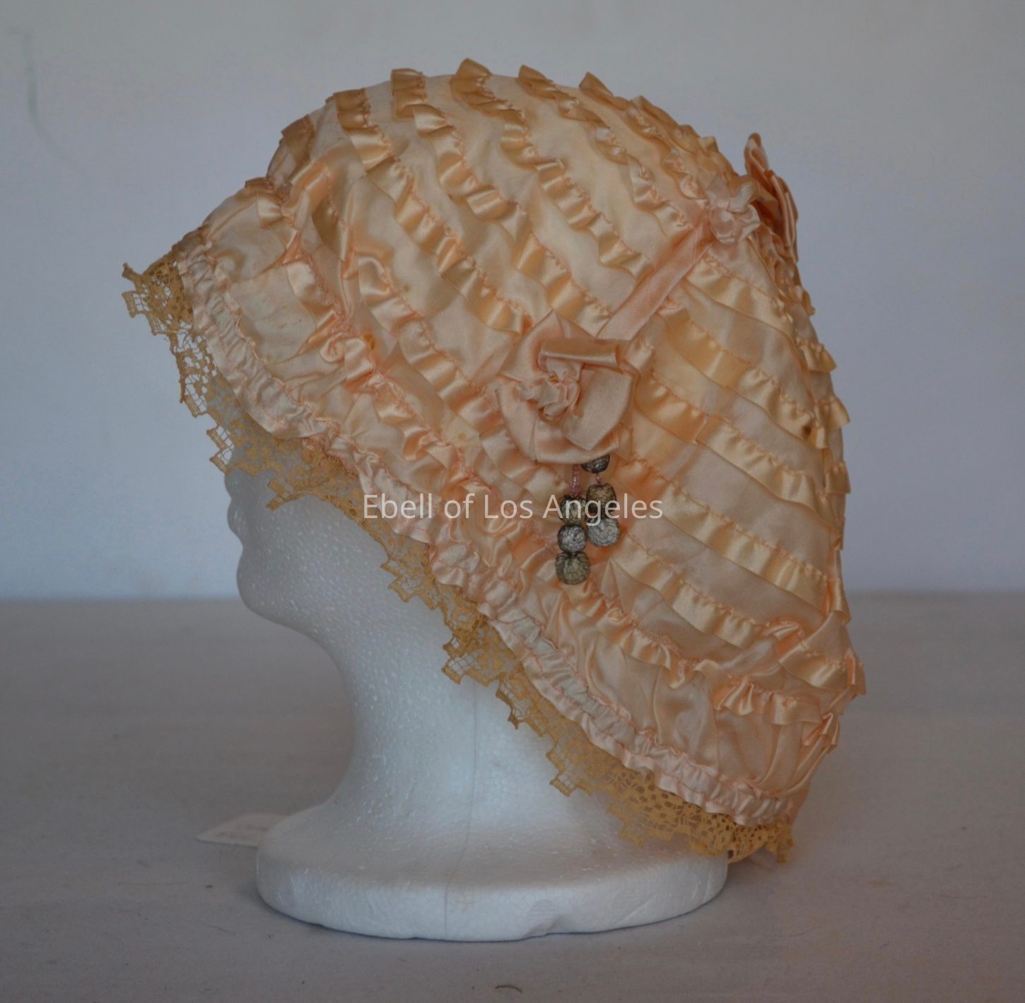 Ruffled boudoir cap with lace trim and small beads on front