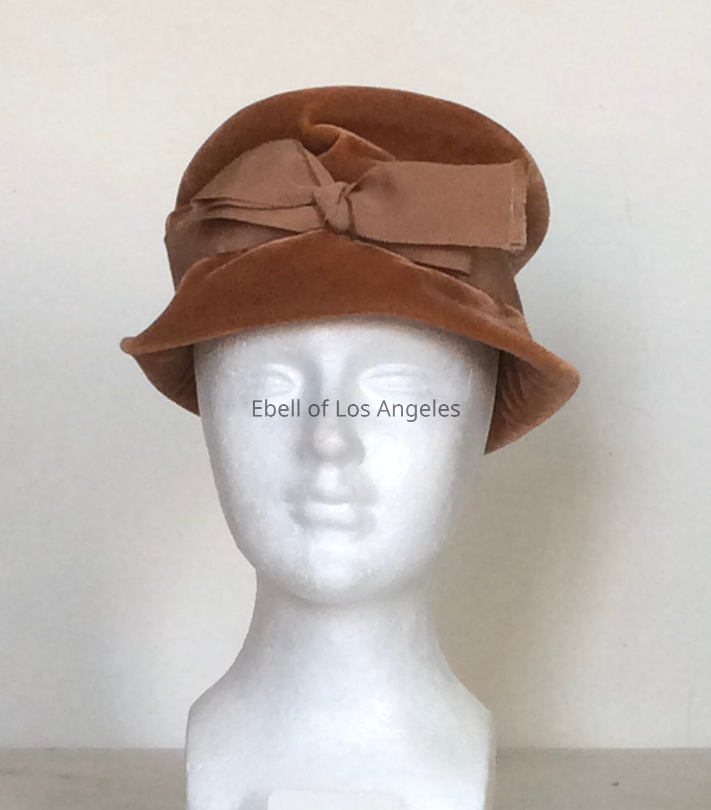 Velvet flower pot hat with gros grain hat band and front bow, small brimEntry/Object ID