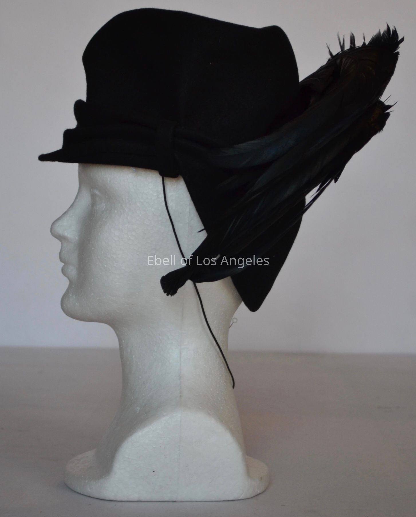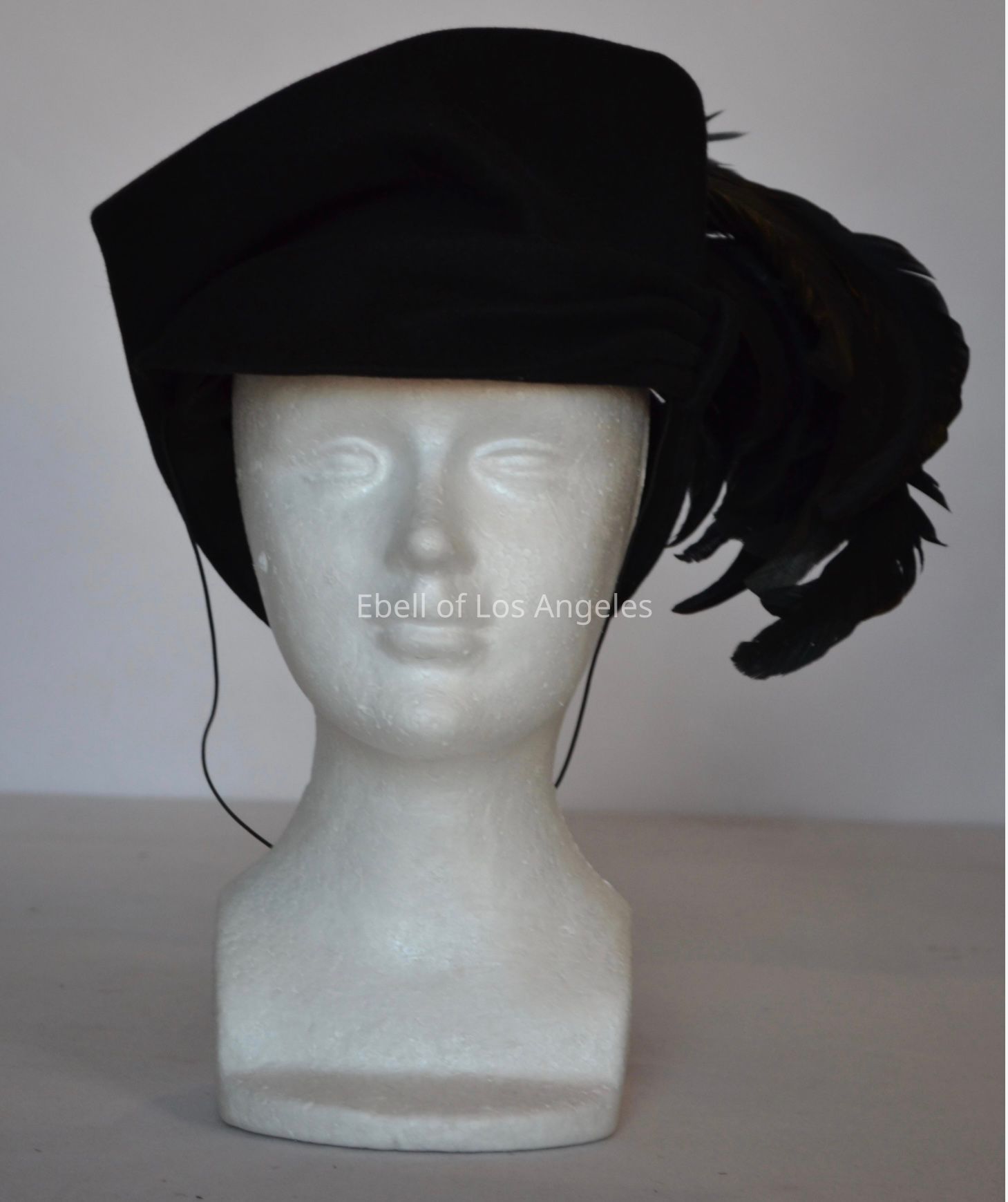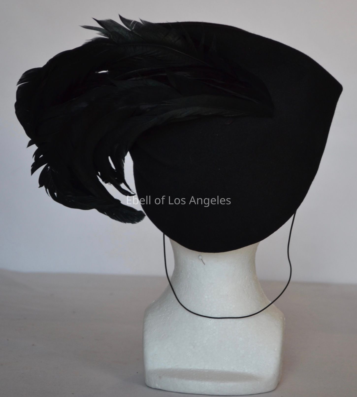 Felt hat with narrow front brim, high crown with large feathers at left sideCollection