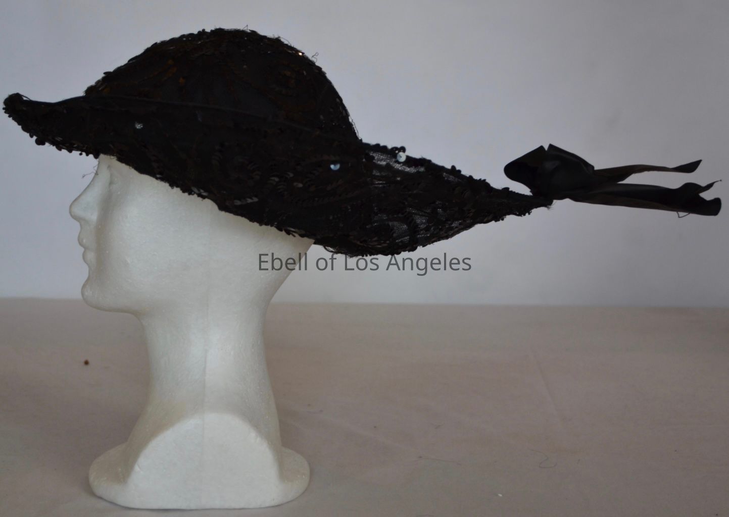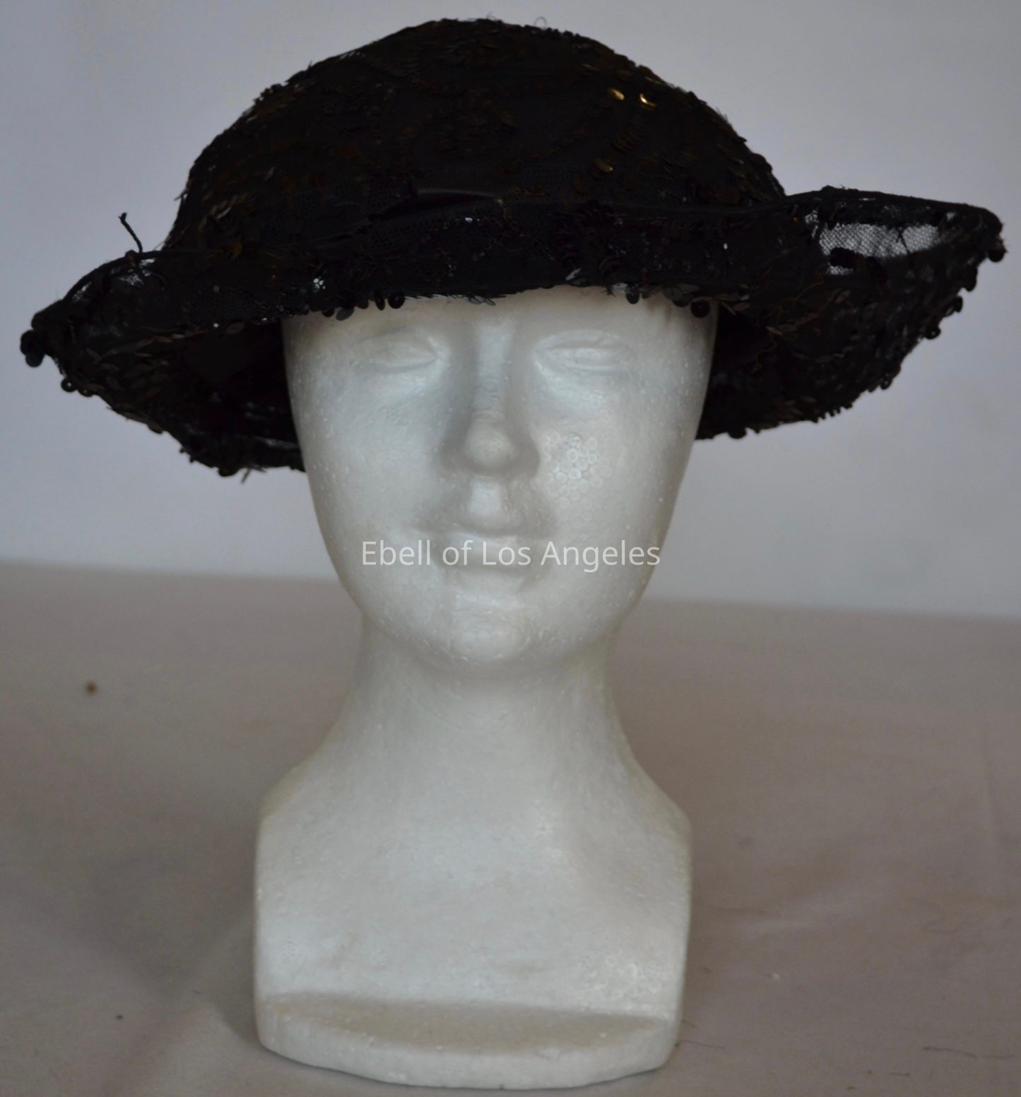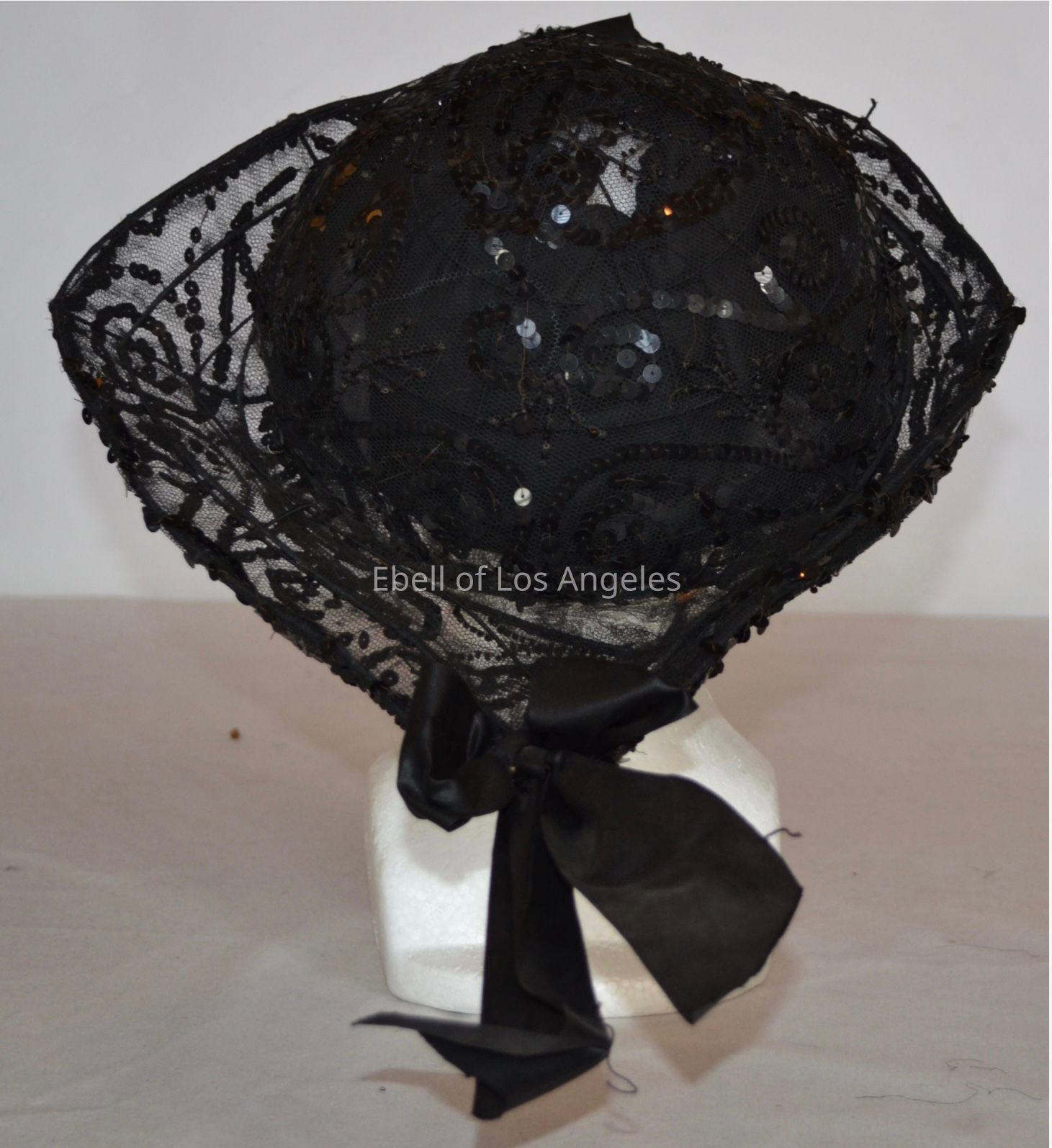 Sequin and beaded netting hat with turned up brim extending to a point in the back, embellished with a bowEntry/Object ID