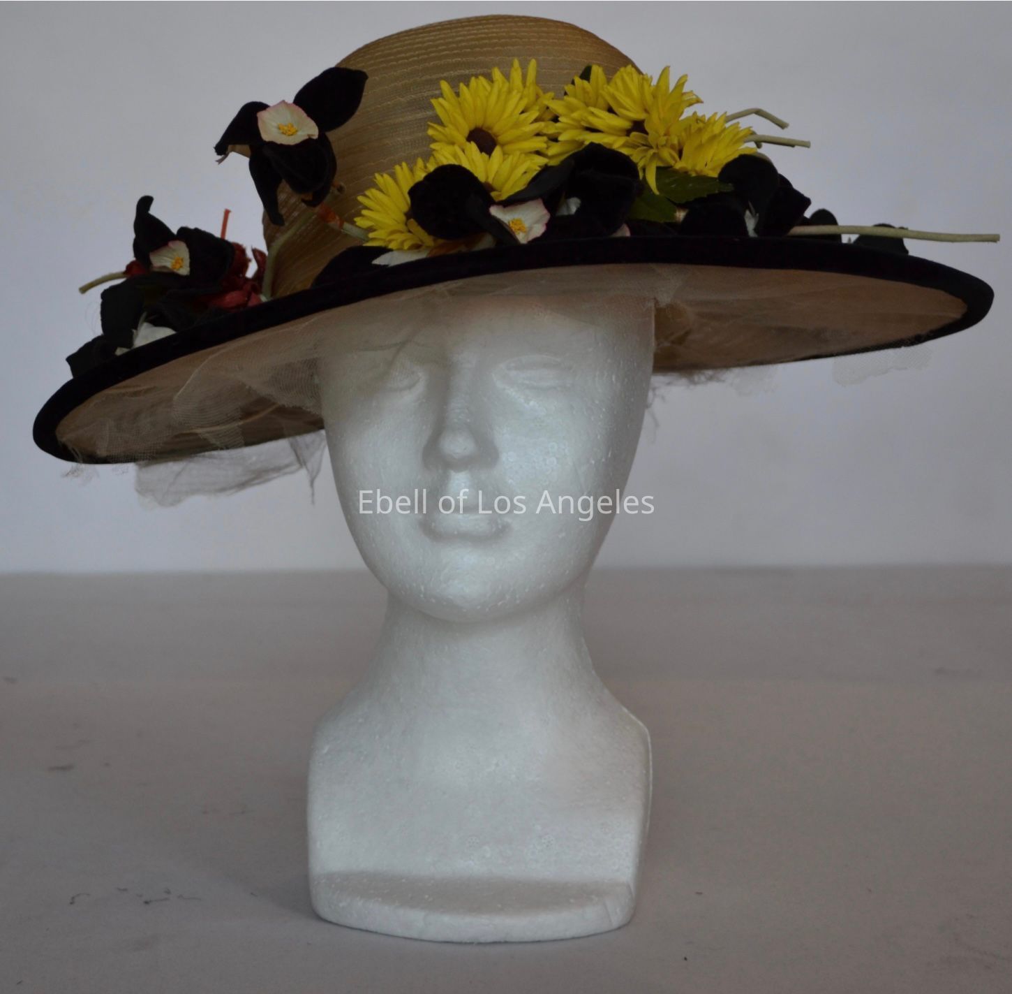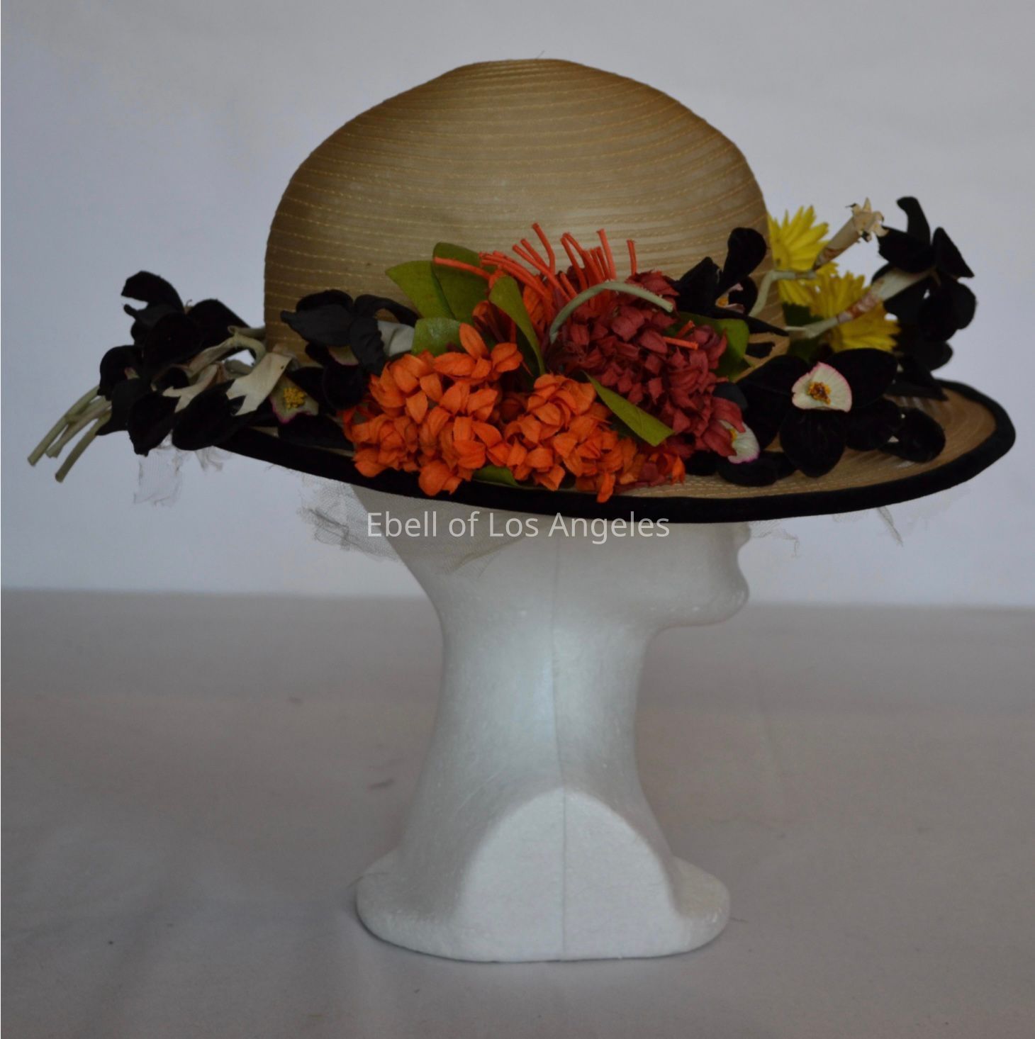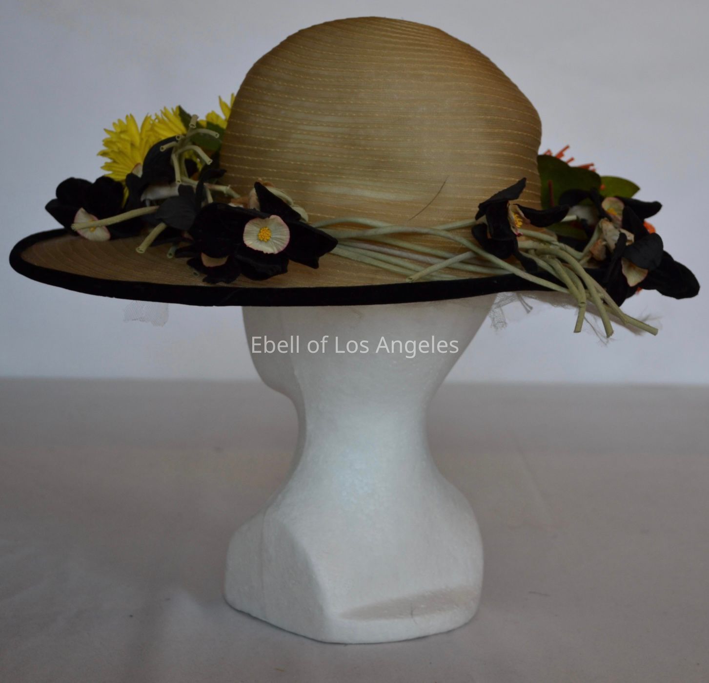 Wide brim straw hat with velvet trim on brim edge and faux flowers circling crownEntry/Object ID