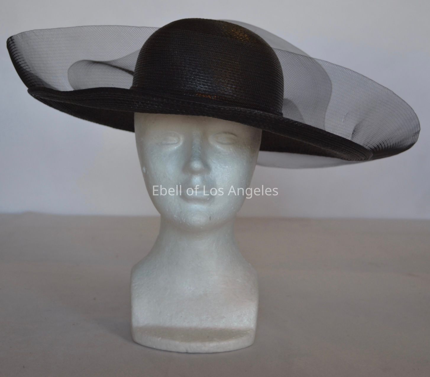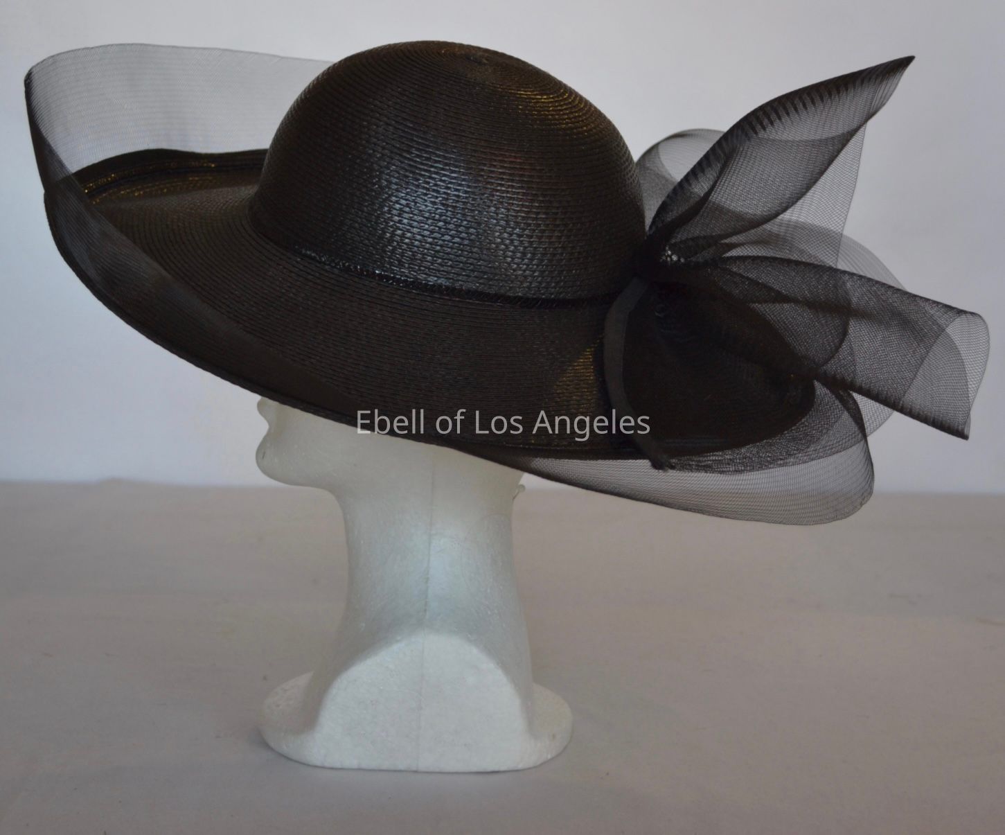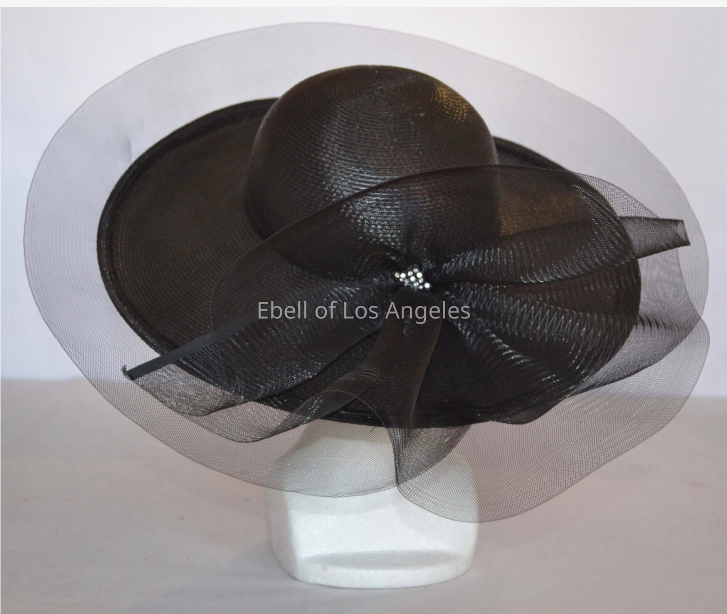 Straw wide brimmed hat with netting around brim and rhinestone pinCollection