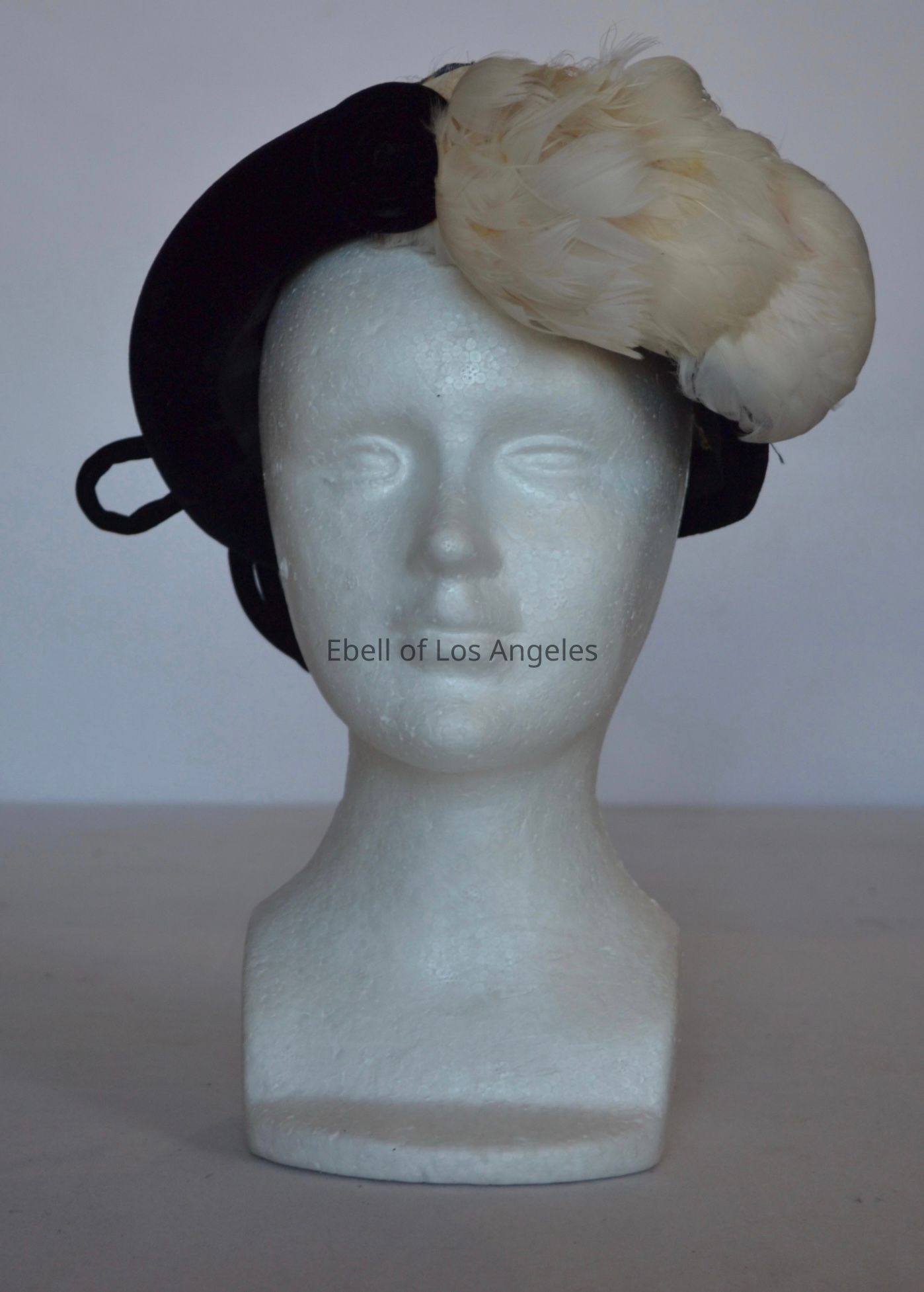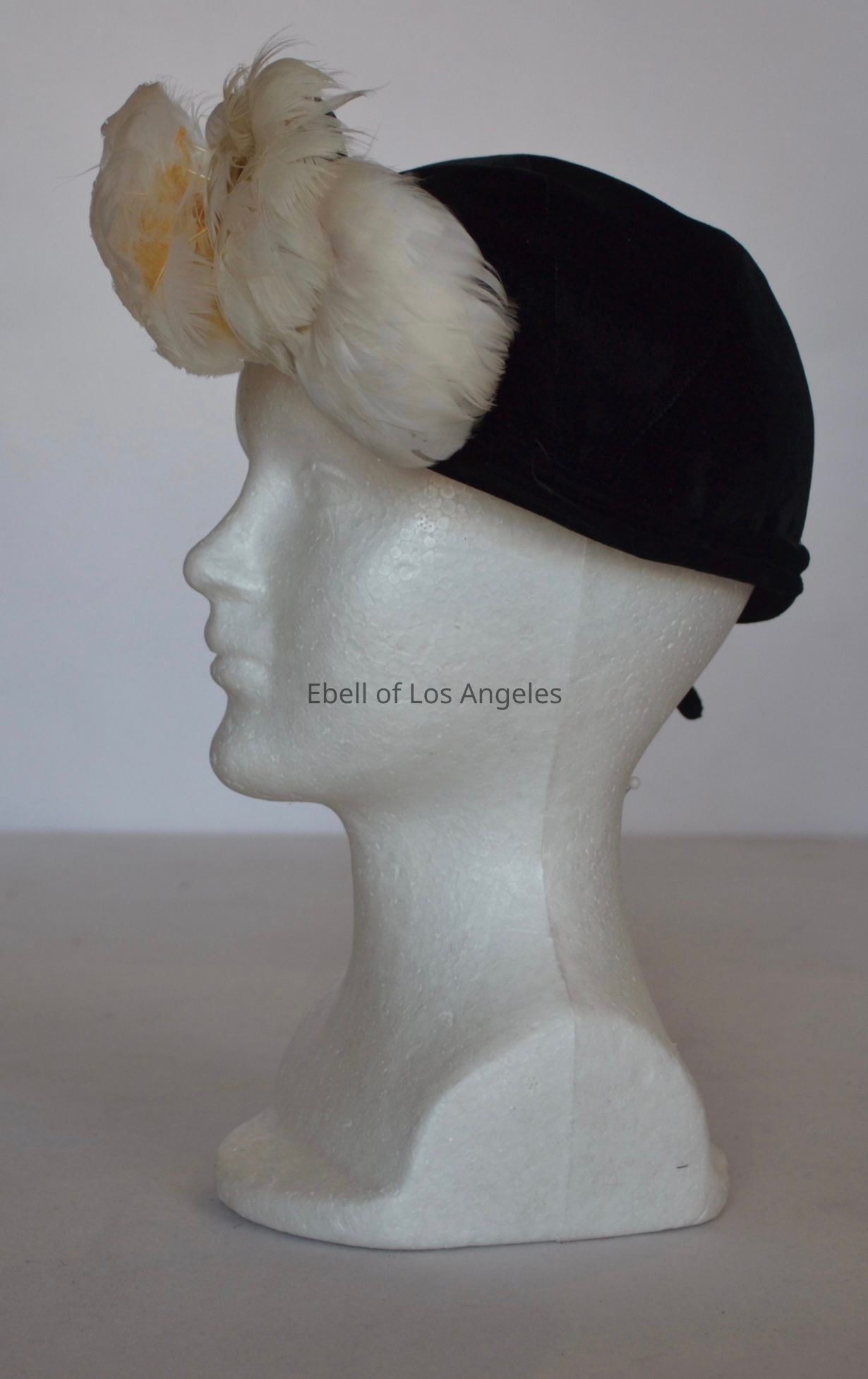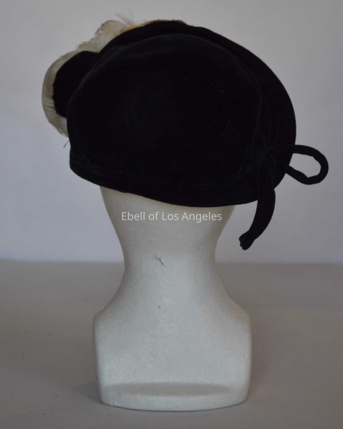 Velvet casque with narrow brim and white feather embellishment on left front, velvet cording bowCollection