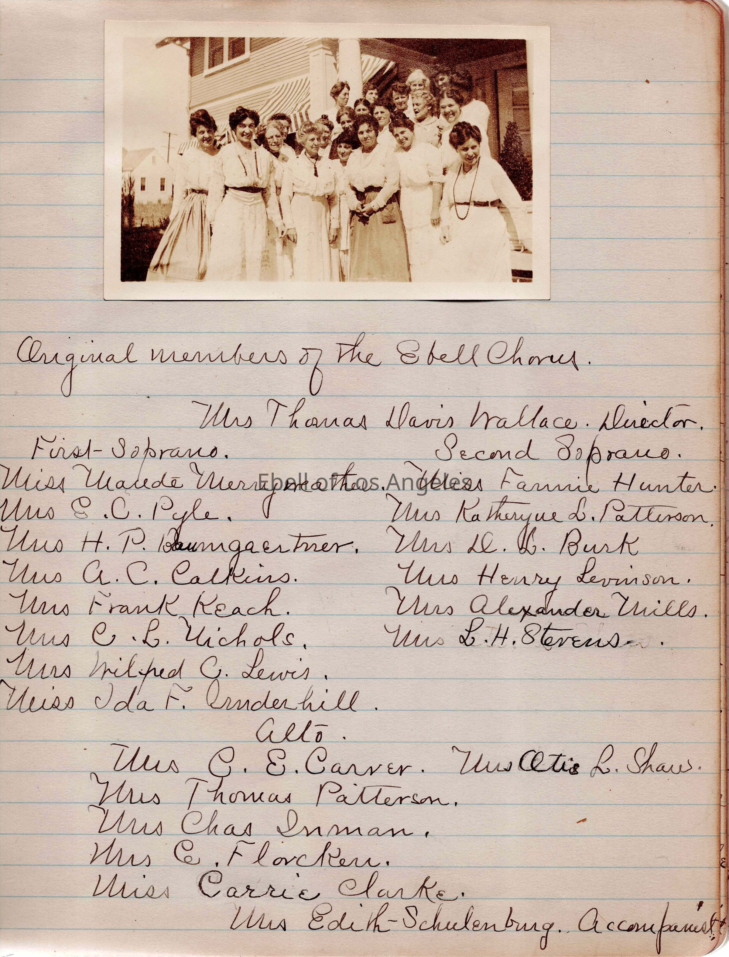 Choral Department minutes. 1 book with photograph of original members, a letter addressed to Mrs. M. E. Hammond with a pamphlet on Soprano Carlotta Russell, programs for The Philharmonic Trio and the Ebell Chorus MusicaleDate(s) of Creation
