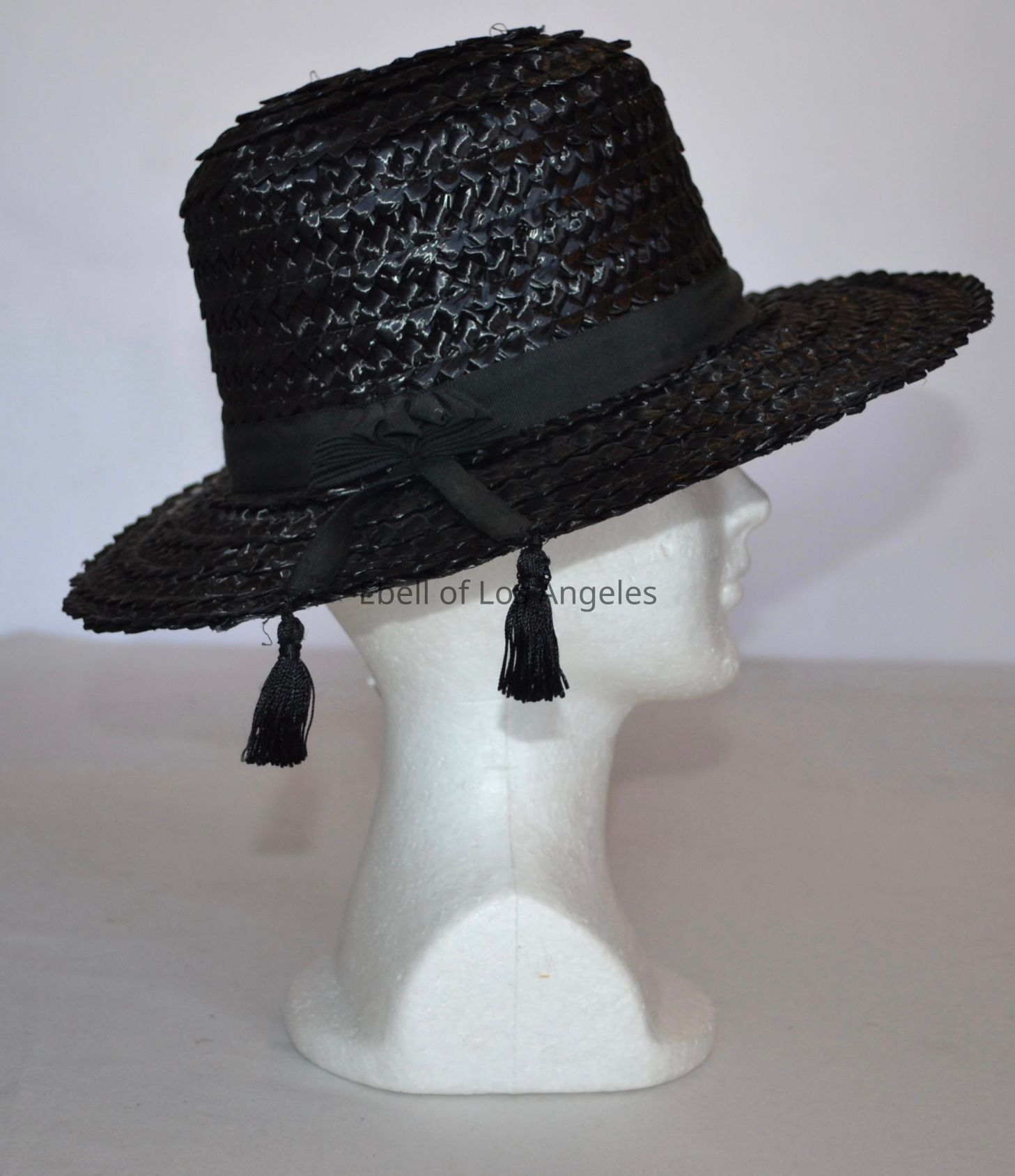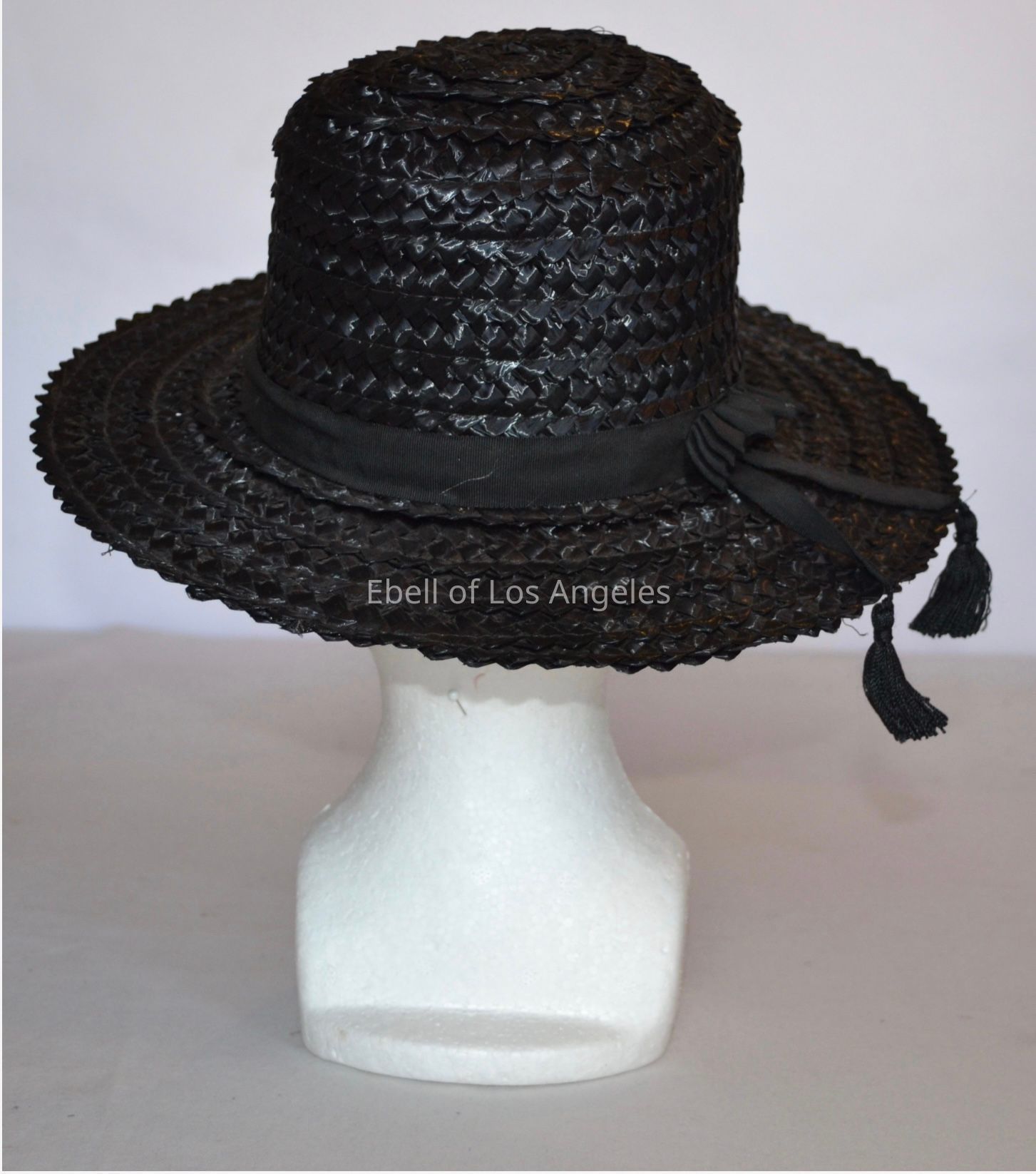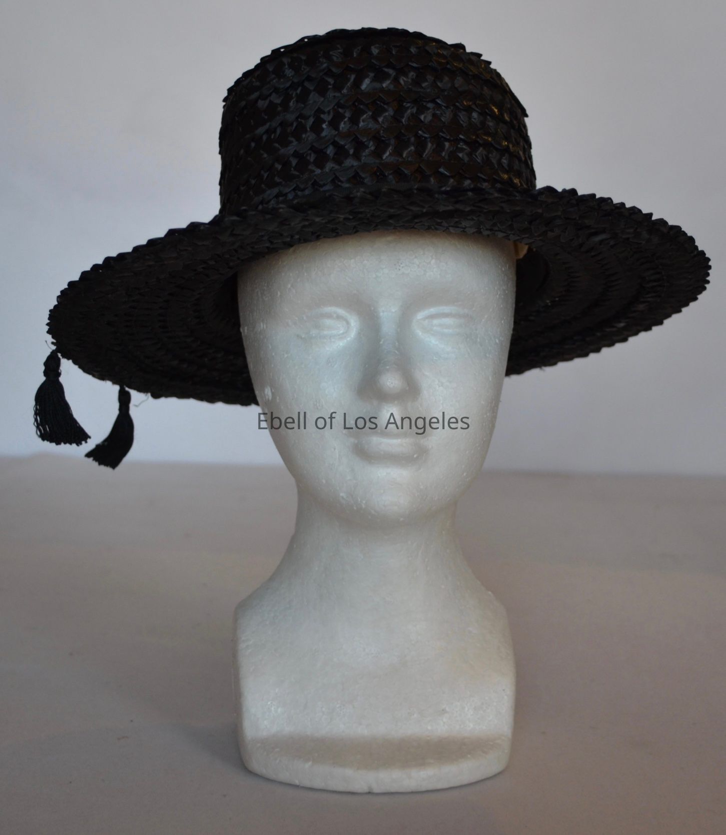 Straw basket weave hat with wide brim, grosgrain band and tassels