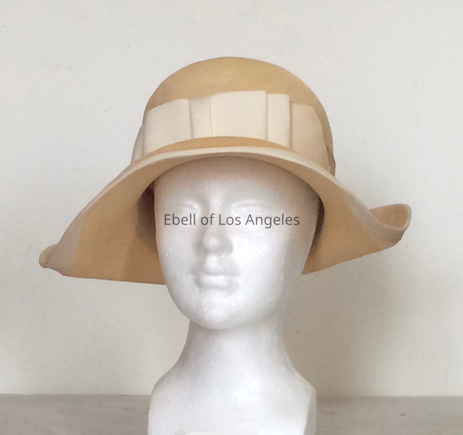 Straw sun hat with beige gros grain bow on crown and trim on brim edgeEntry/Object ID