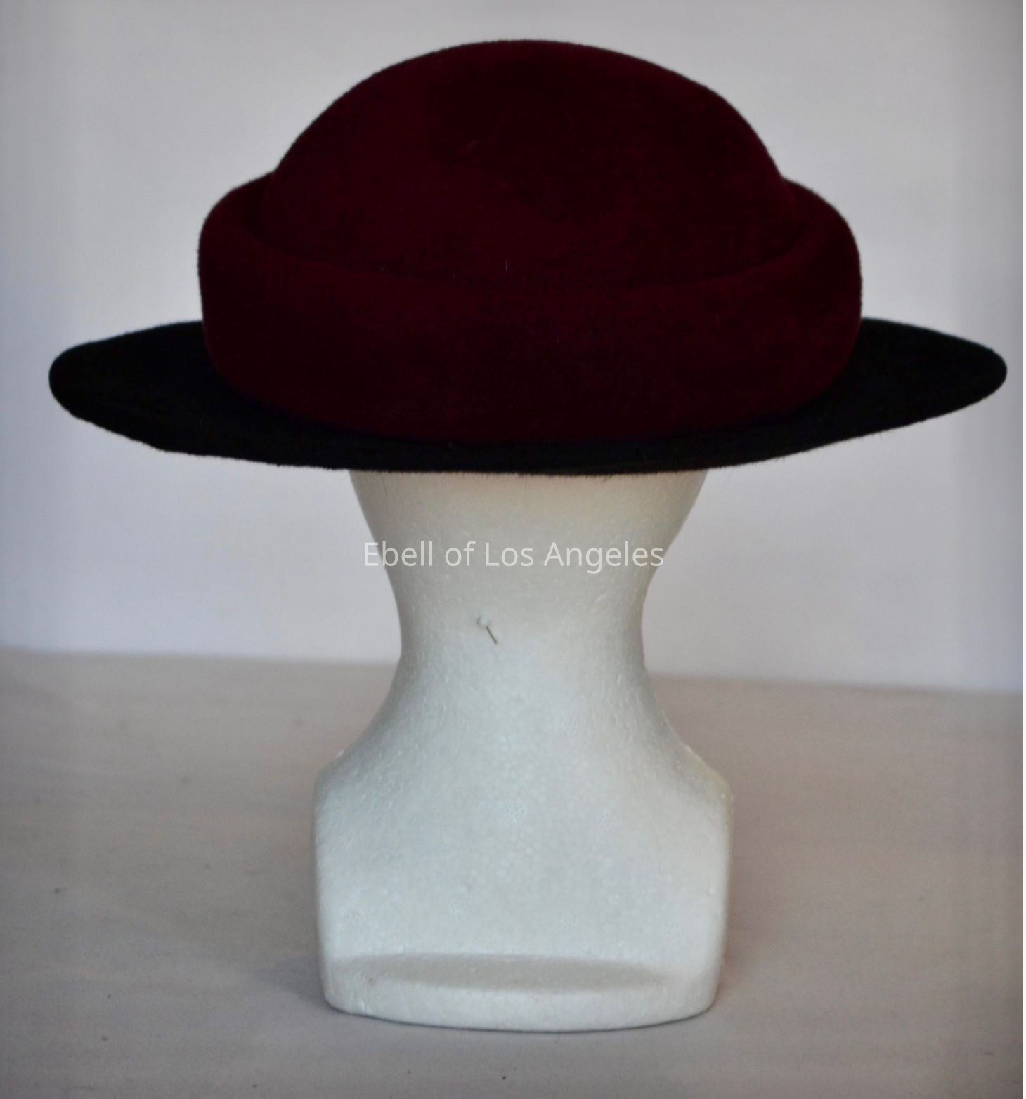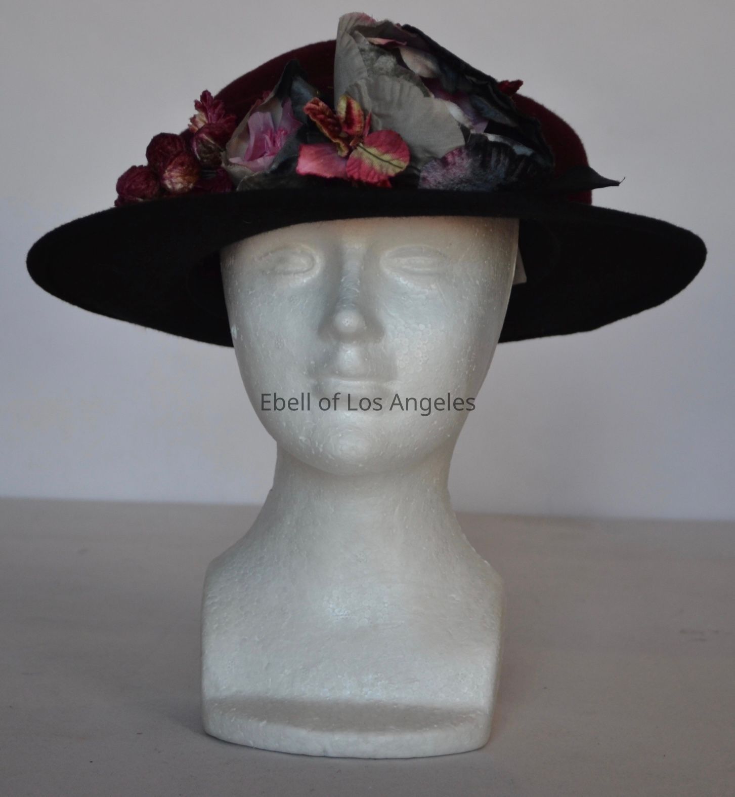 Dark red crown with black brim and cluster of faux flowersEntry/Object ID