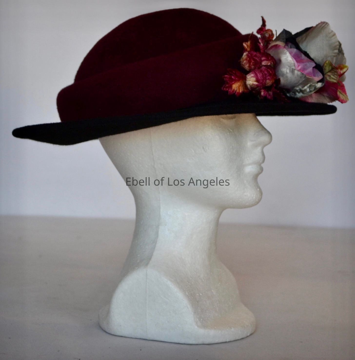 Dark red crown with black brim and cluster of faux flowers at frontCollection