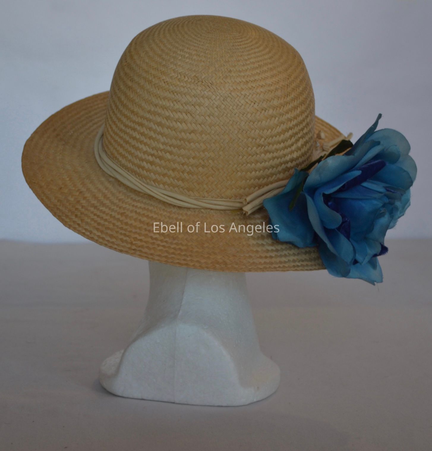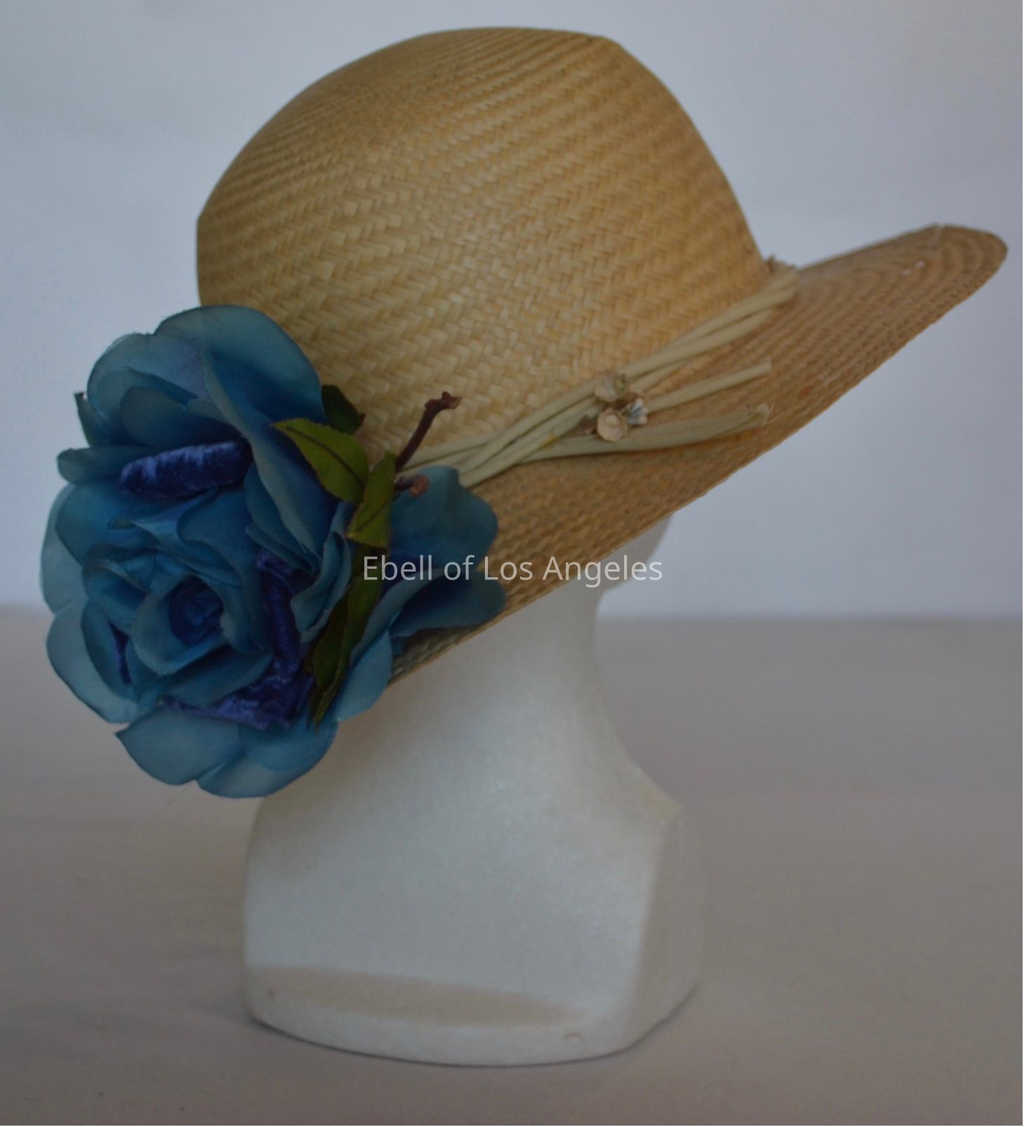 Straw brimmed hat with large blue flowerCollection