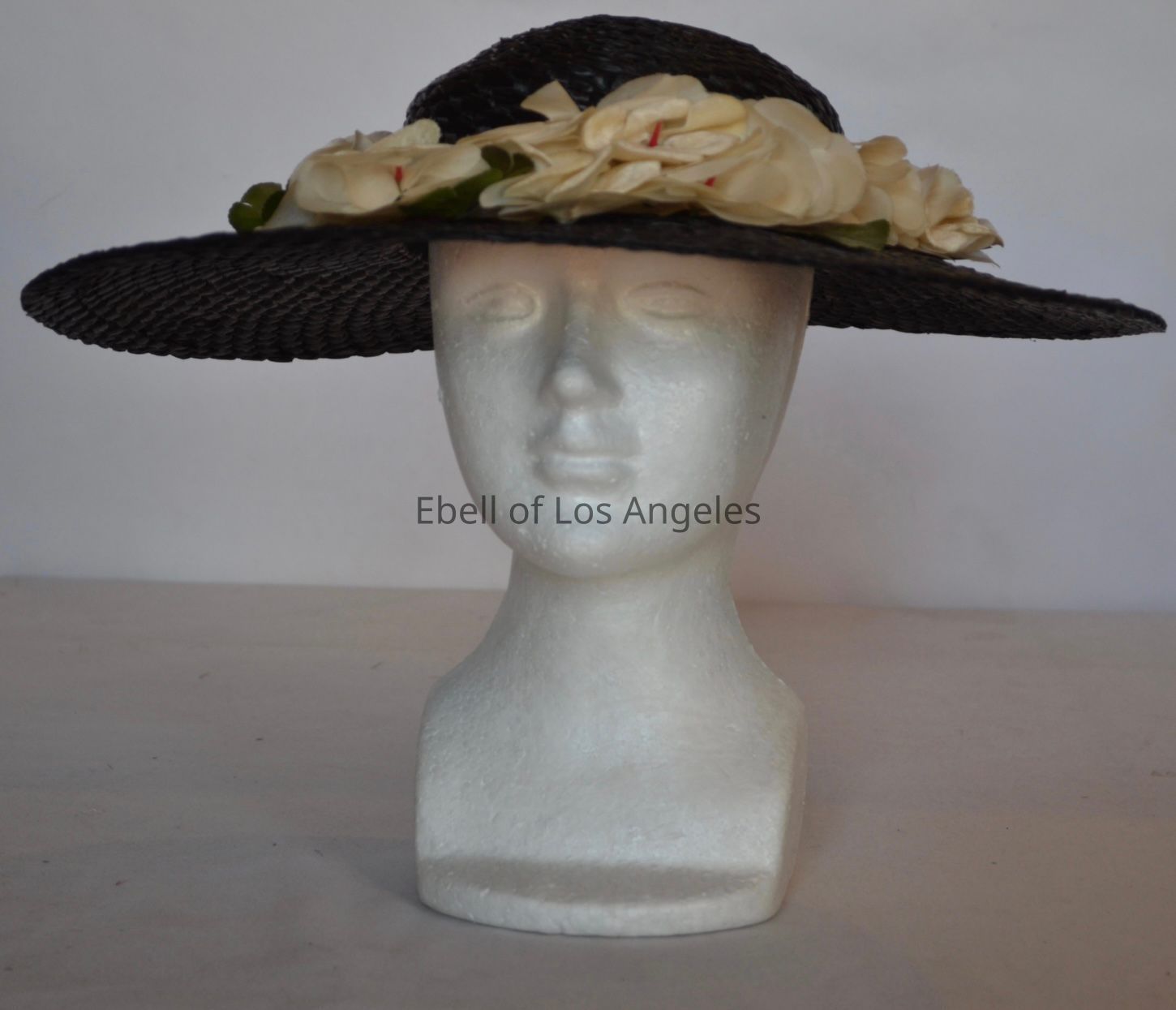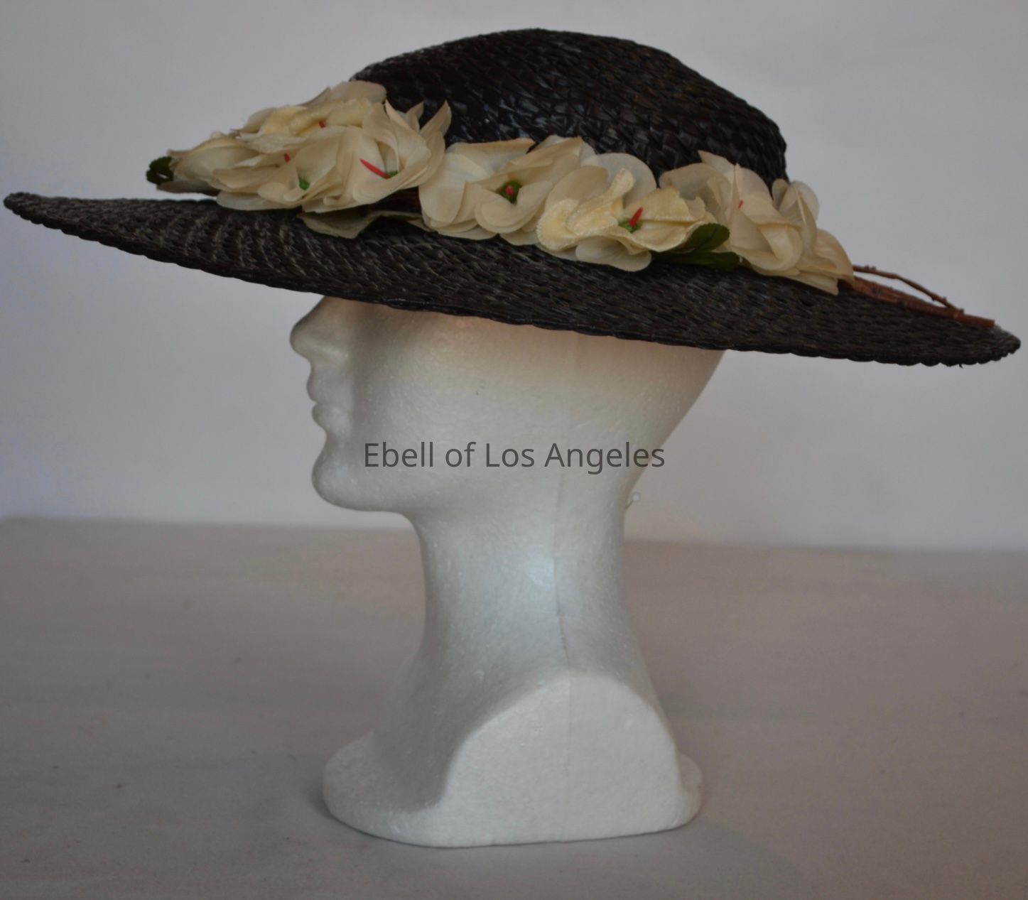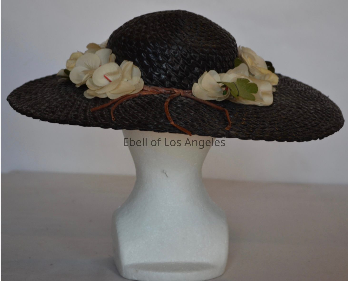 Wide brim straw hat with low crown and white flowers around bandCollection