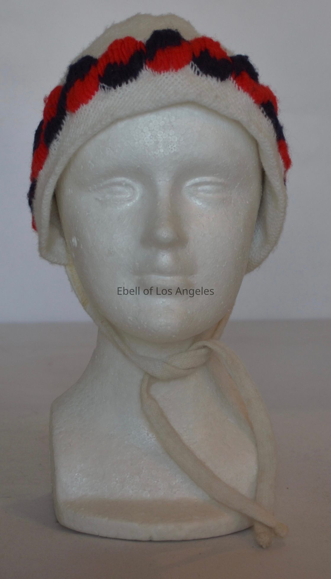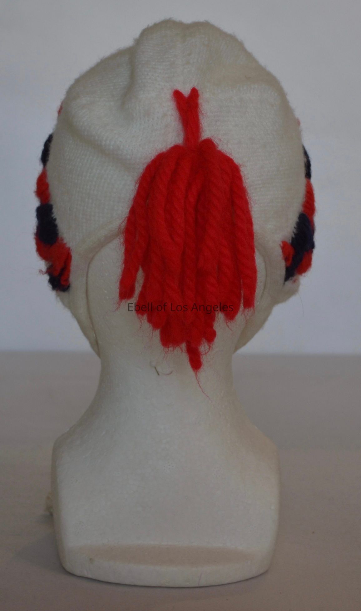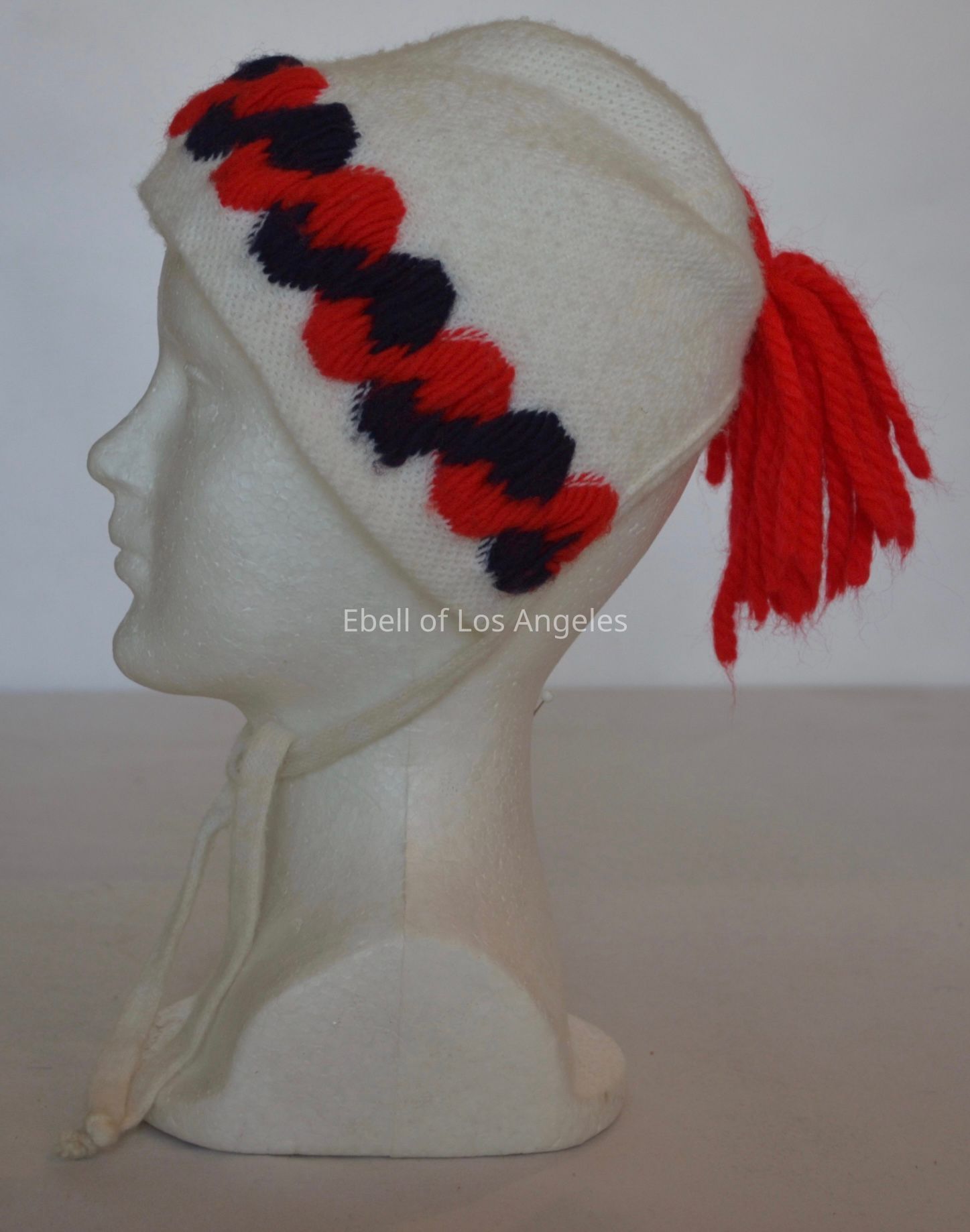 Children's Knit Winter cap with red pom-pom, Navy/Red twist design, with chin tie.