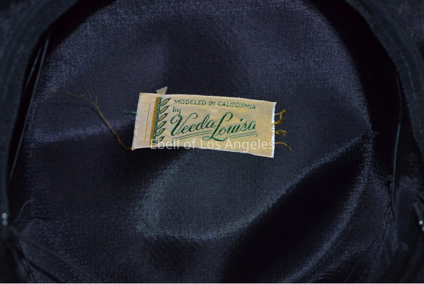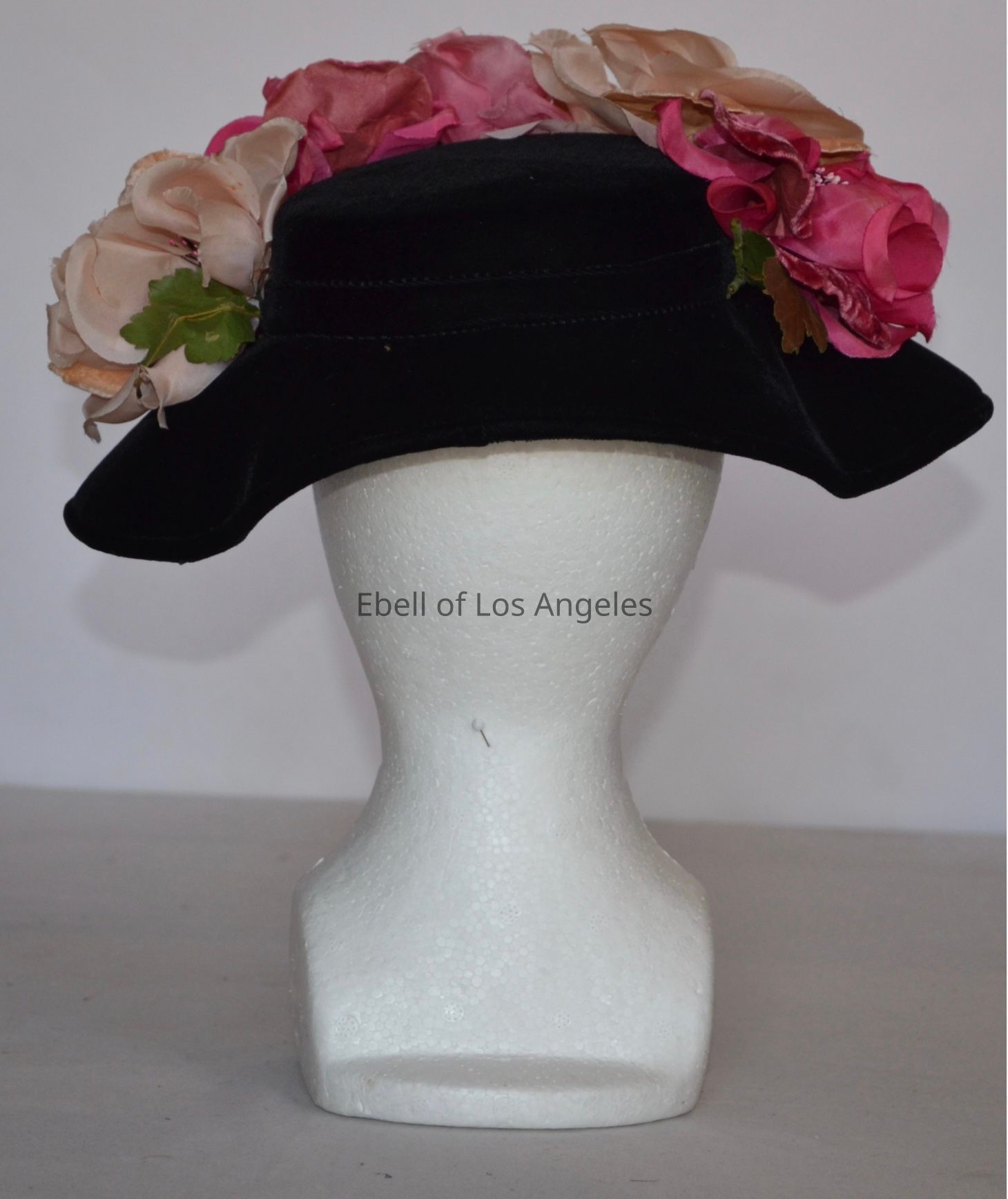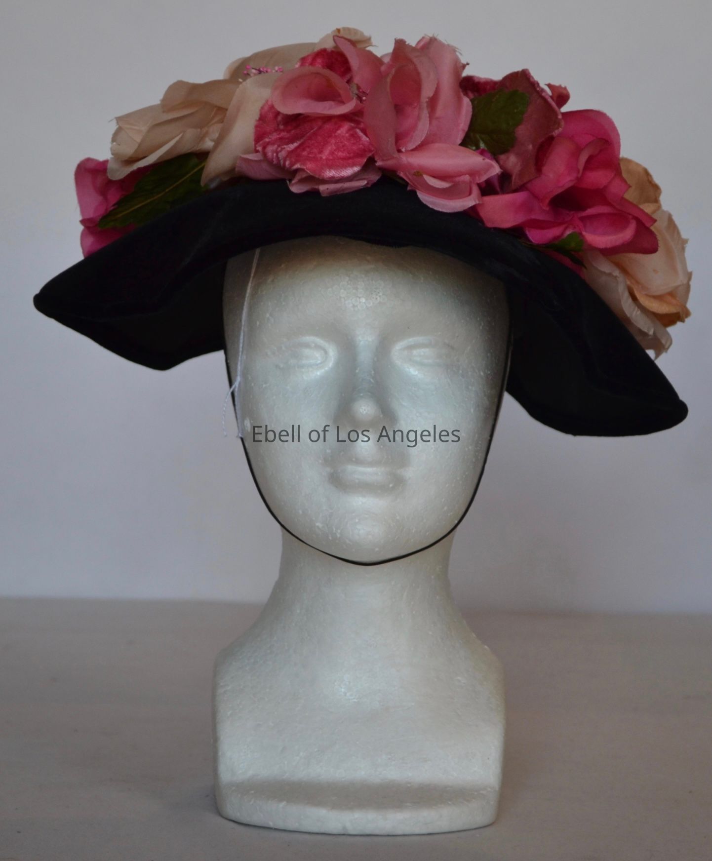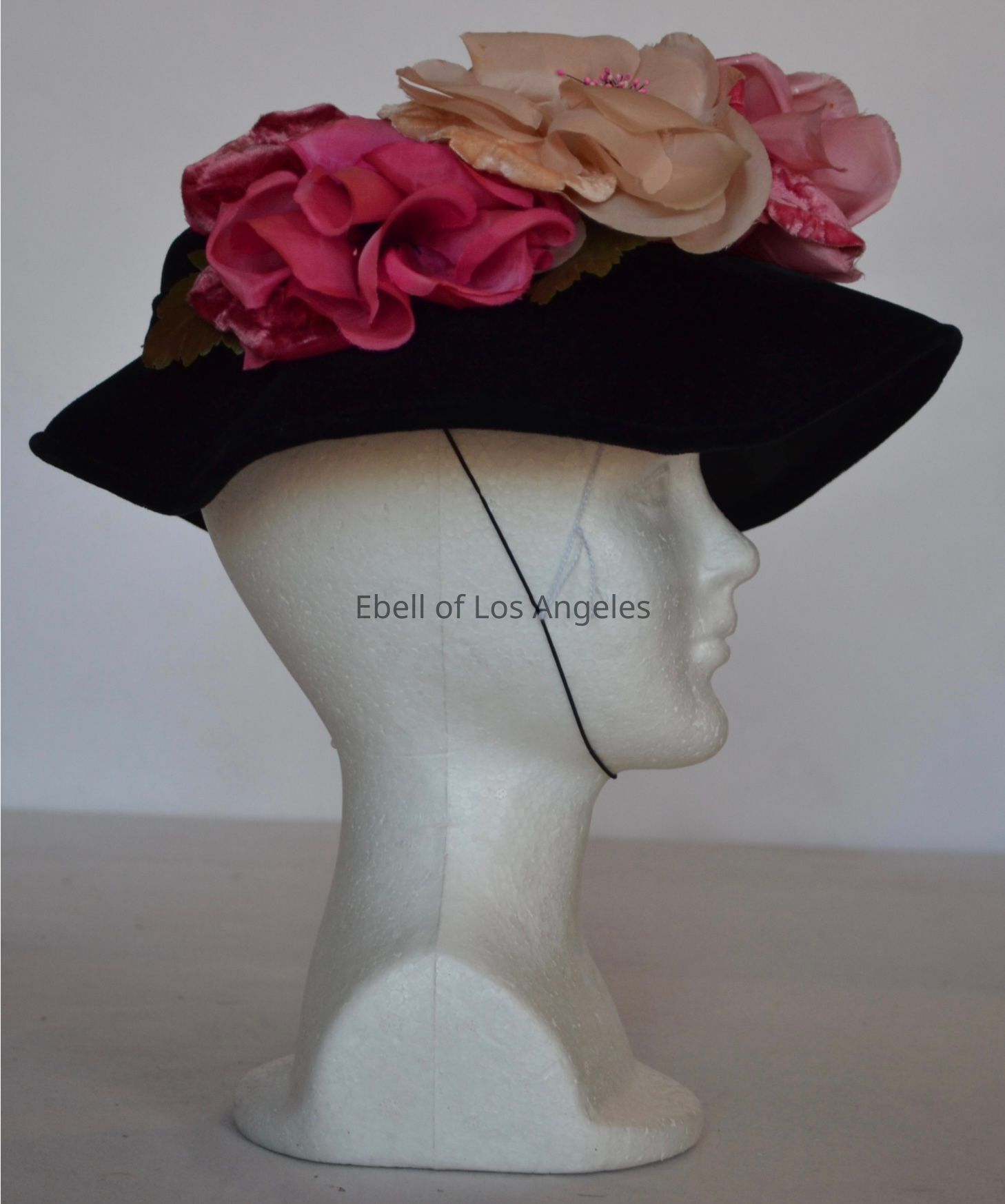 Black velvet brimmed hat with large pink and cream flowers around front brimCollection