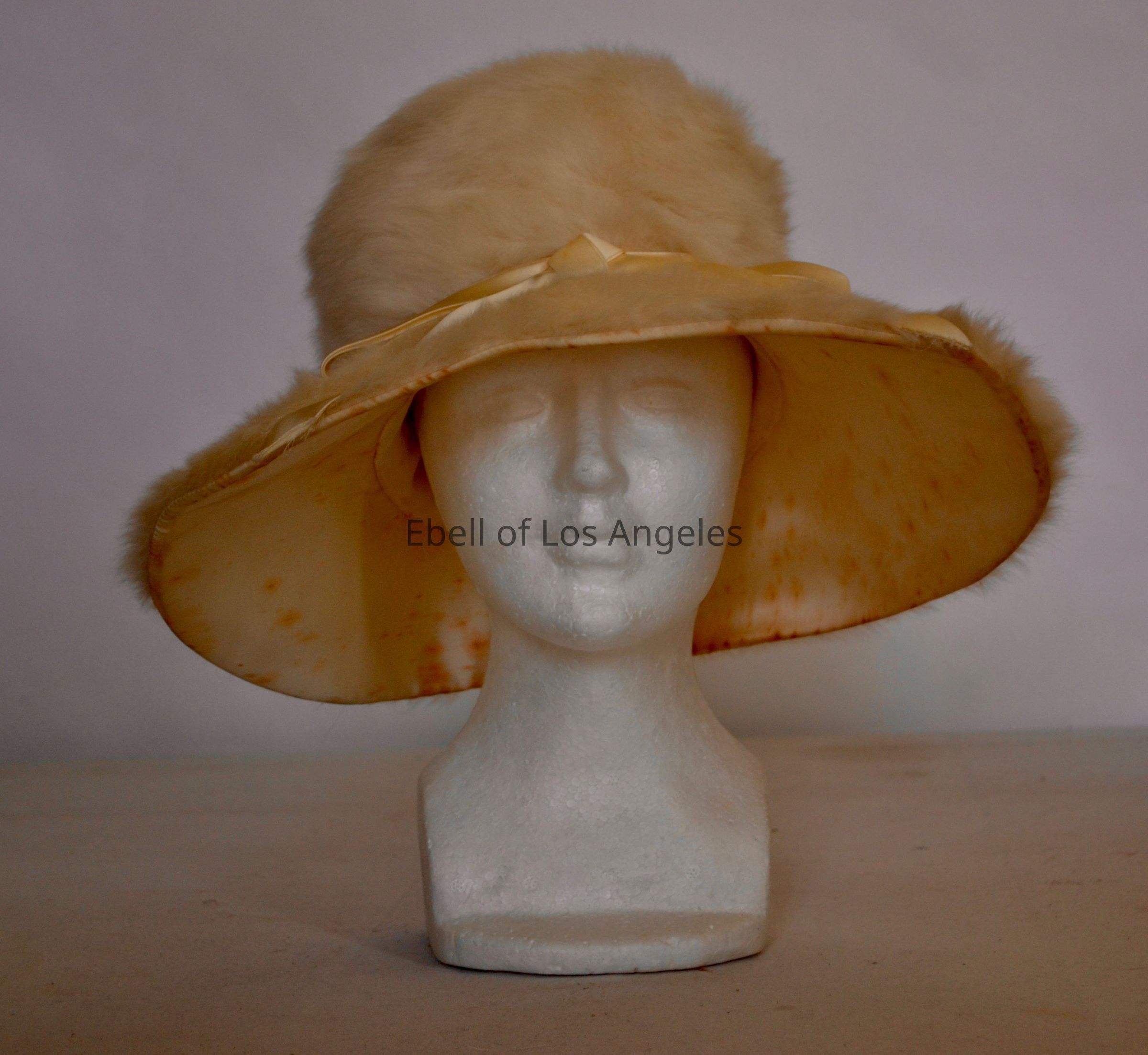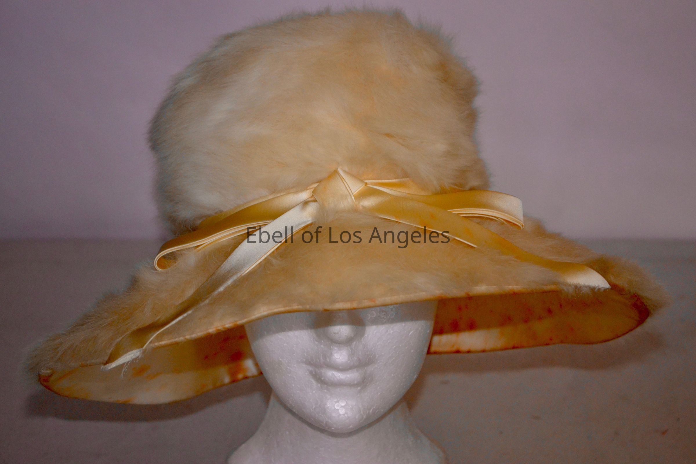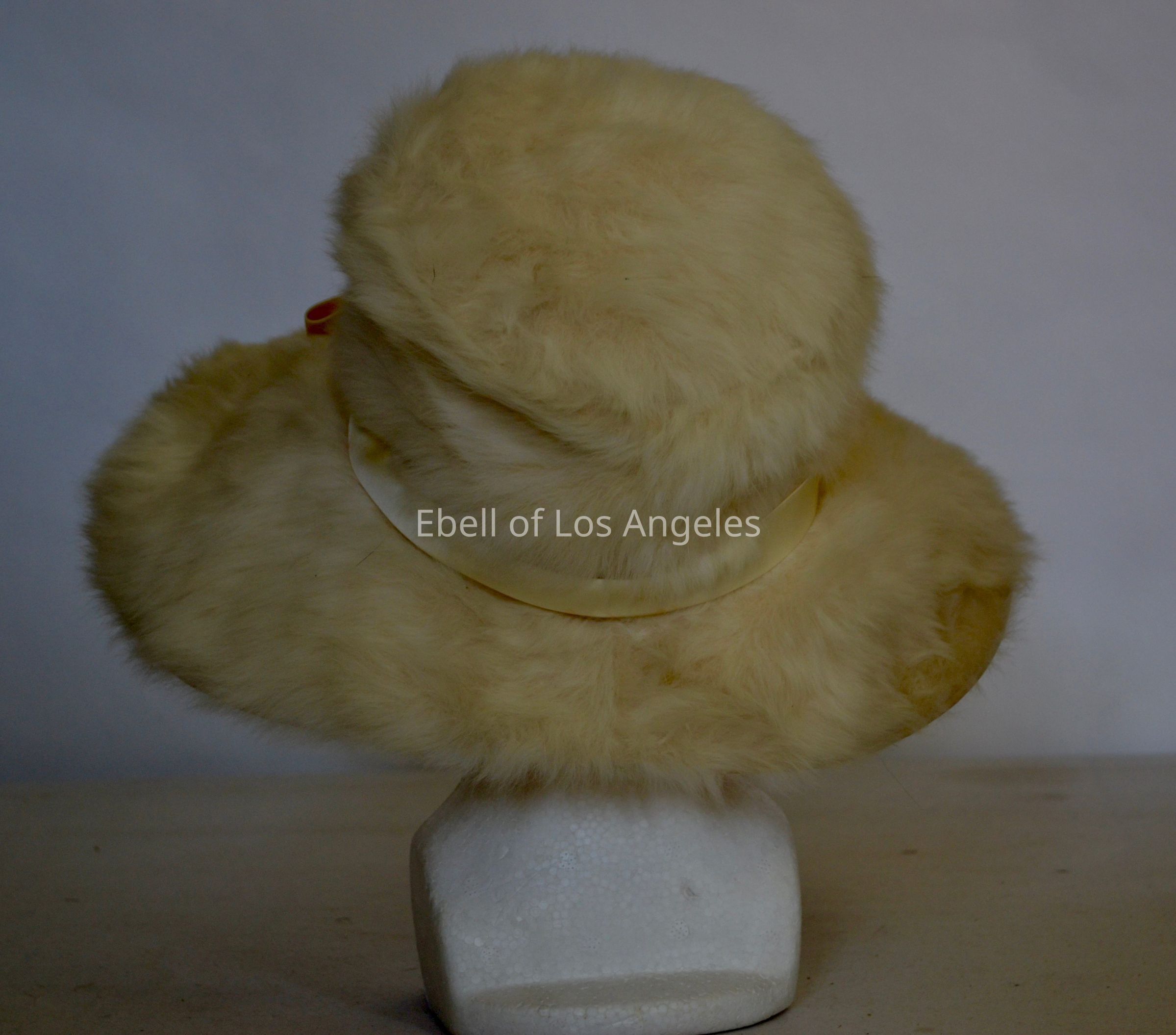 Fur mushroom hat with cream satin ribbon and bow