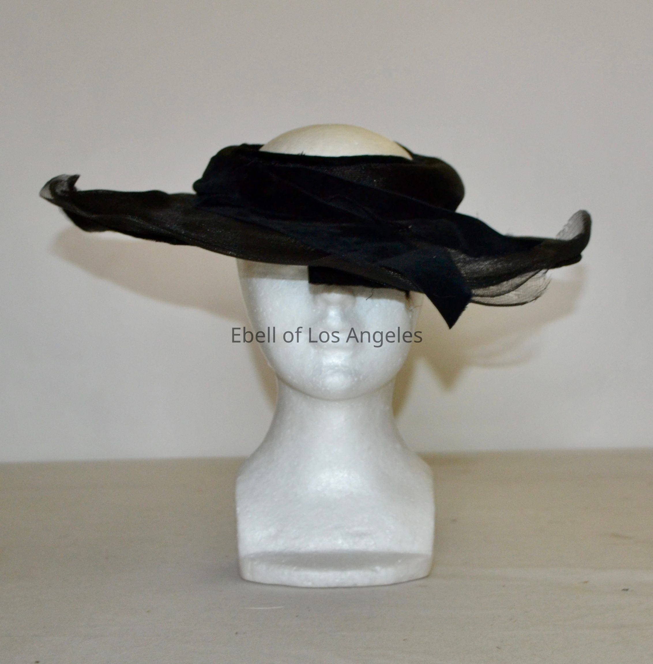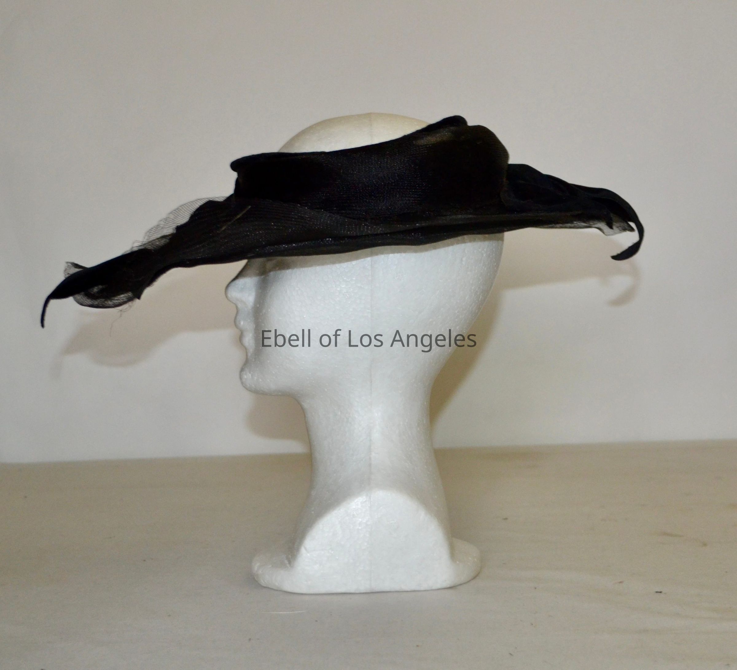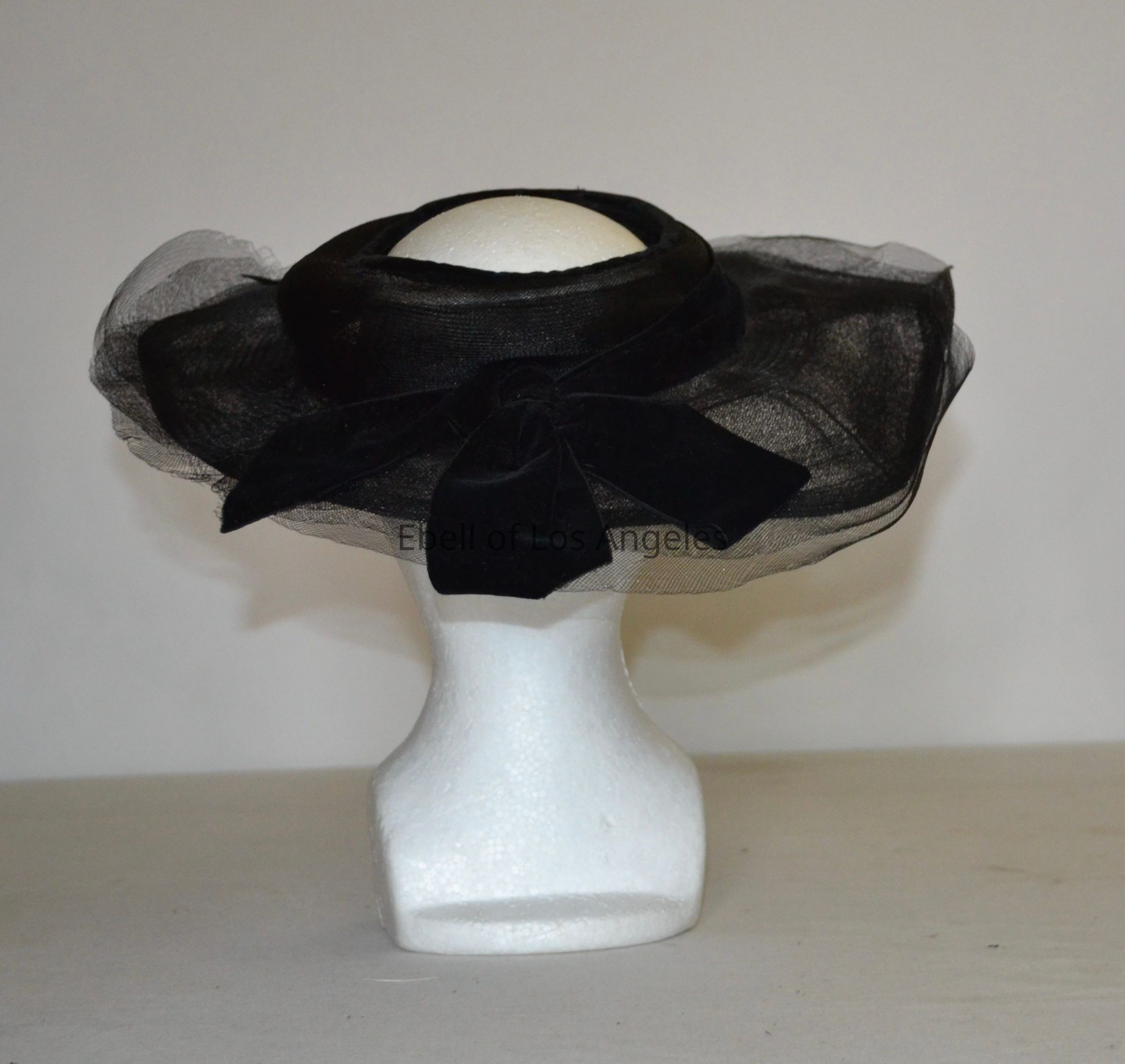 Open crown hat with wide tulle brim and black velvet ribbon band