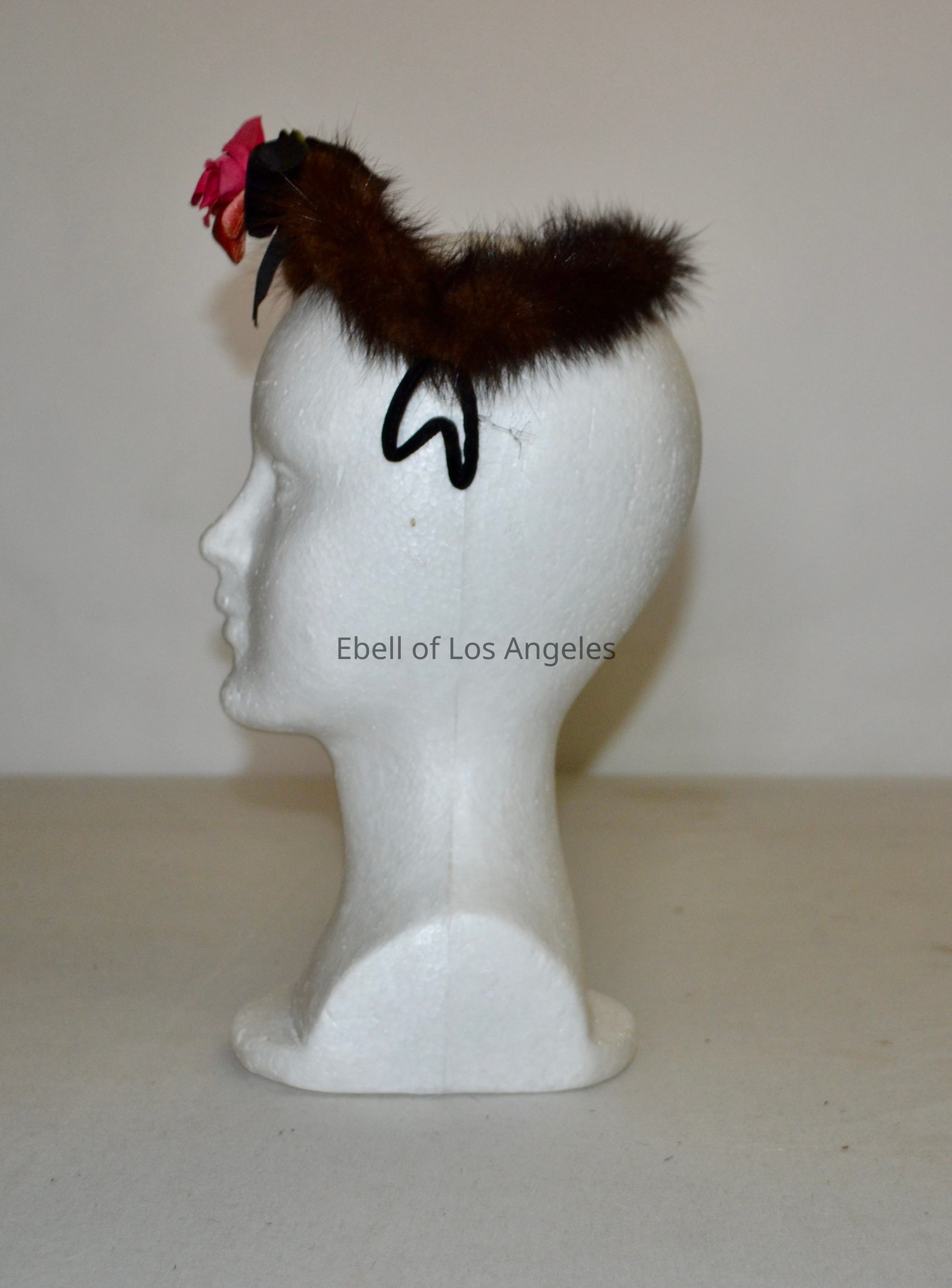 Mink open crown cocktail hat with pink rose and black velvet ribbon
