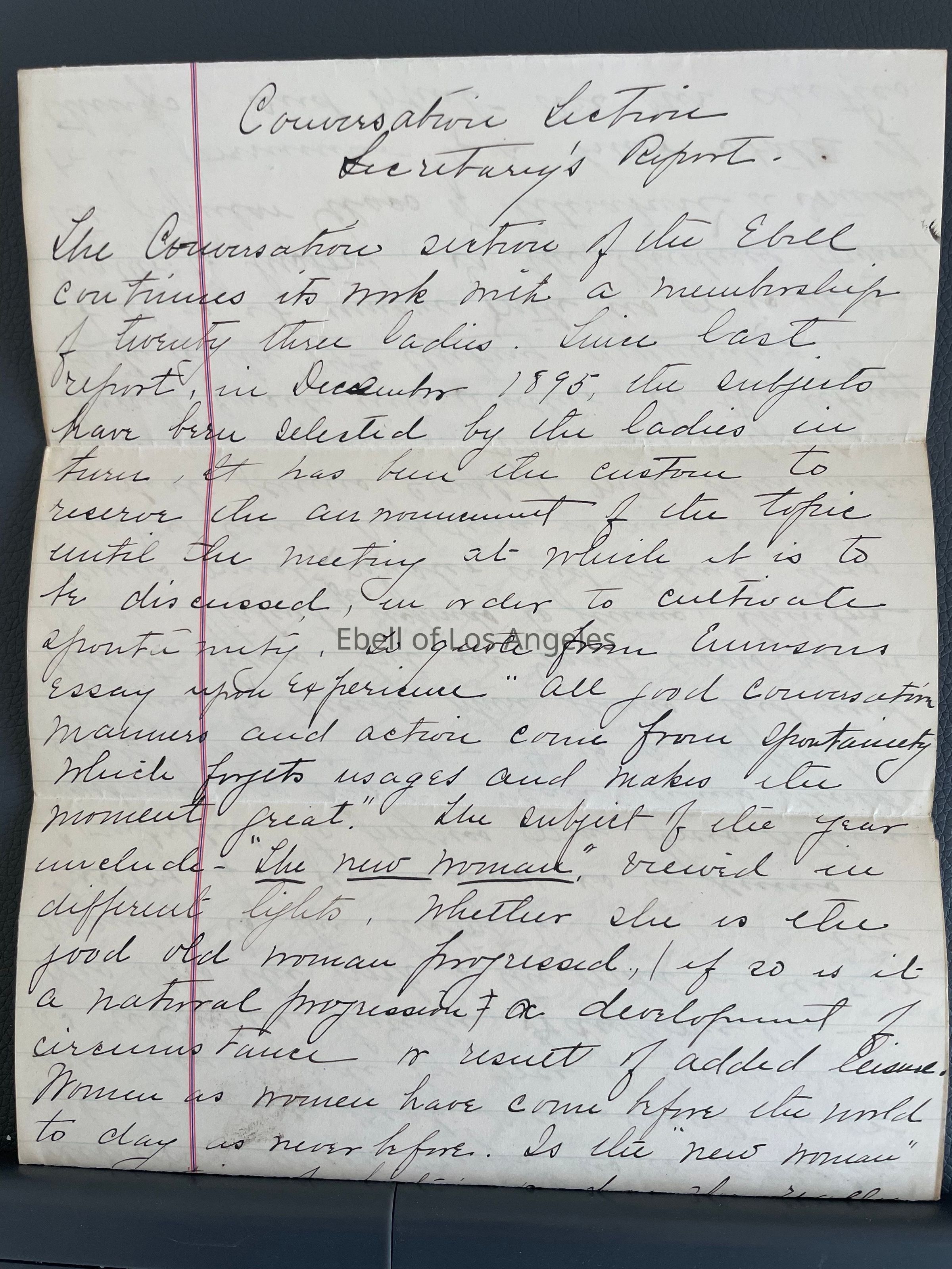 Conversation Section. 1 minute book, Secretary’s Report (handwritten, 2 pages), loose page of minutes.Date(s) of Creation
