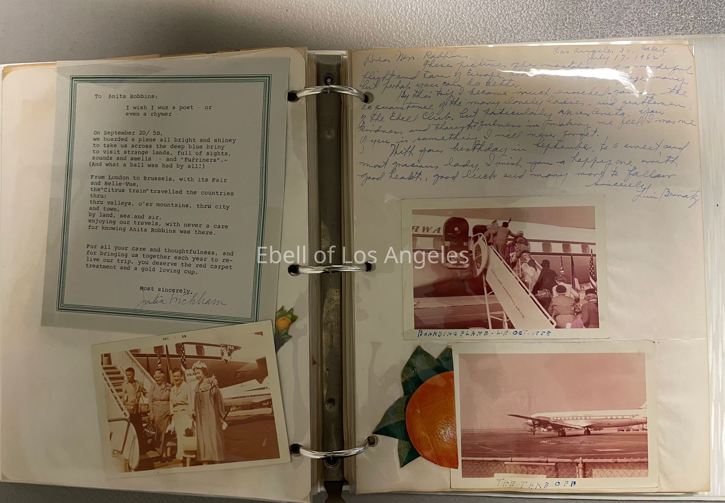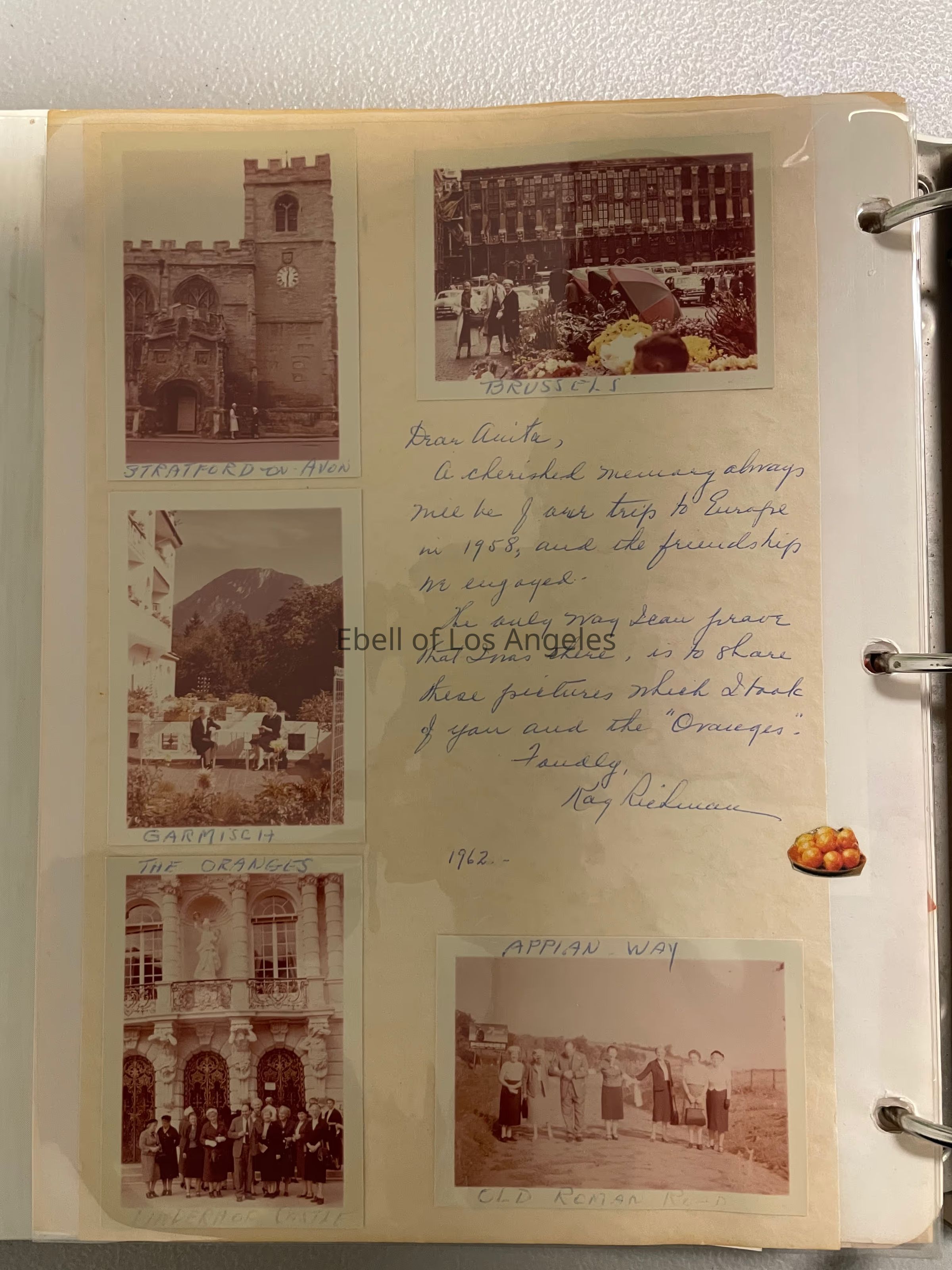 Travel brochures, correspondence, photographs, postcards, sheet music, and poems regarding the Ebell Europe Tour in 1958. Some letters dated 1962.Context