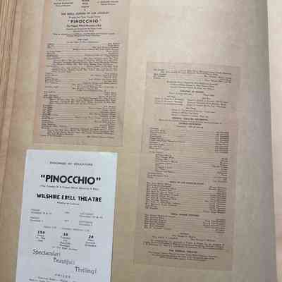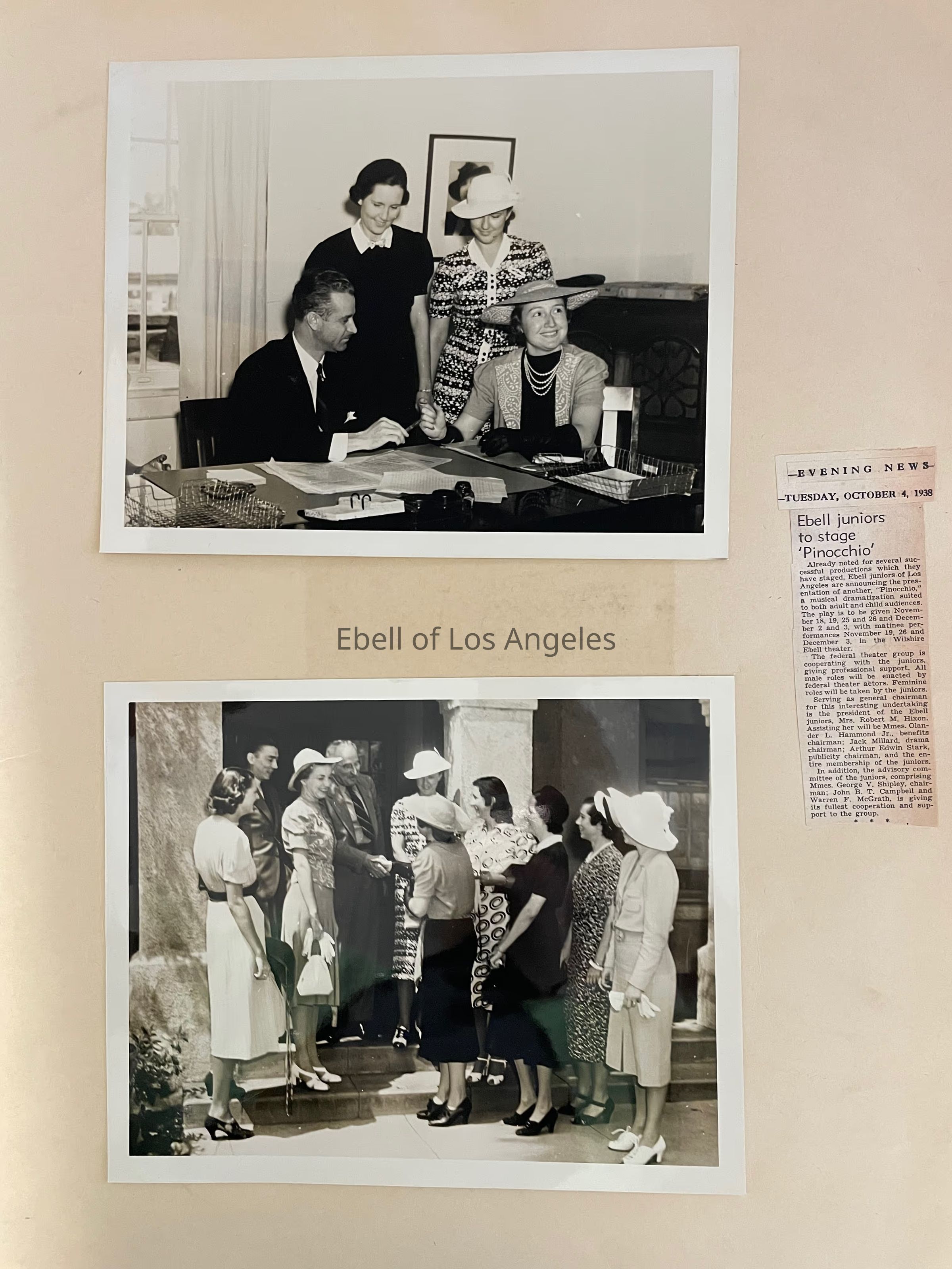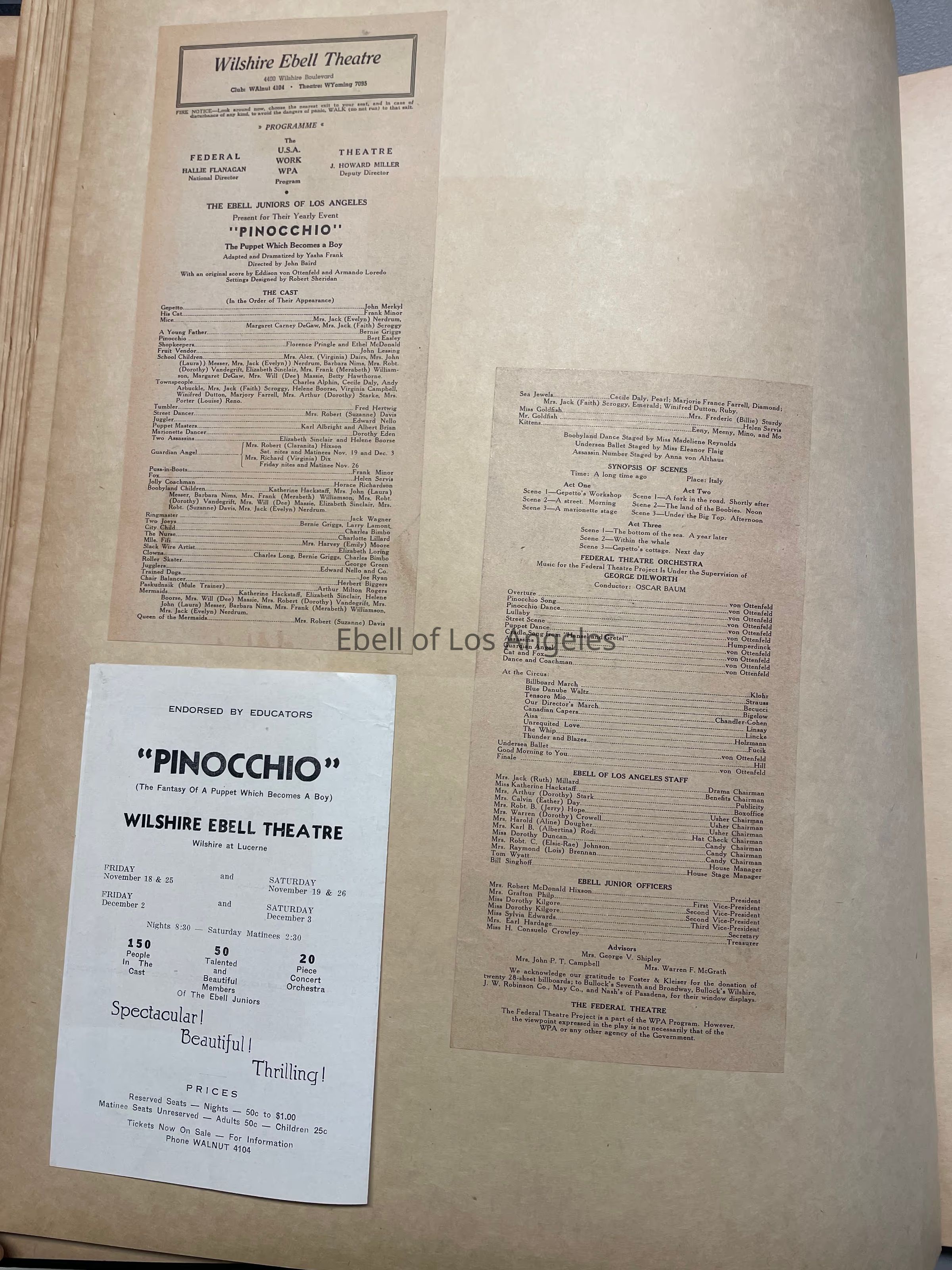 The Ebell Juniors scrapbook containing newspaper clippings, photographs, correspondence, and programs from 1938 to 1943. Includes photo and programs from the Ebell Juniors and Federal Theatre production of Pinocchio in 1938.Context