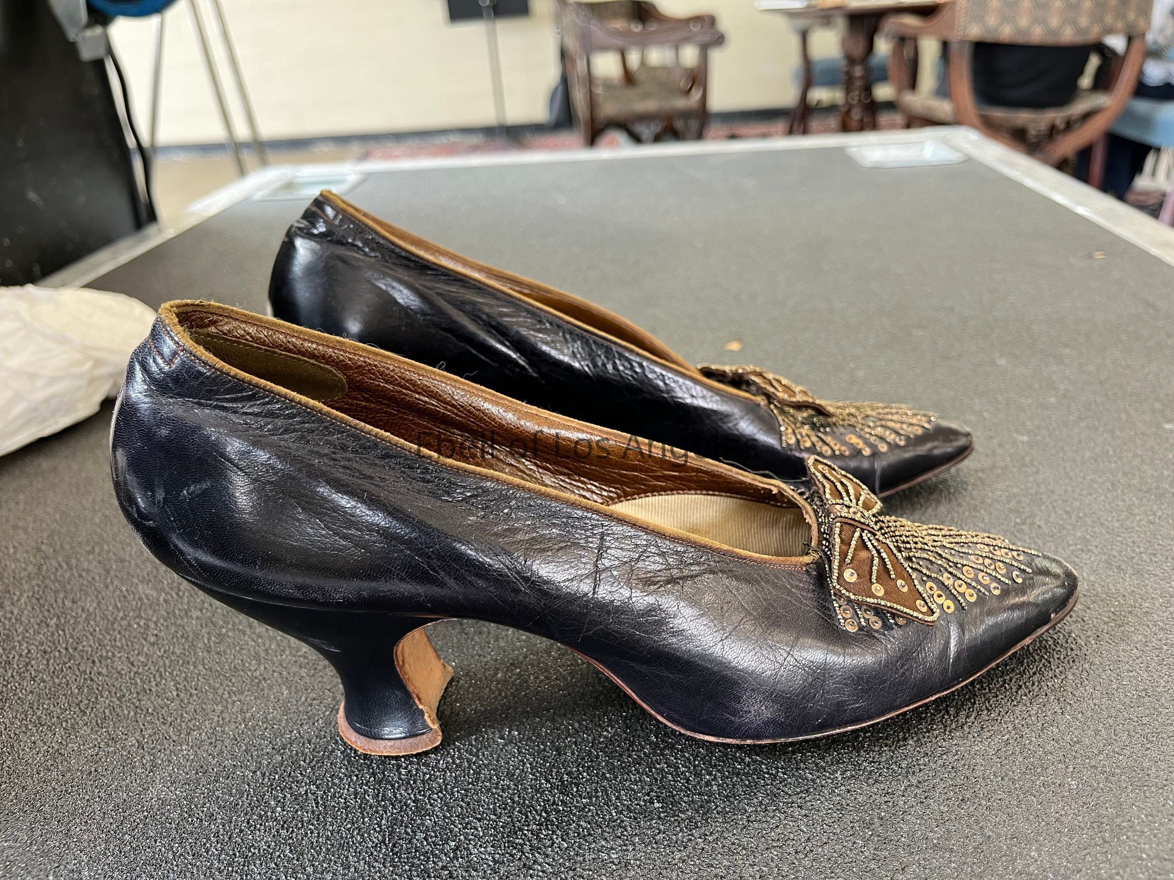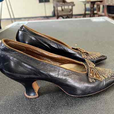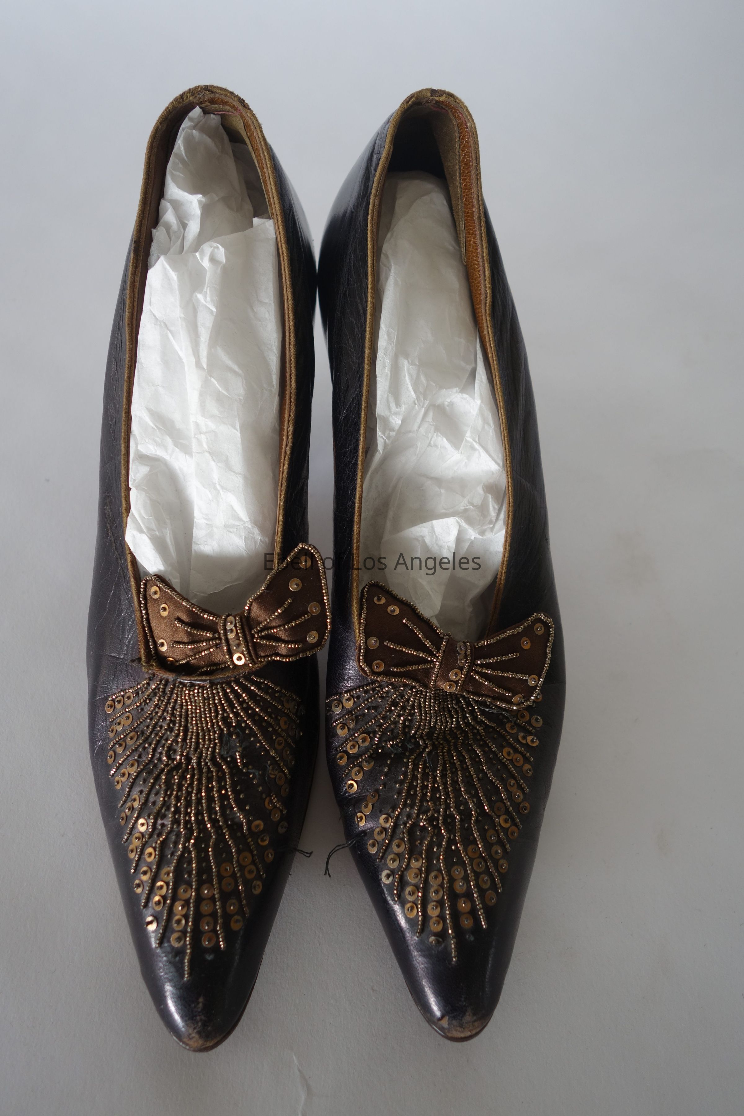 Leather Brown Pump with Beading, Bow and Sequins on Front