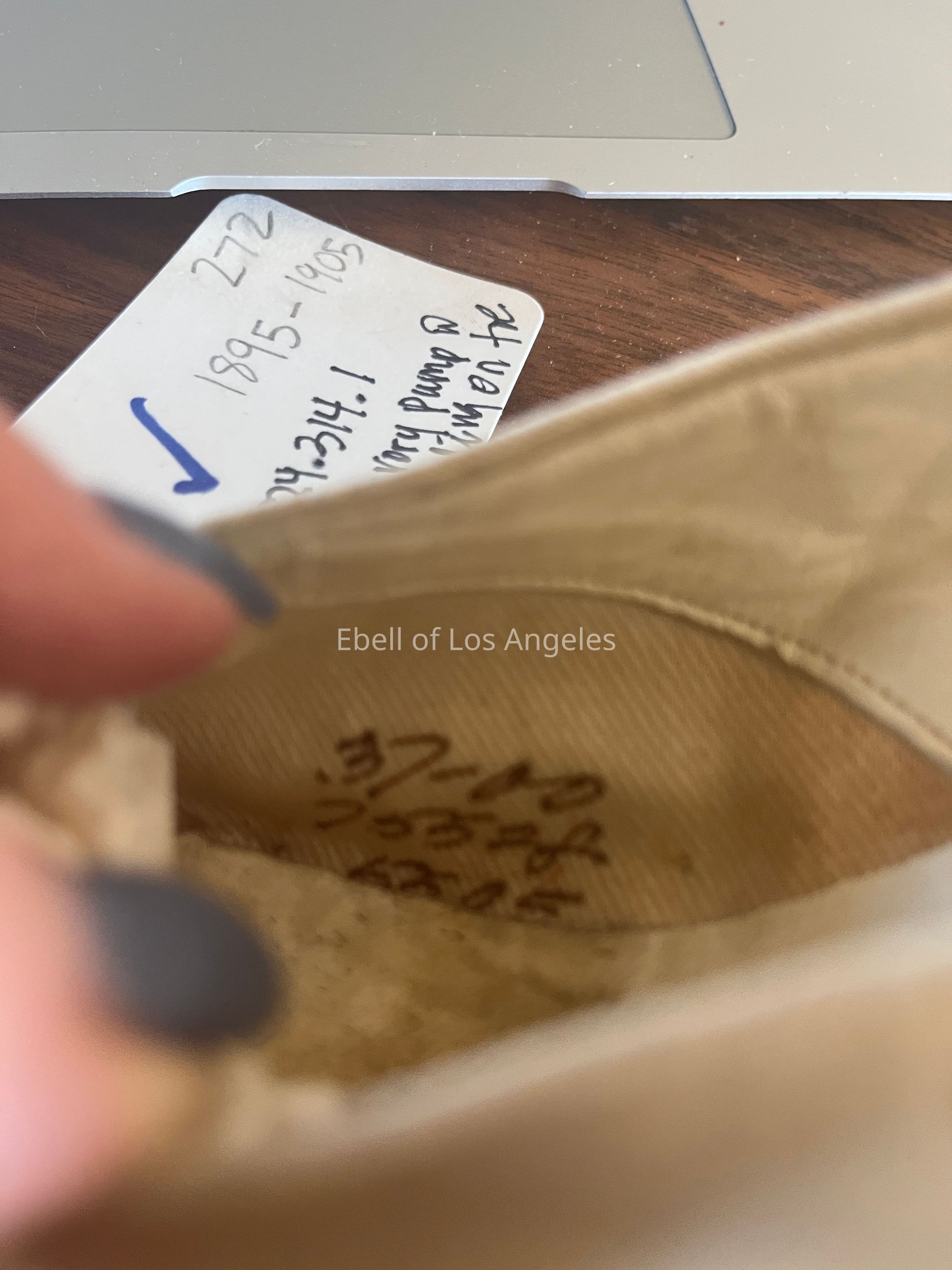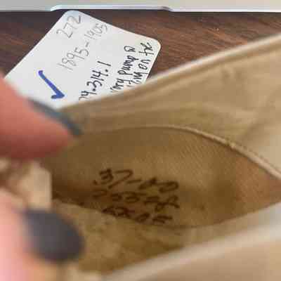 Inner sole, hand written inscription on lower interior arch left shoe, outer inner right shoe