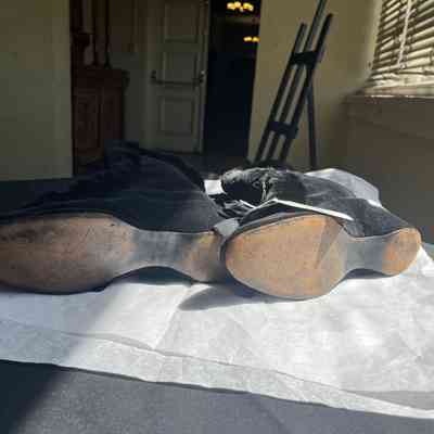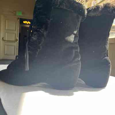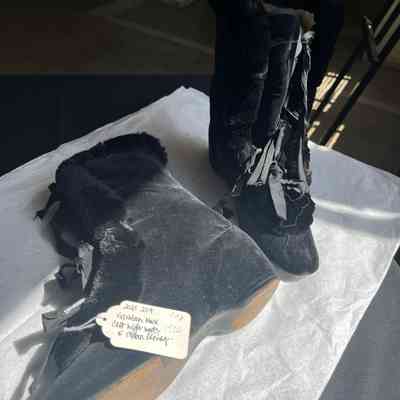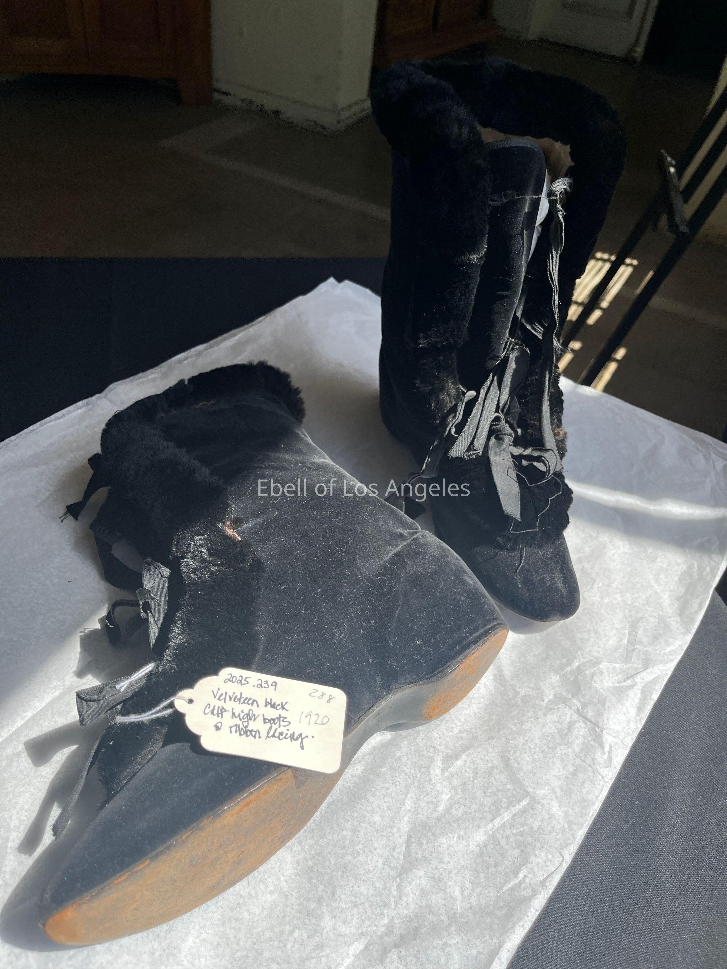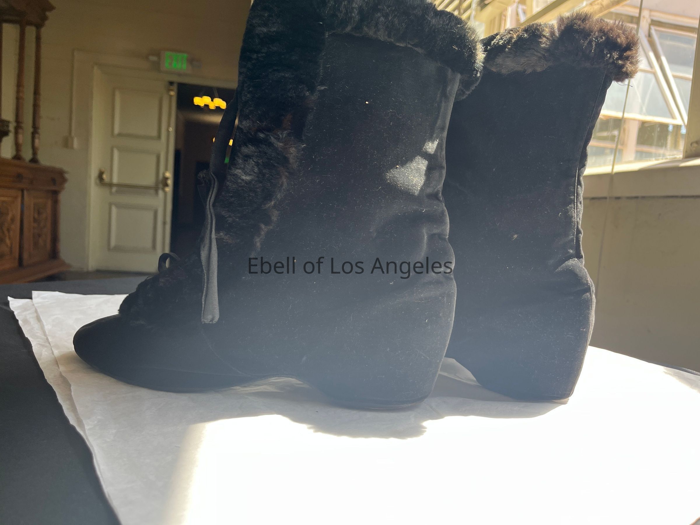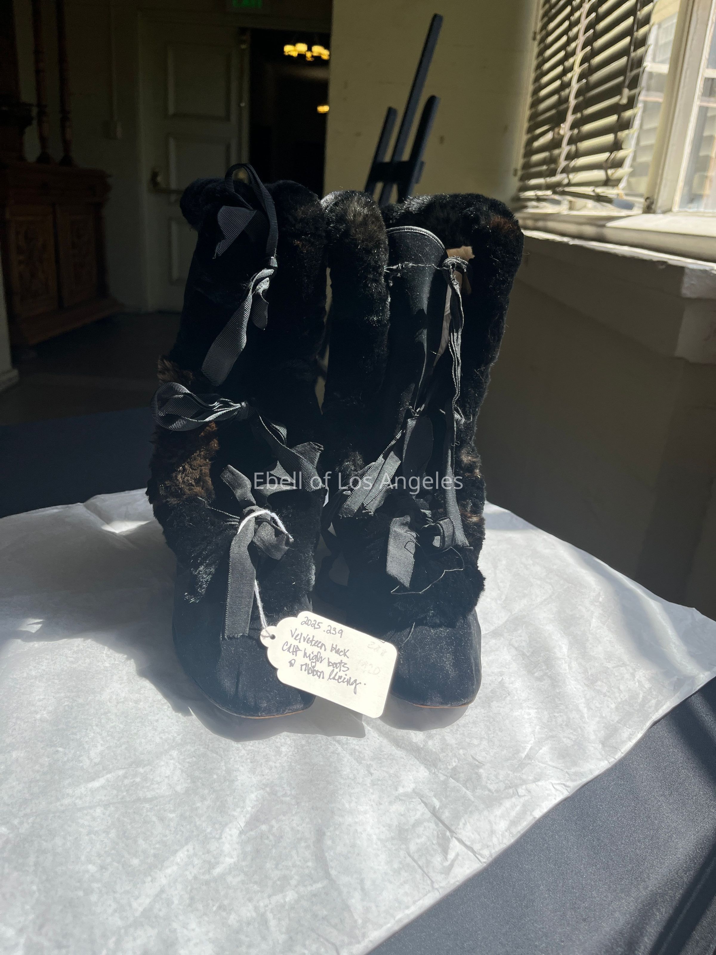Velveteen Black Flat Boots with Ribbon Laces and Faux Fur Trim