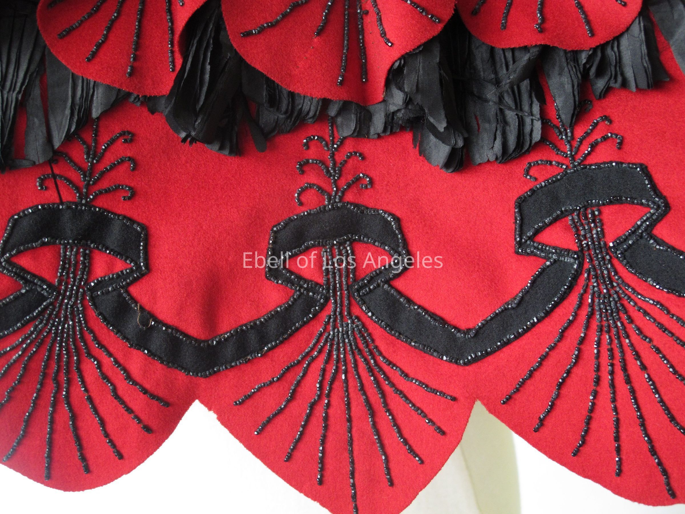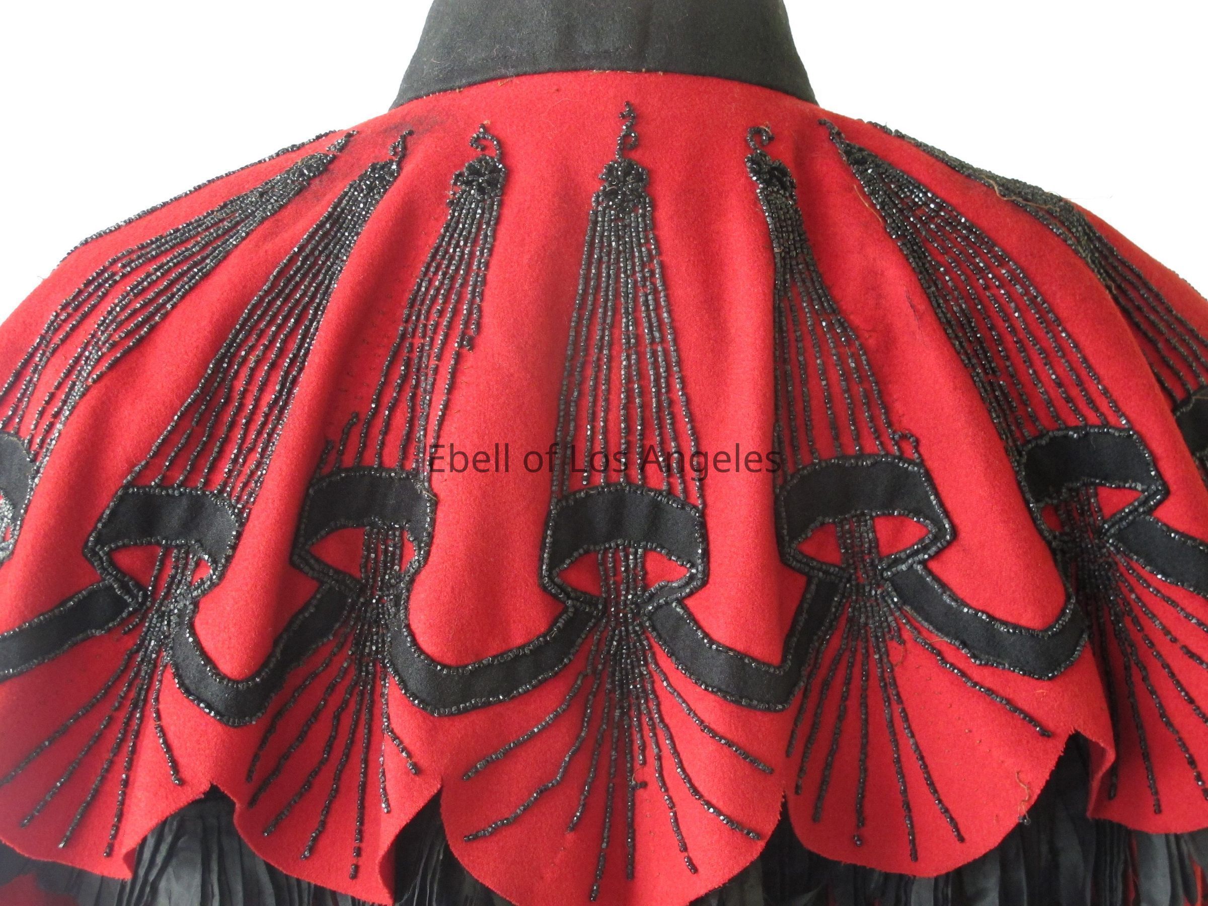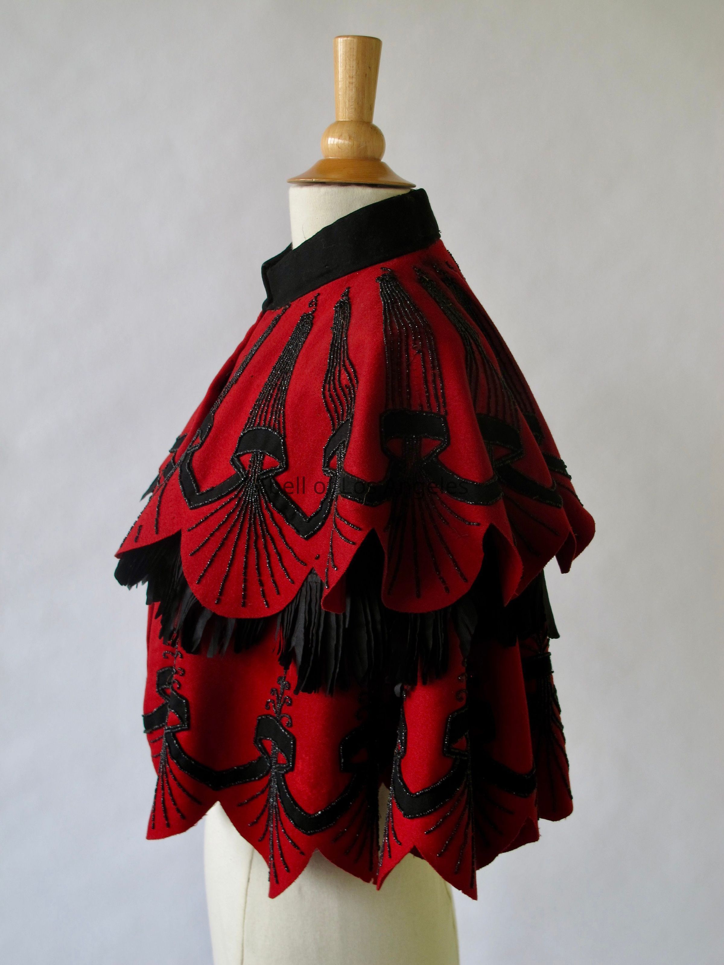 Red scalloped tiered capelet with black beaded and appliqué embellishment and pleated silkEntry/Object ID