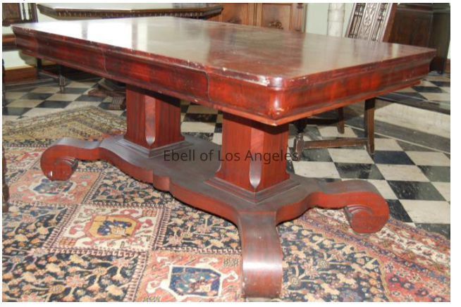 Classical style red mahogany library table. The rectangular top rests on a pair of square pedestals ending on a platform with four scrolled feet.Collection