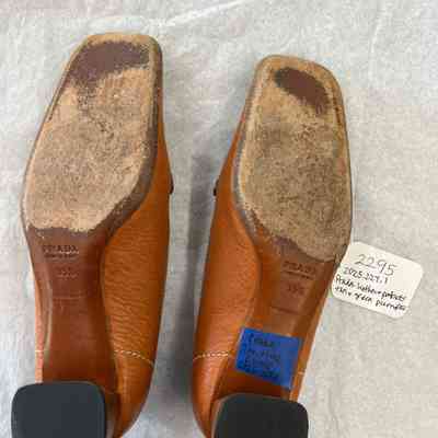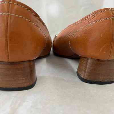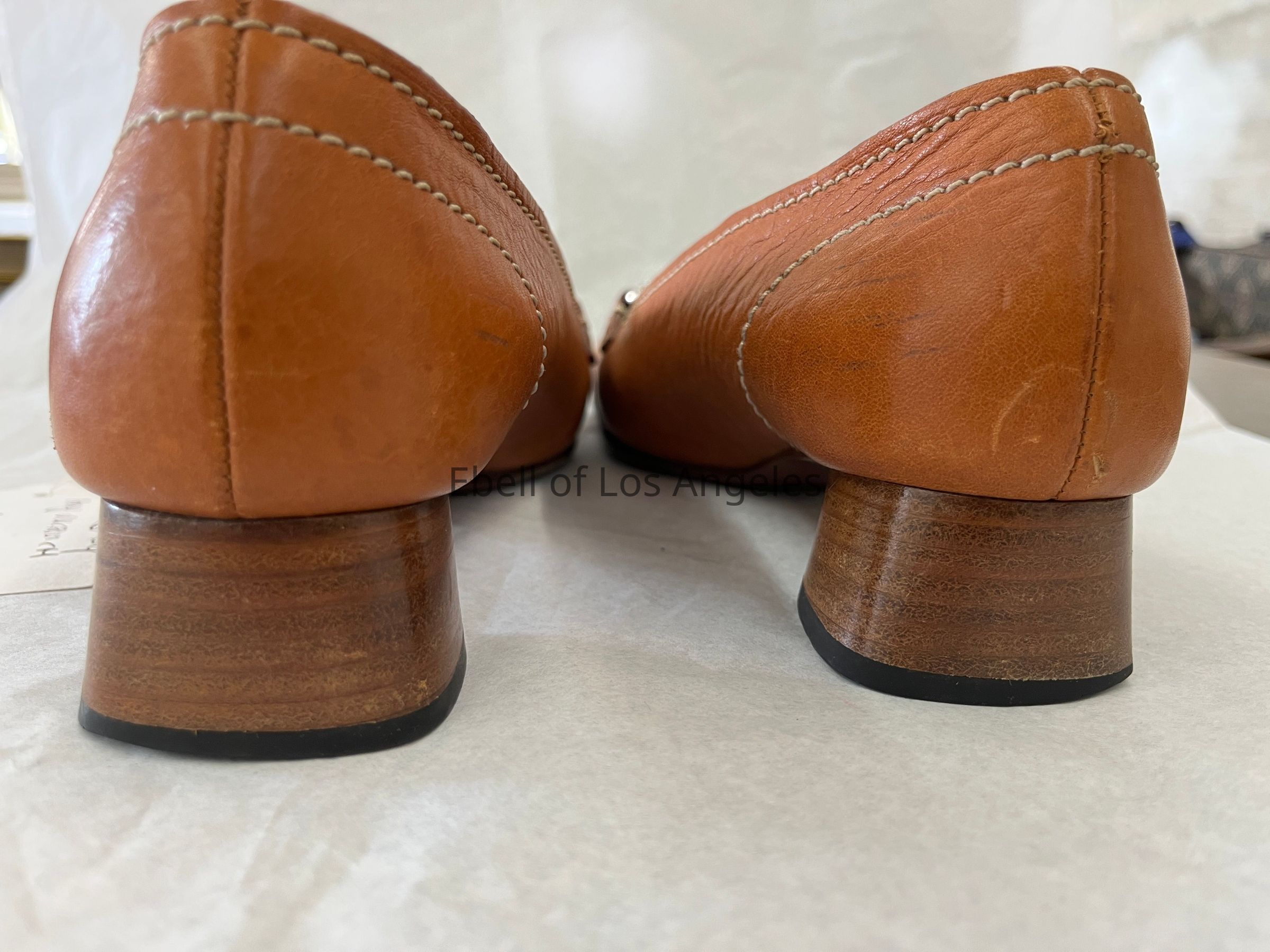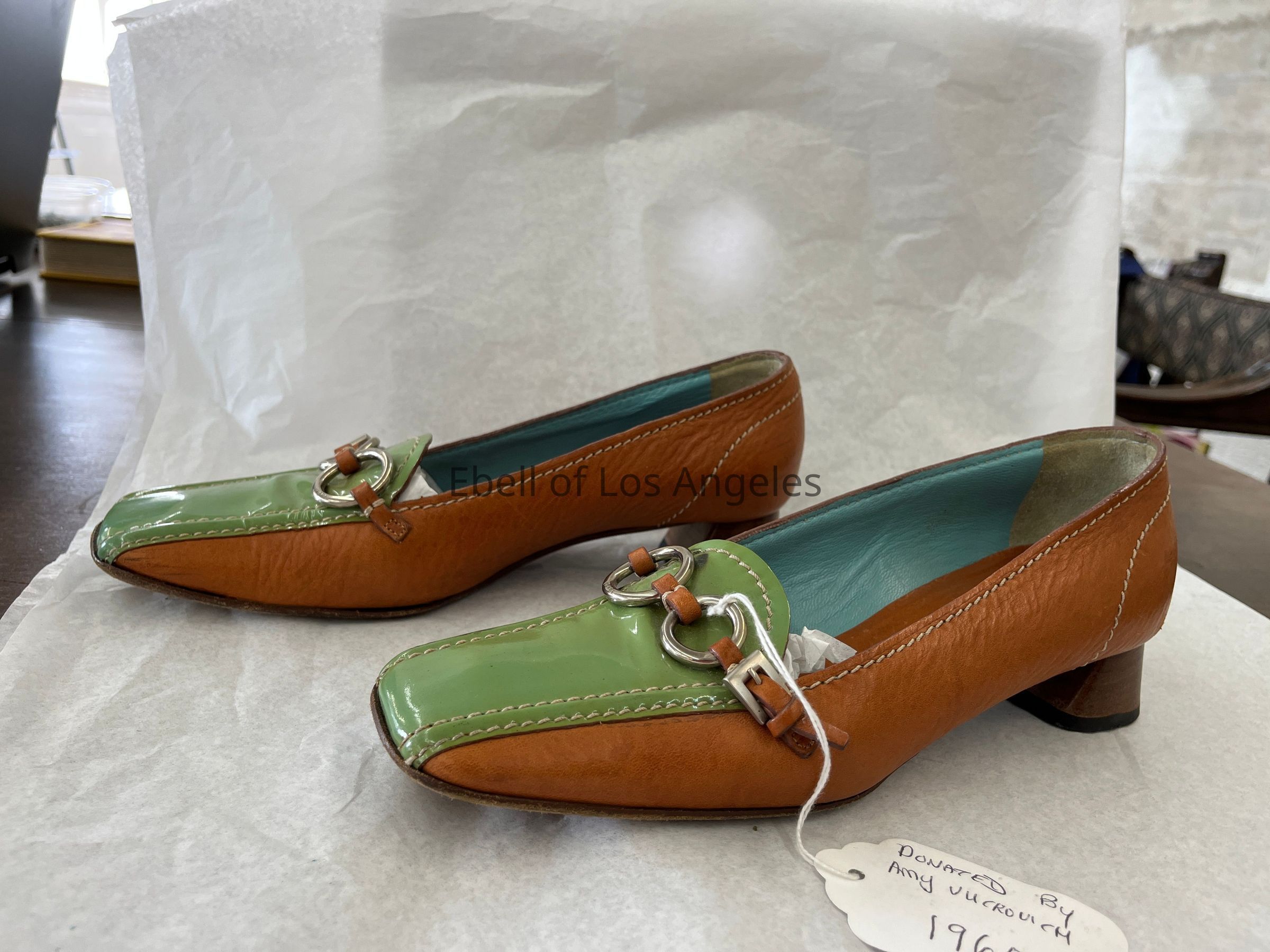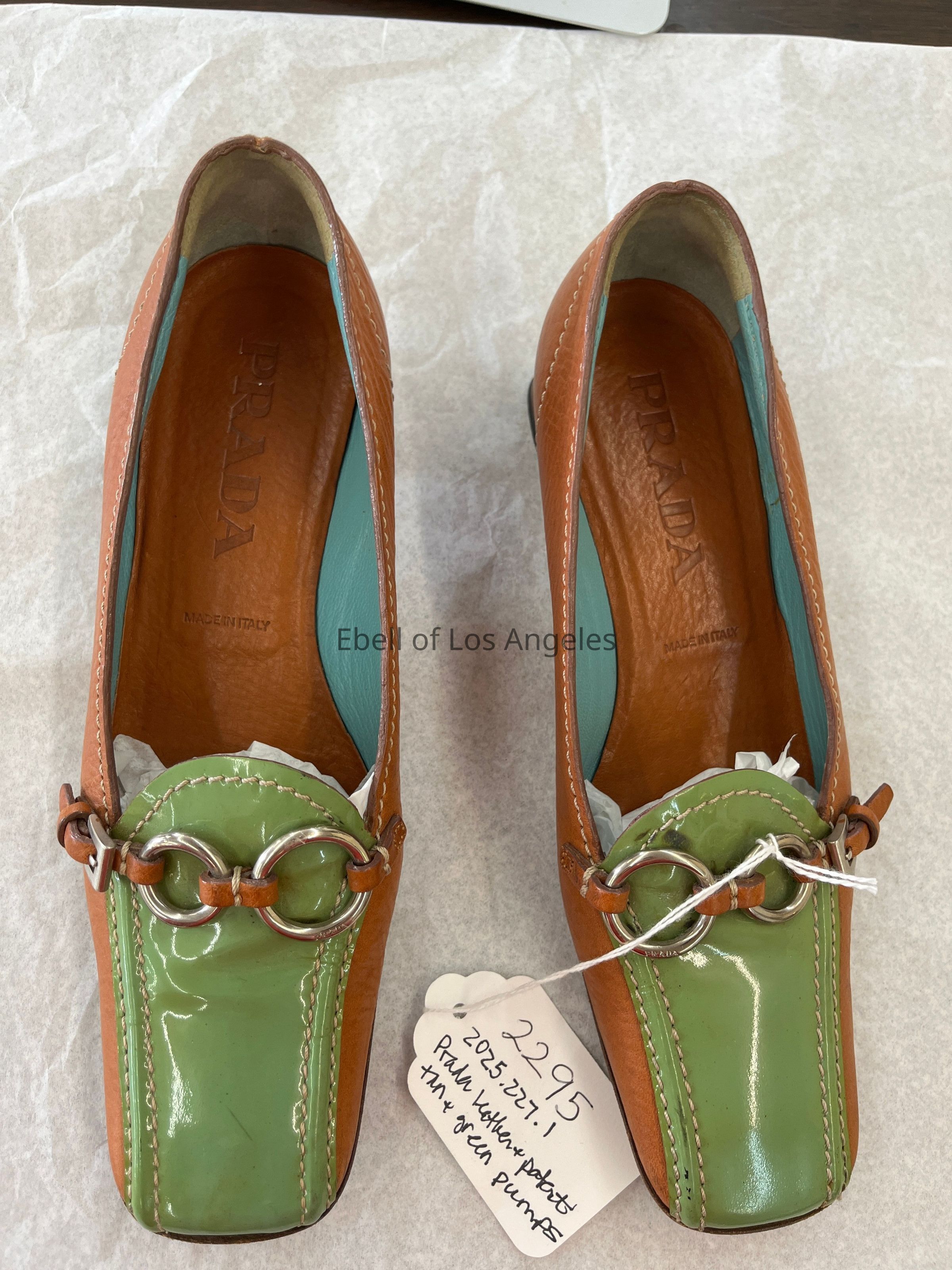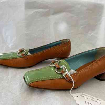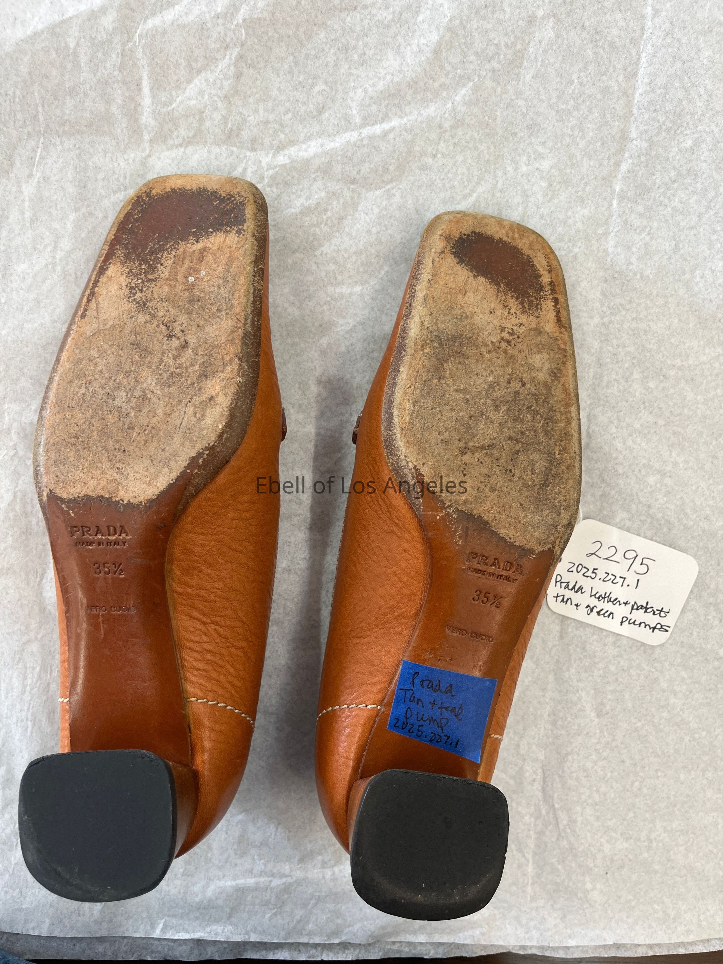 Shoes: Square Toe Tan Leather Pumps with Teal Patent Leather w/ Silver Circle + Buckle AccentsEntry/Object ID