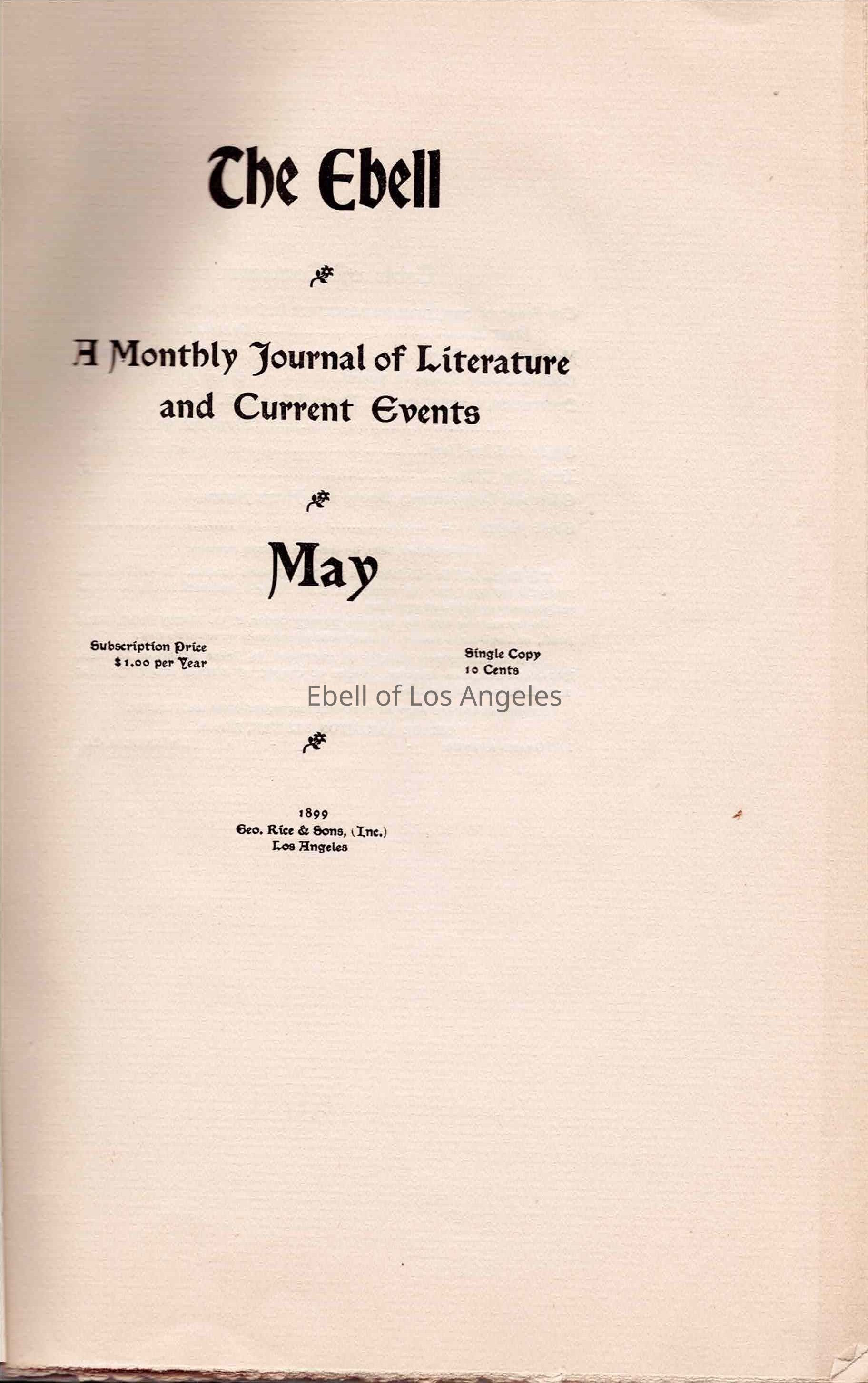 The Ebell: A Monthly Journal of Literature and Current Events, Volume Three, Number One published in May 1899. The journal contains poetry, fiction, and essays. Regular sections include "It is like this" and Ebell Notes." Photos and illustrations accompany some of the sections. Front and back pages contain advertisements.Collection