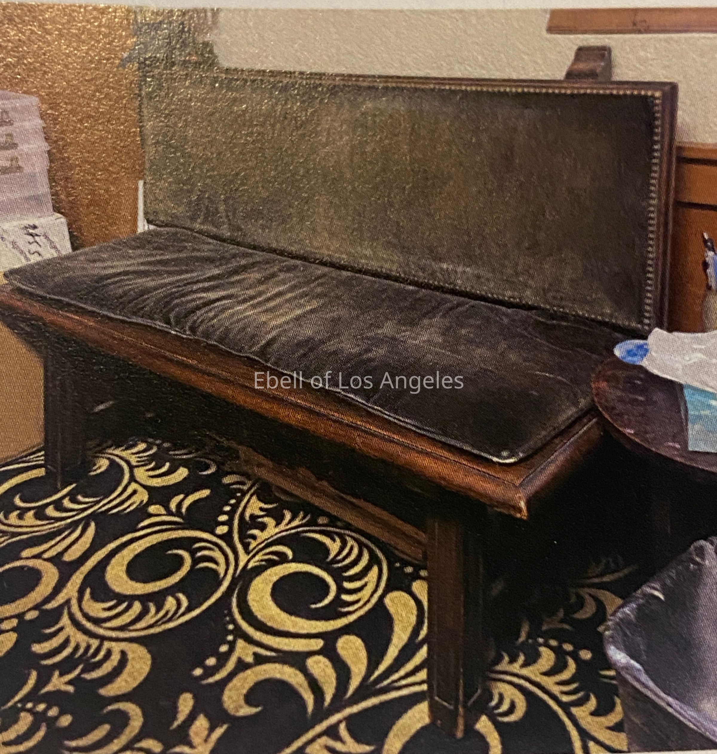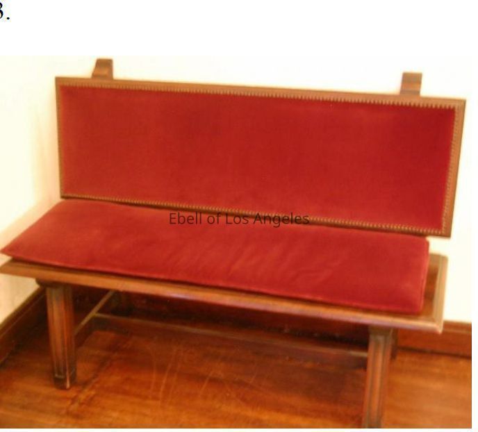 Traditional style walnut bench with fluted legs and plank seat. Fitted upholstered back with nail head detailing and loose cushion seat in red velvet. Flared legs are joined with a scalloped stretcher bar. There are four of these benches.Collection