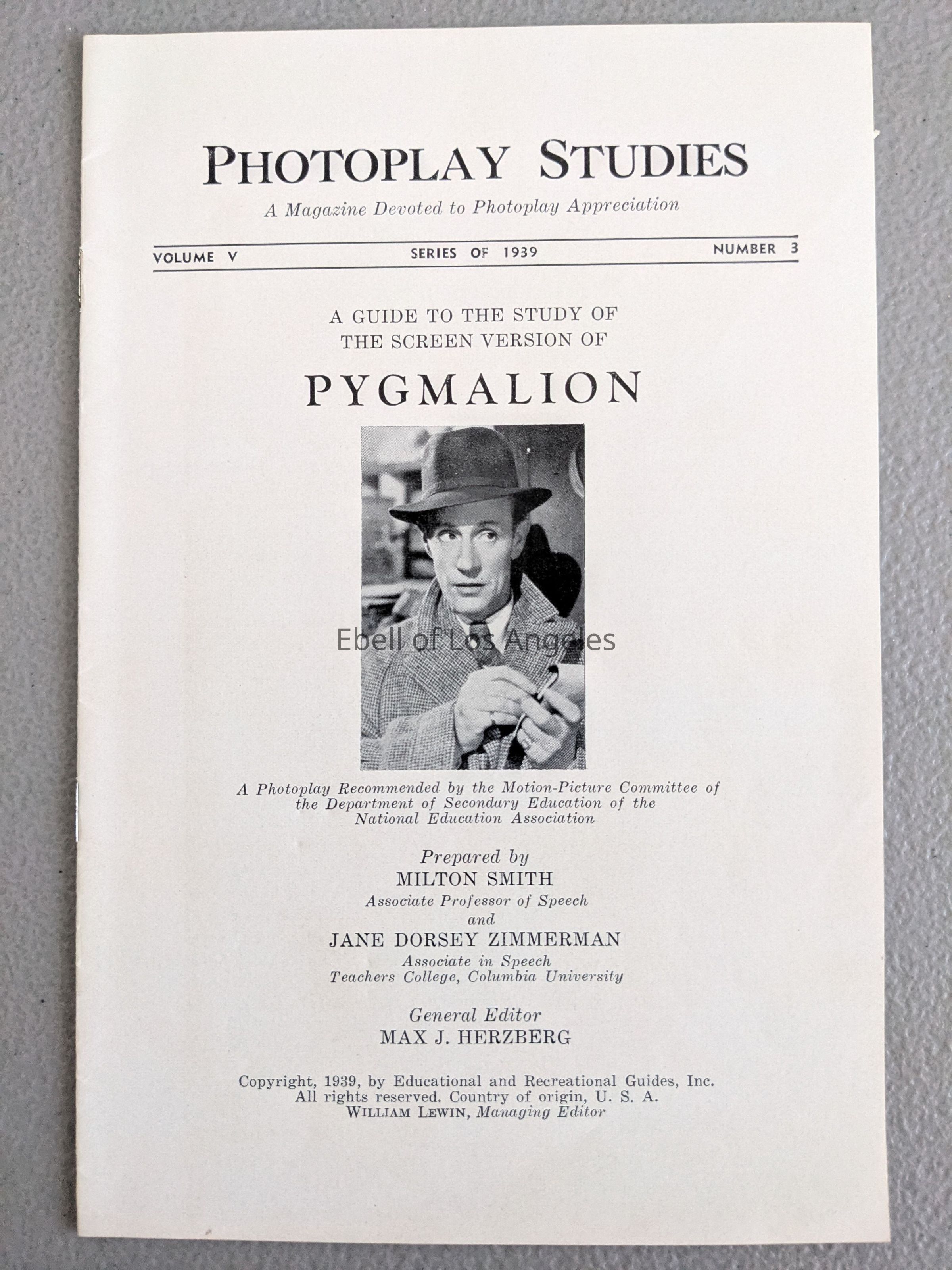 Cinematography minutes. 1 book with handwritten notes and an issue of Photoplay Studies: A Magazine Devoted to Photoplay Appreciation, Volume V, Number 3, Series of 1939. A Guide to the Study of the Screen Version of Pygmalion.Container