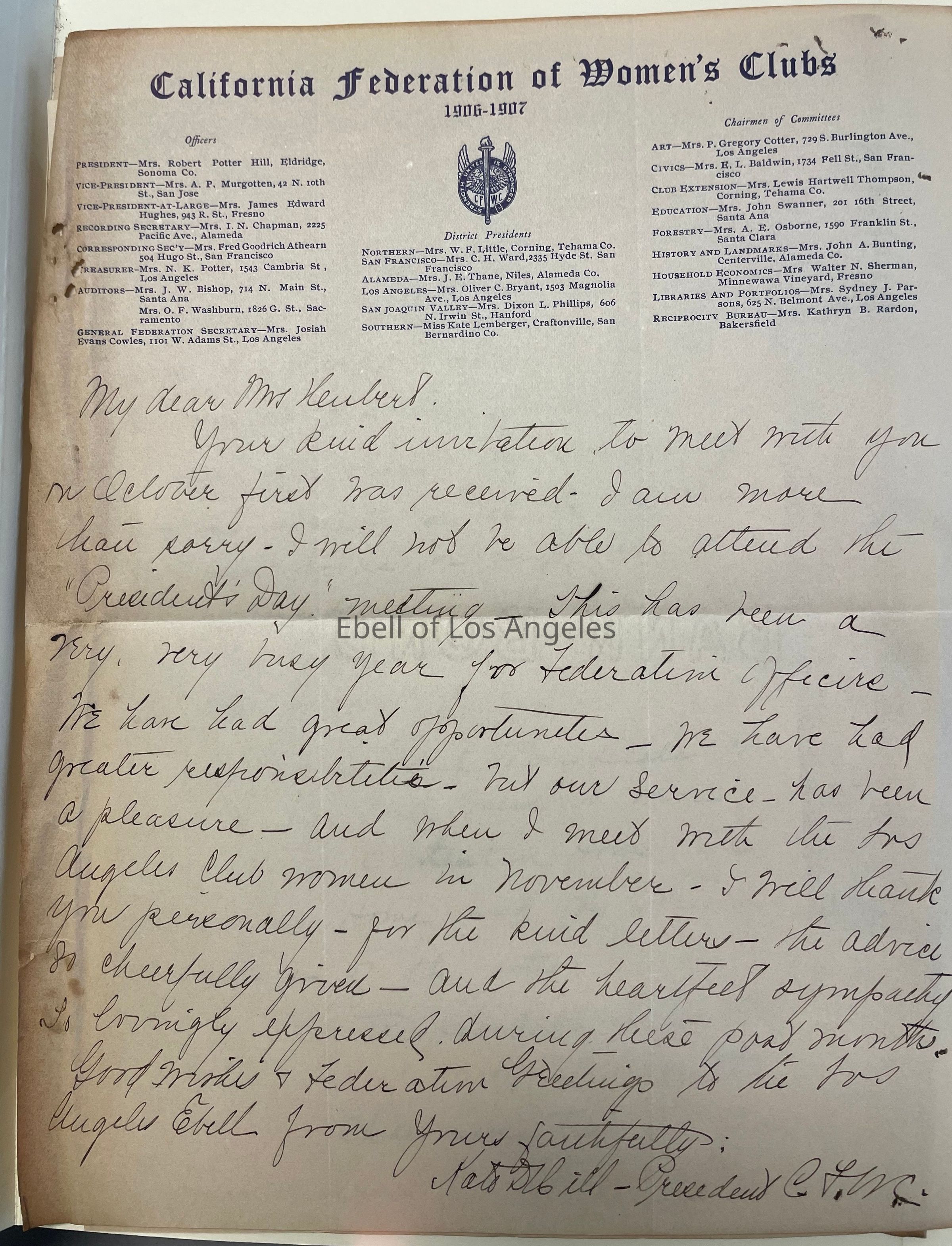 Monday Afternoon Correspondence. 3 letters from the California Federation of Women's Clubs and Traveling Library Committee Chairman M. L. Orcutt [?], a tally of correspondence from the corresponding secretary.Date(s) of Creation