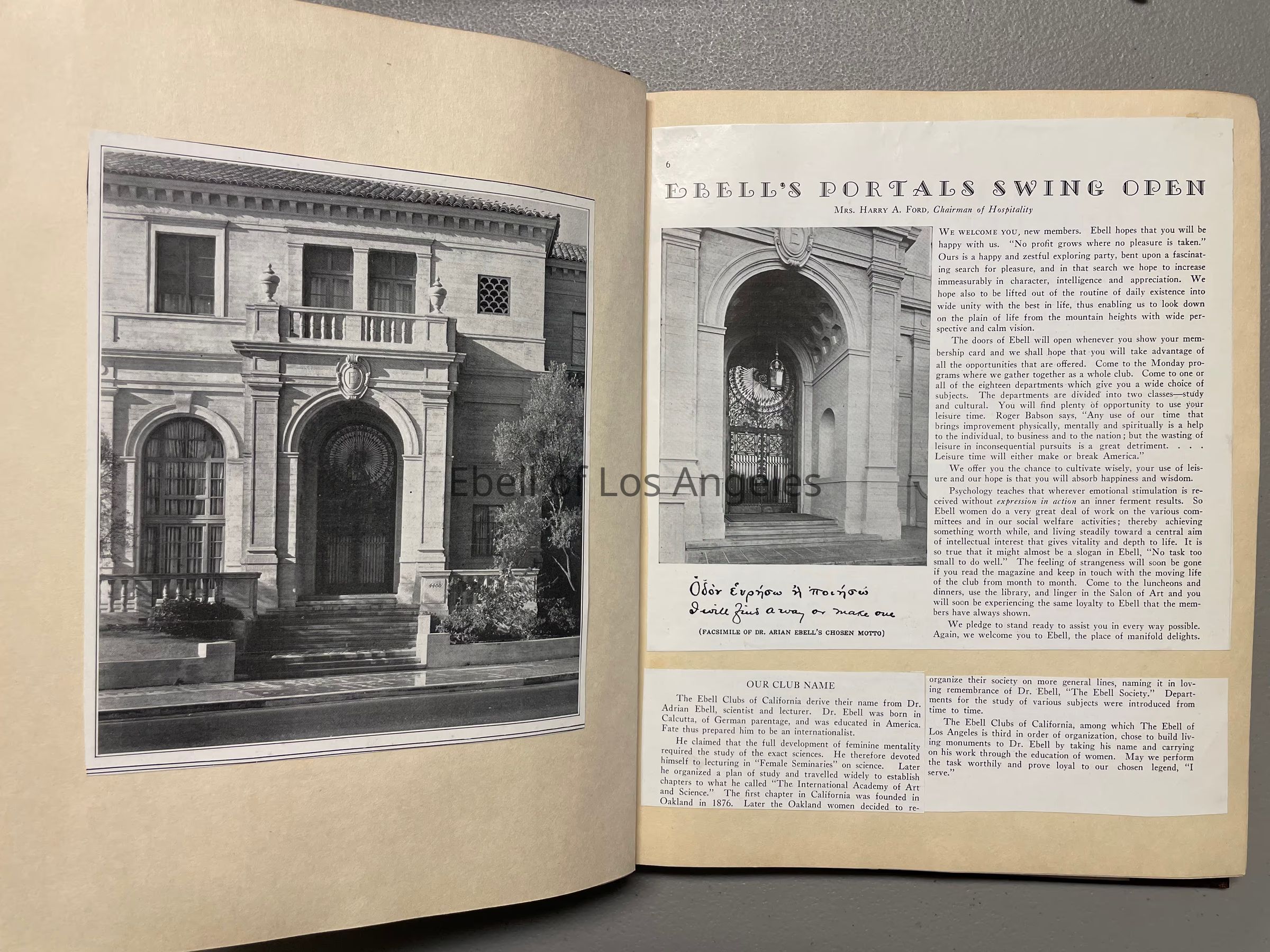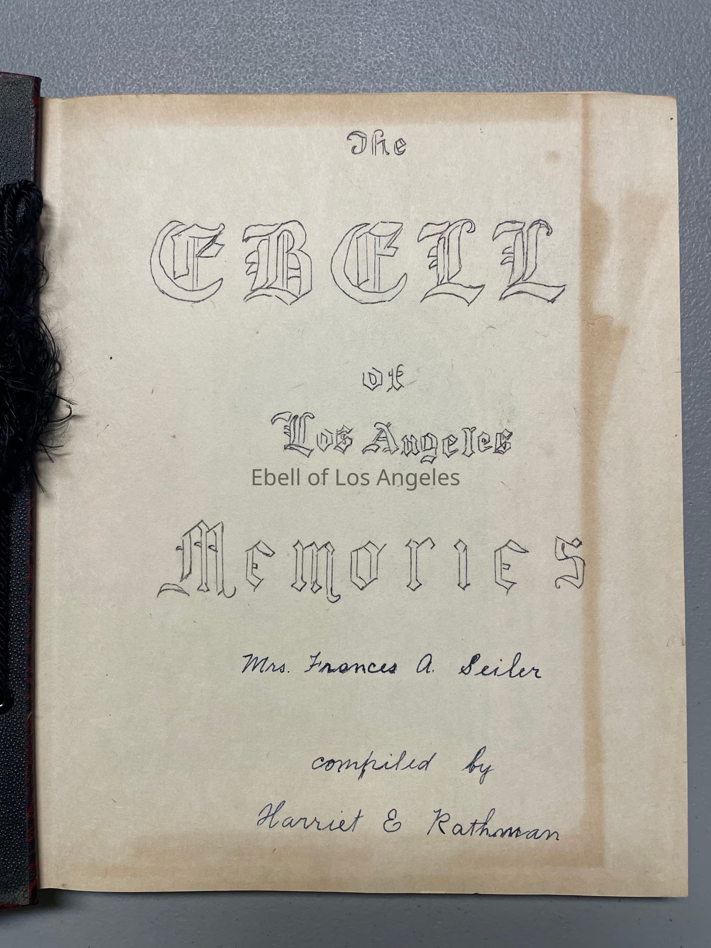 Dedication page reads: The Ebell of Los Angeles Memories. Mrs. Frances A. Seiler [?]. Compiled by Harriet E. Rathman.Collection
